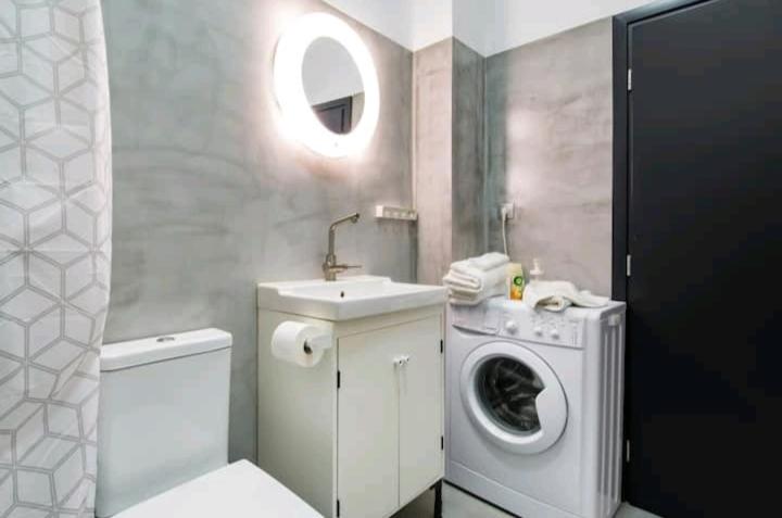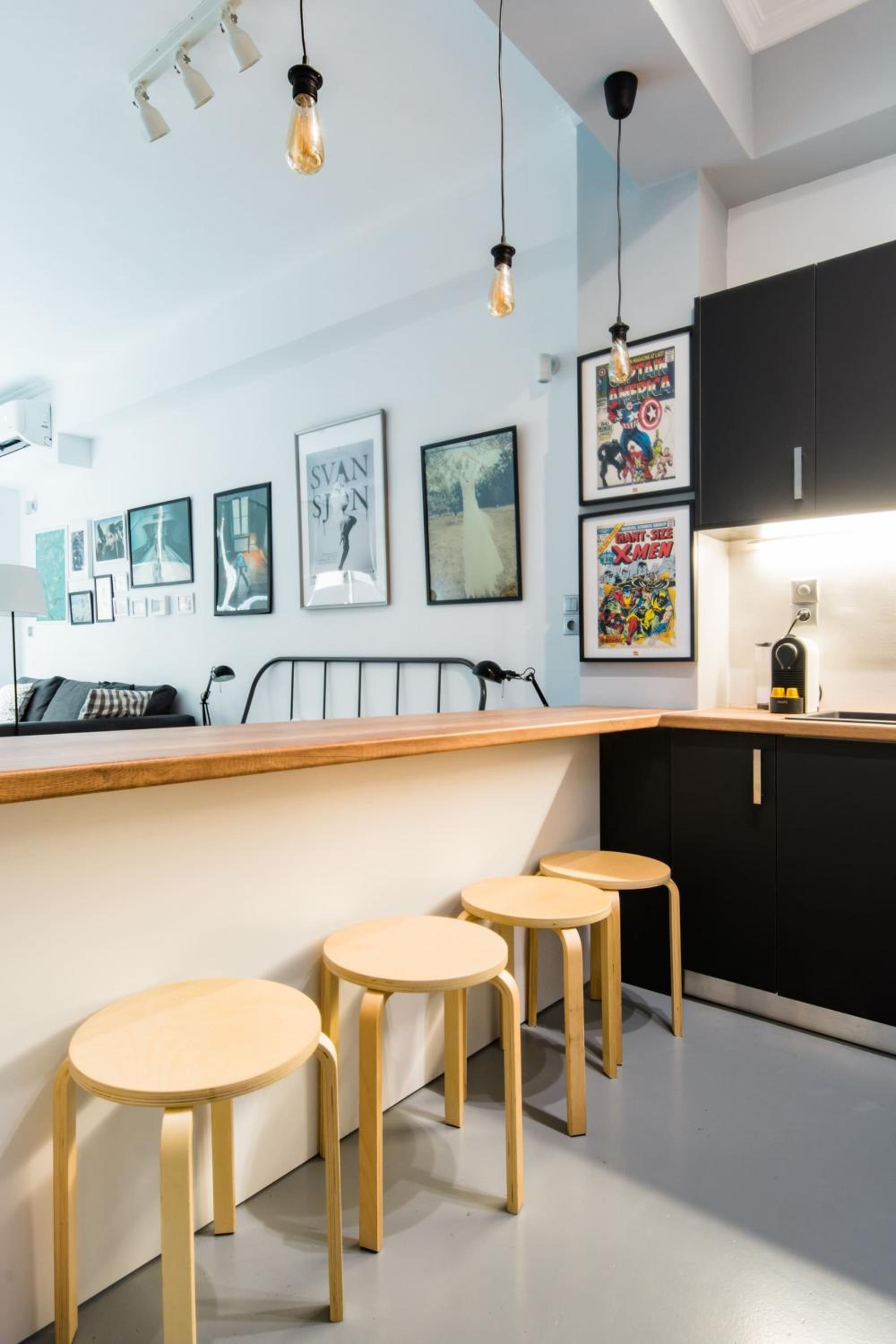 Convenient Amenities: This hip studio flat offers air conditioning, a flat-screen TV, a well-equipped kitchen, and a private bathroom with luxurious slippers and a hairdryer. Guests can also enjoy complimentary wine or champagne during their stay.