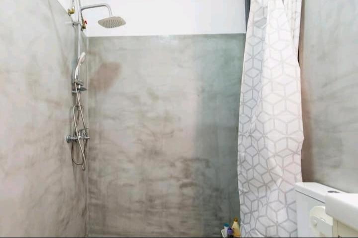 -Wybetonowany prysznic z dość nierówną podłogą, co sprawia, że woda dobrze nie odpływa, tworząc kałużę.