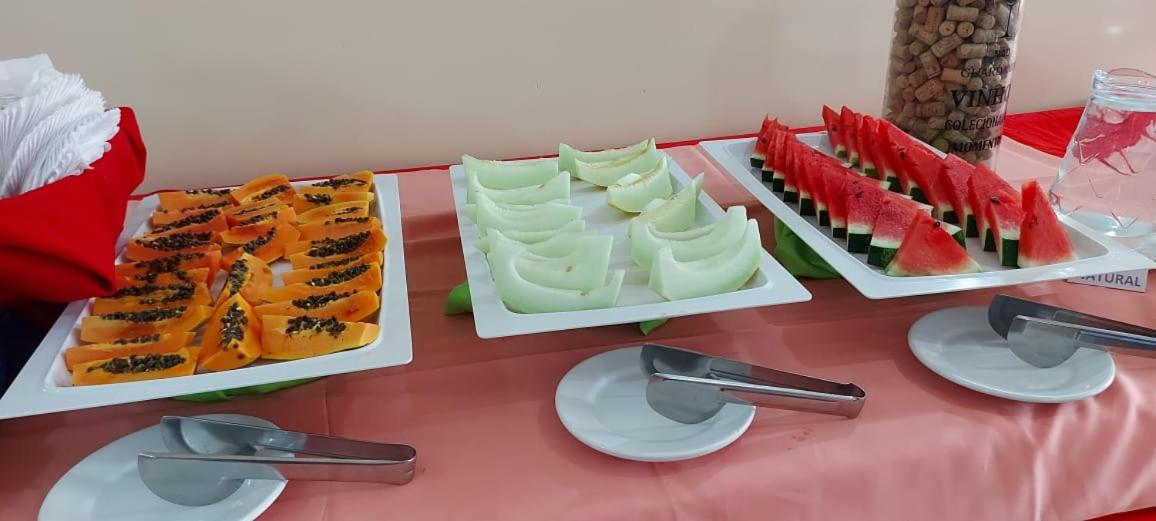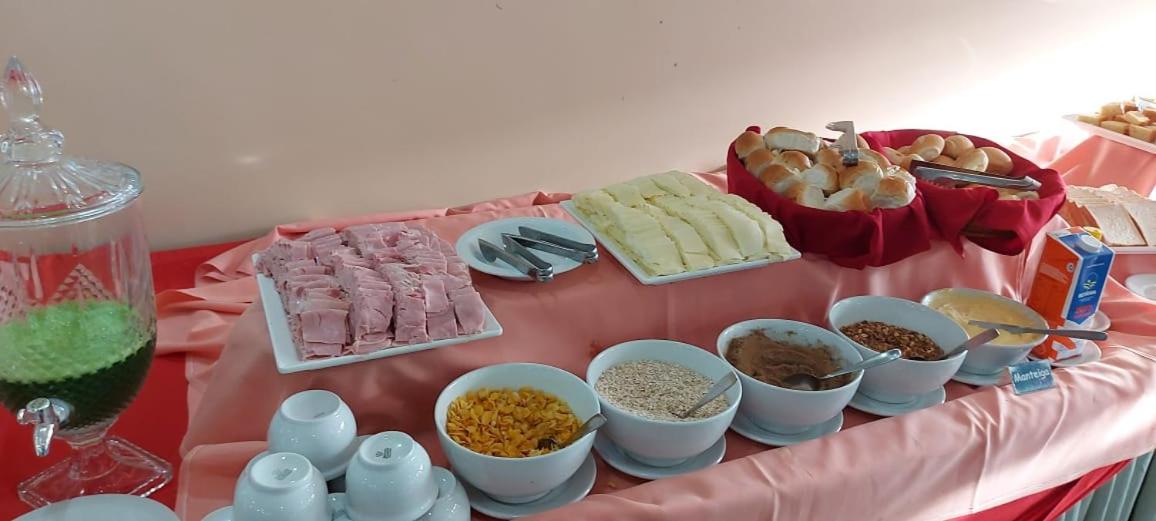 manhã básico mas suficiente, com pães, frutas, sucos, ovos mexidos, frios, bolo. Enfim, básico mas bem servido e tudo limpinho.