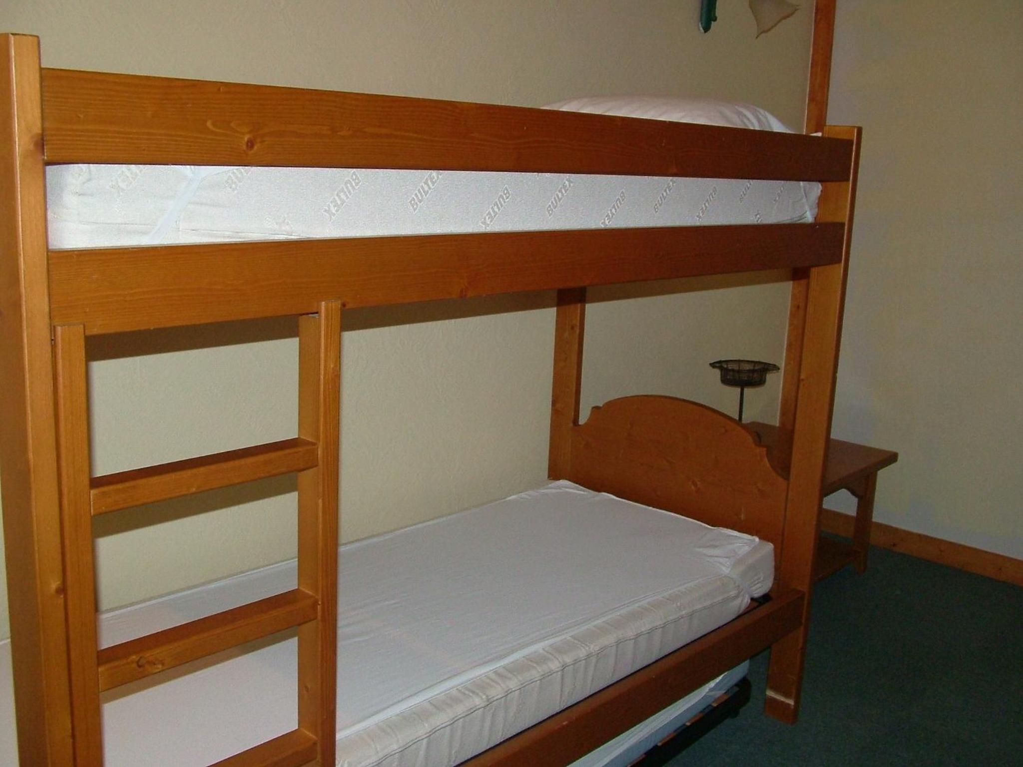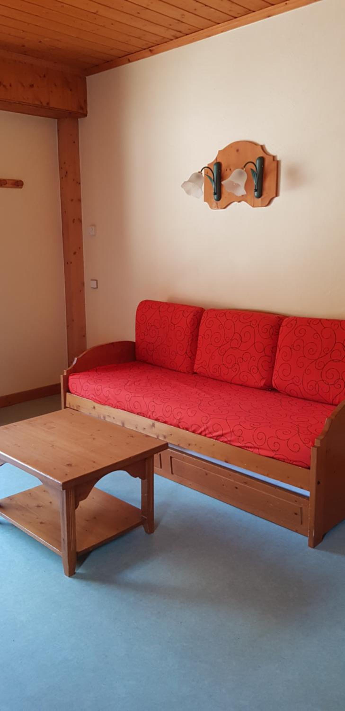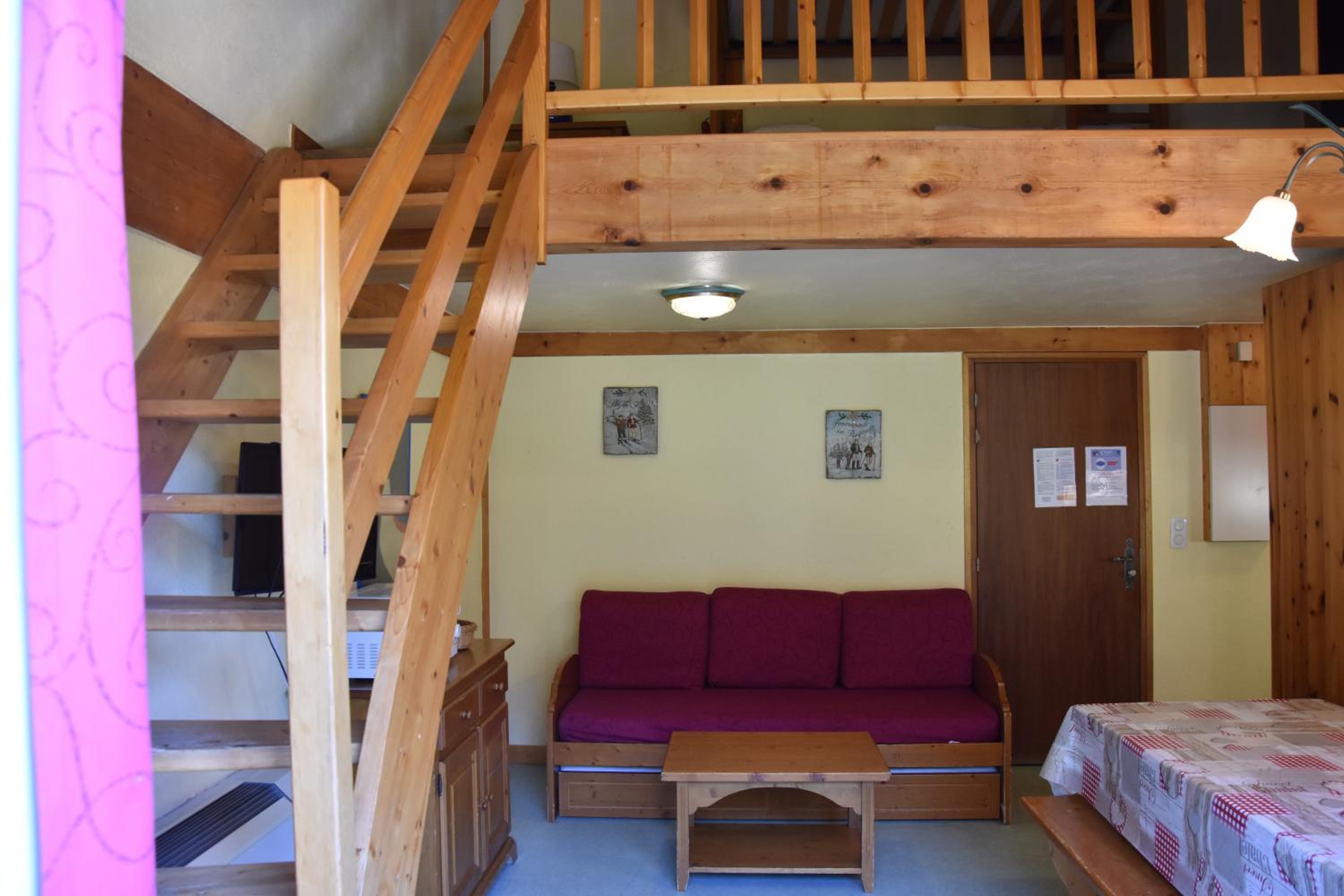 le canapé lit ( 2 personnes ) présenté comme se trouvant dans la pièce de vie avait été remplacé par 2 lits superposés placés dans le couloir d'accès de la chambre en direct / haut de l'escalier .