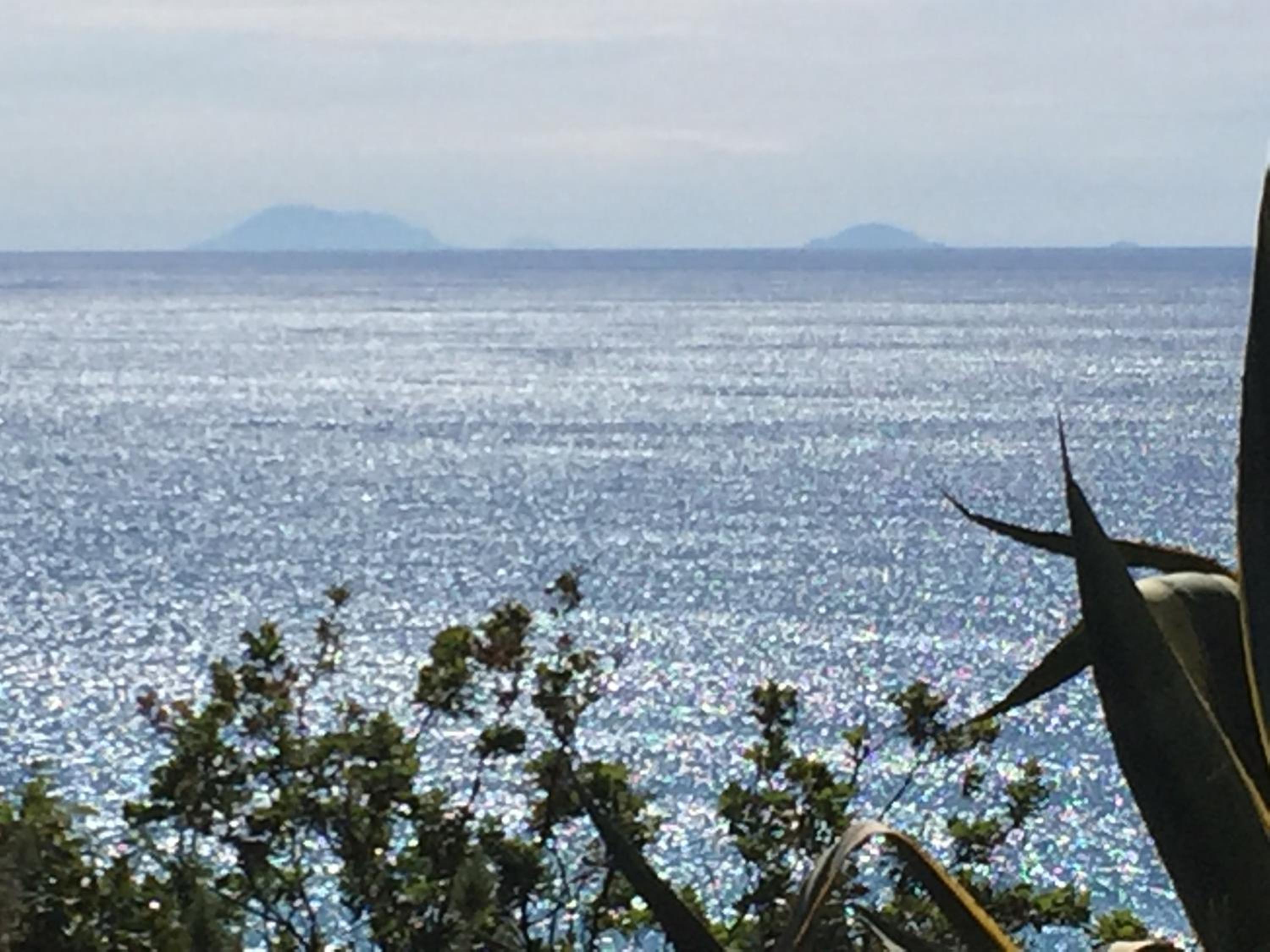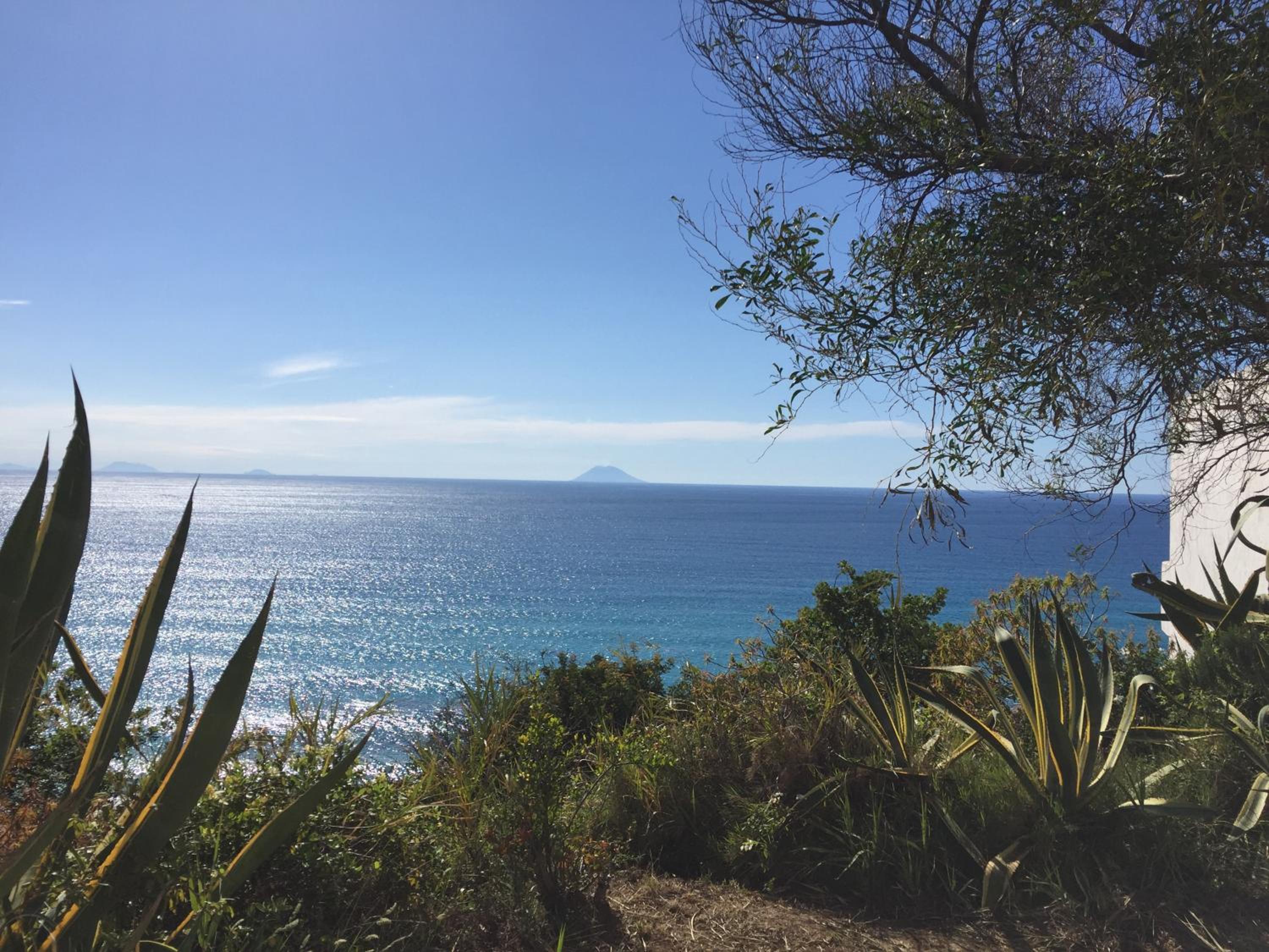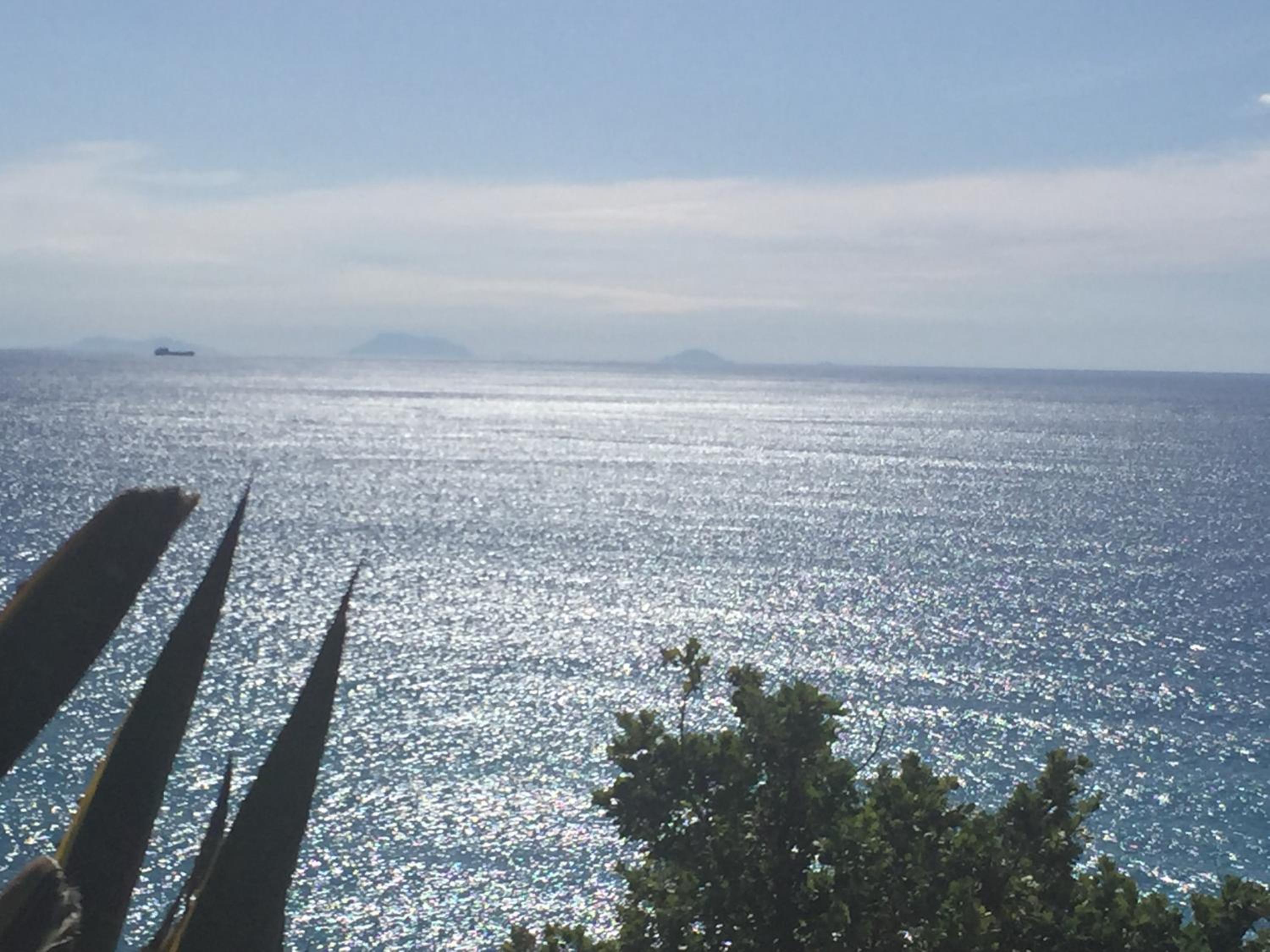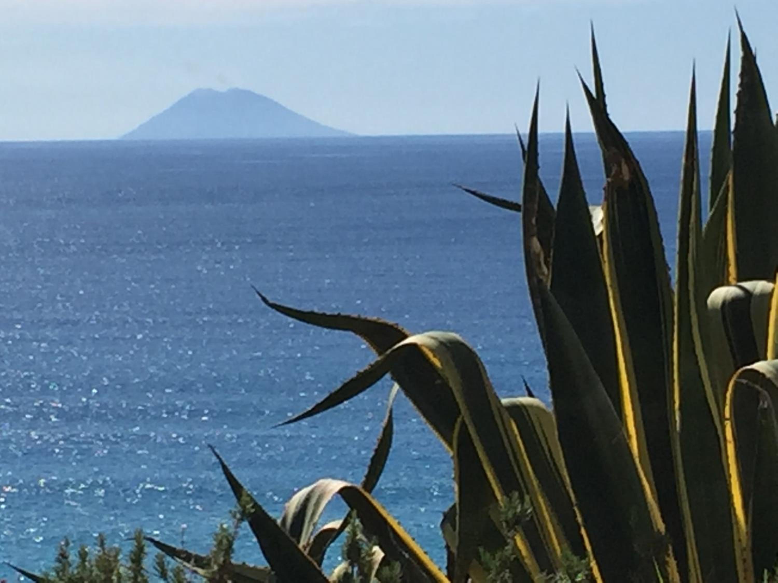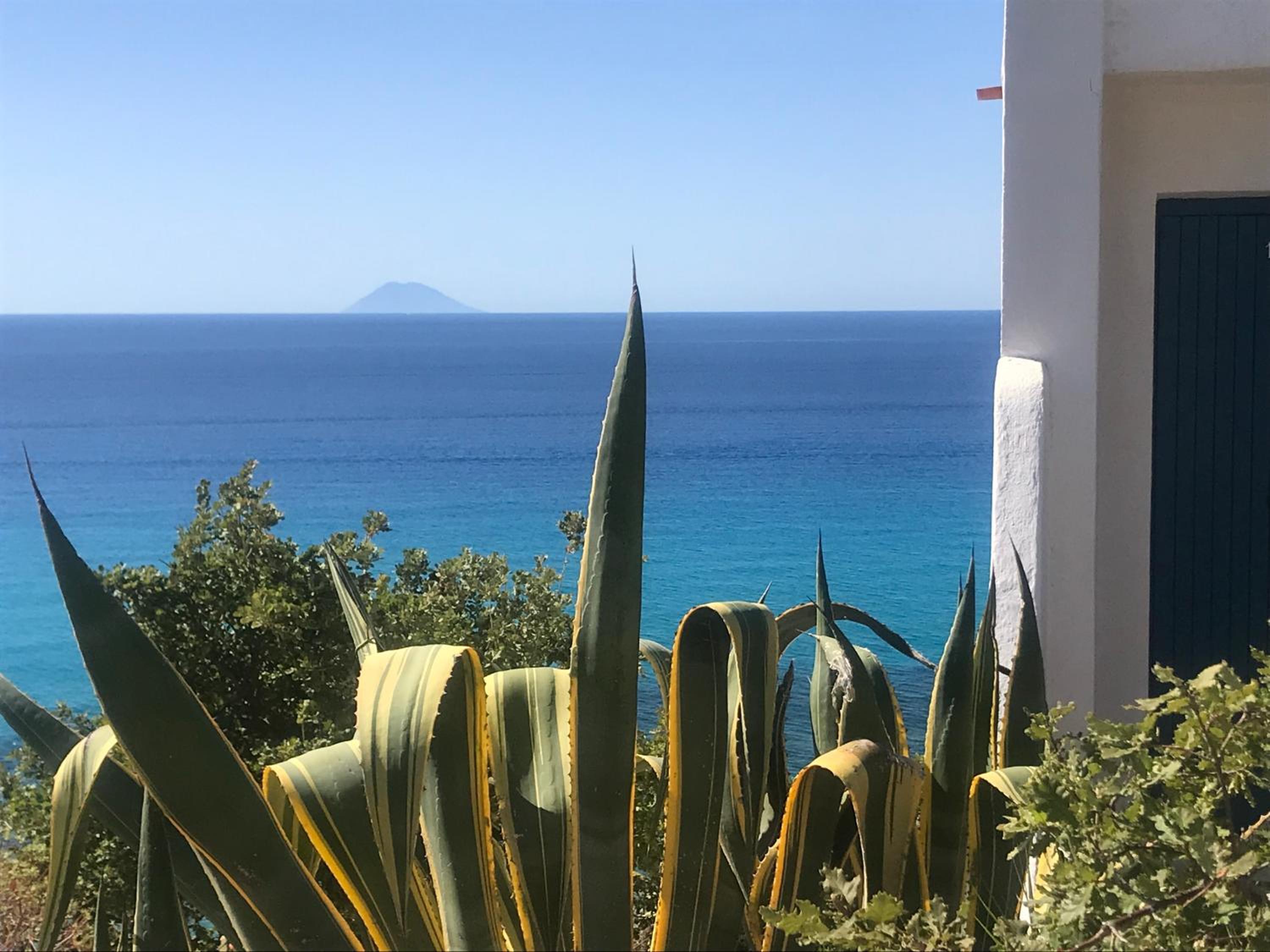 Vista mare spettacolare con lo Stromboli in lontananza, spiaggia e mare fantastico.