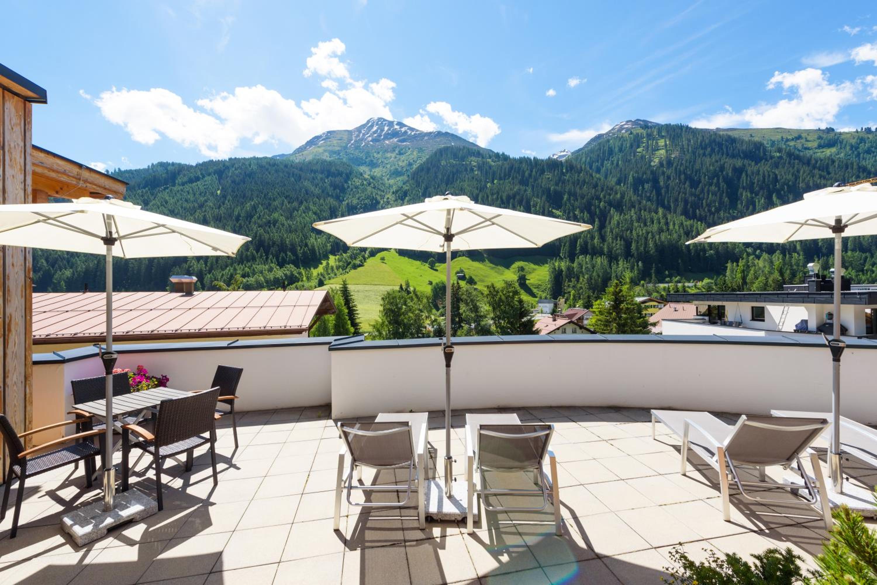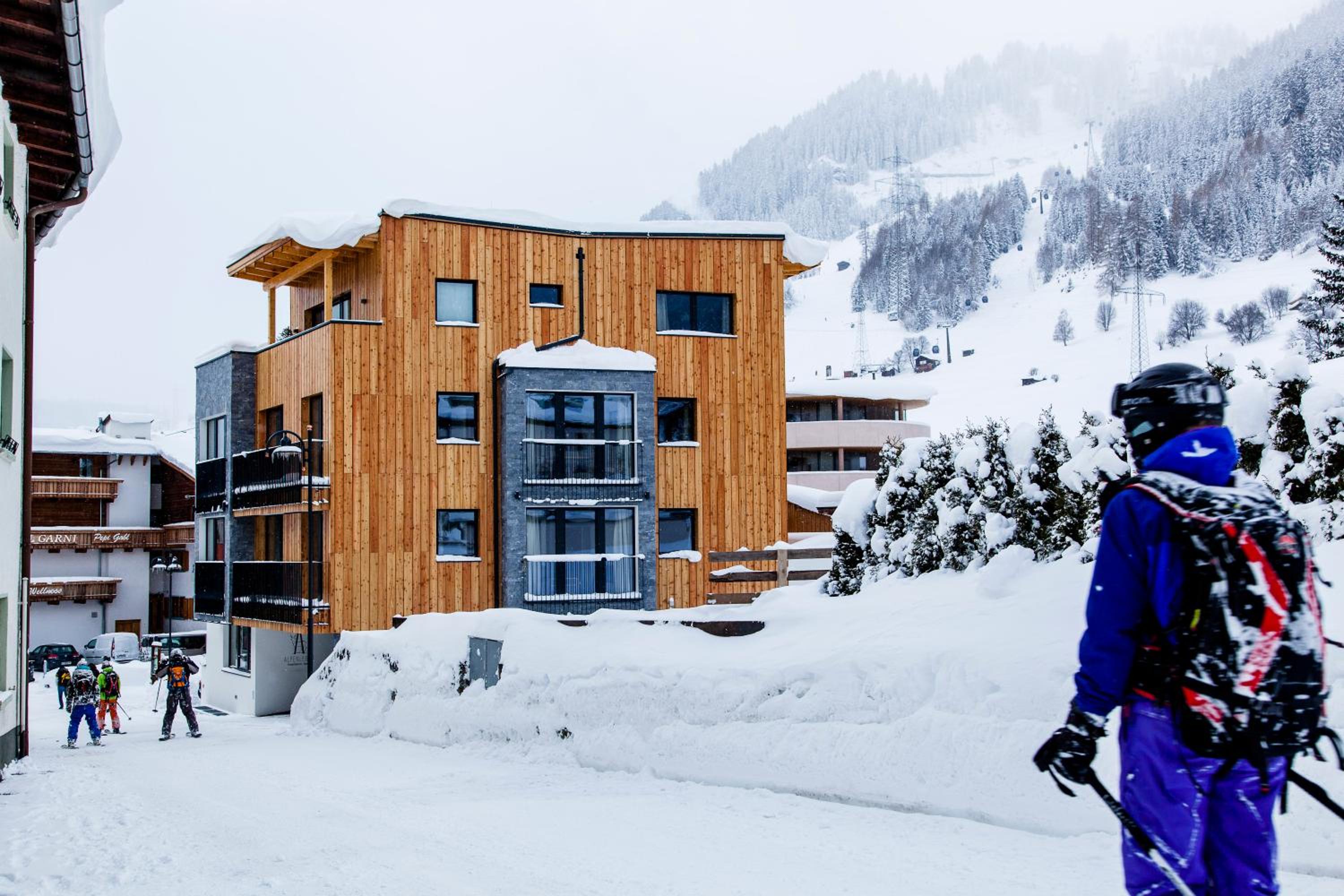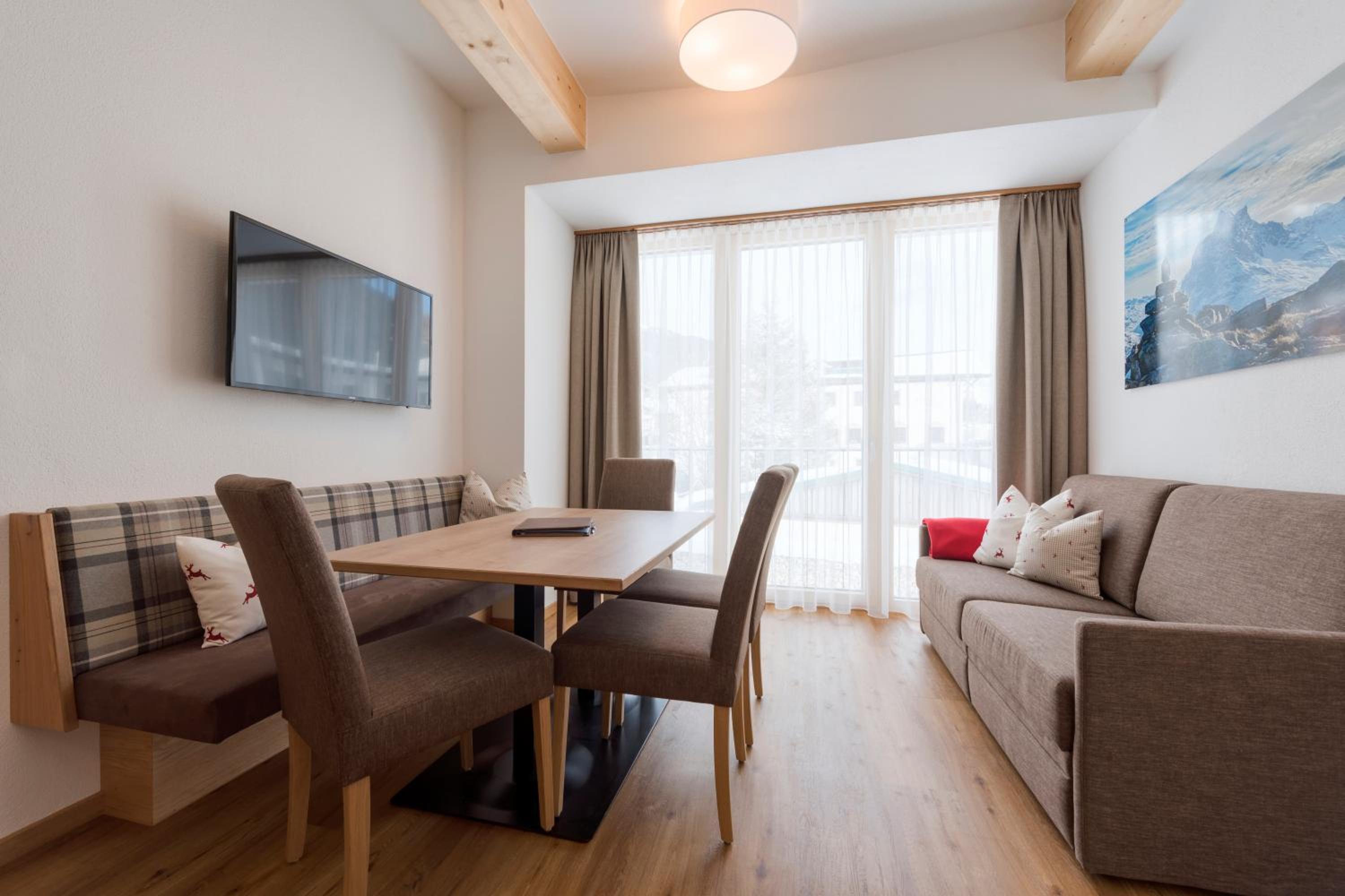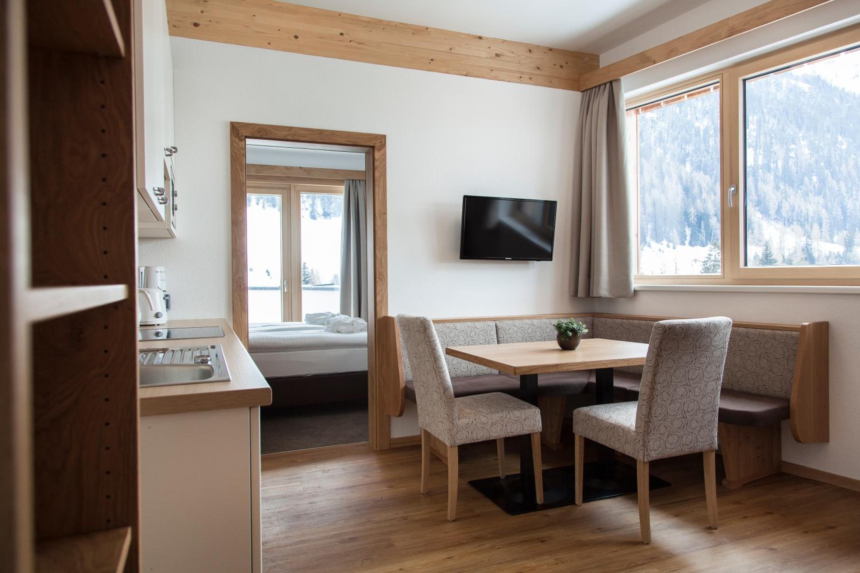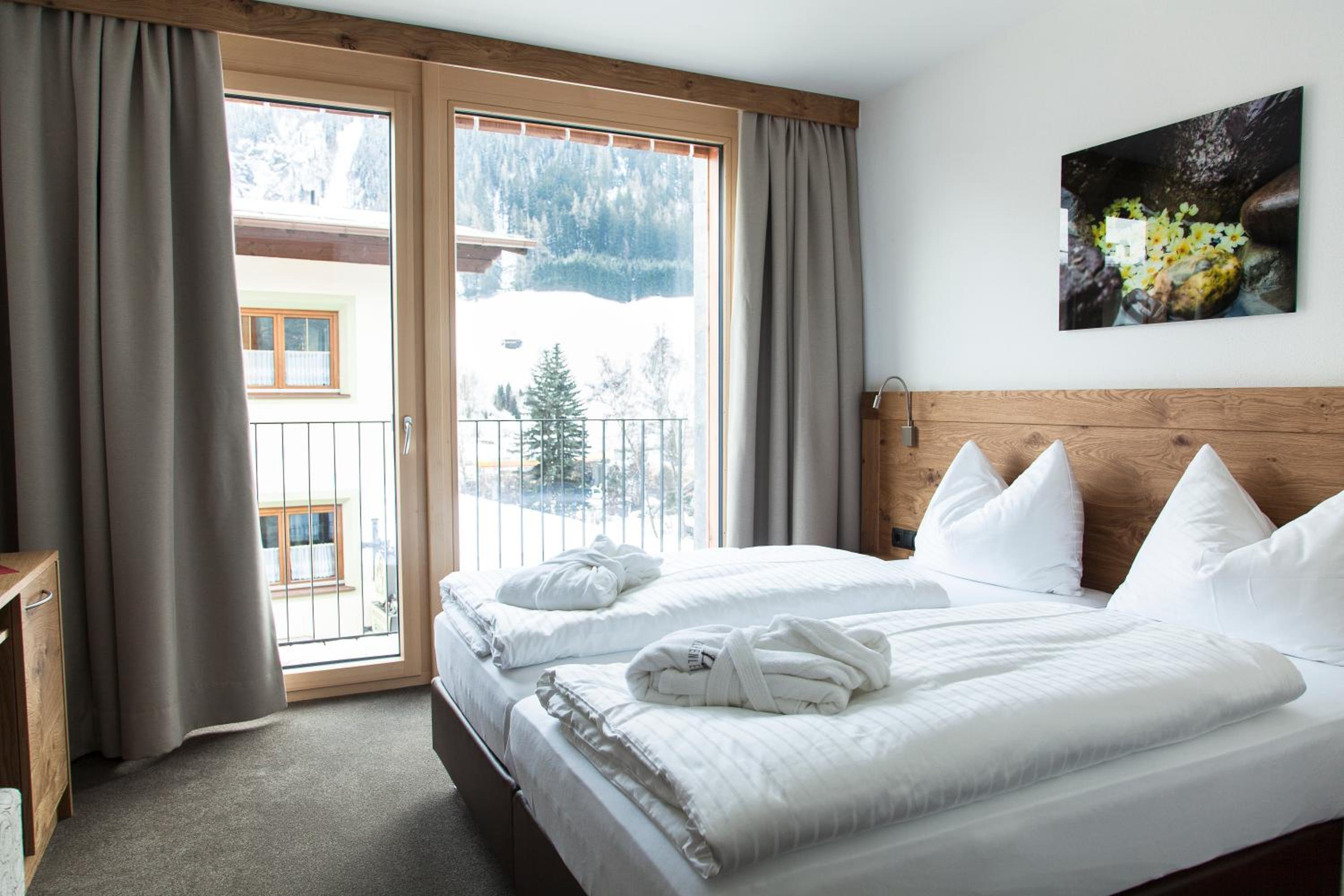 We stayed in a very nice 2 bedroom apartment. Fantastic location few steps from Nasserein gondola which gives easy access to all st Anton ski fields. Plenty of bars and restaurants nearby then short flat walk in to main part of town. Wonderful staff, and very well thought out and run hotel. Lovely sauna area, great ski/boot room, communal hotel area to socialise. Our apartment had well equipped kitchen, large bathrooms, super comfy beds.
