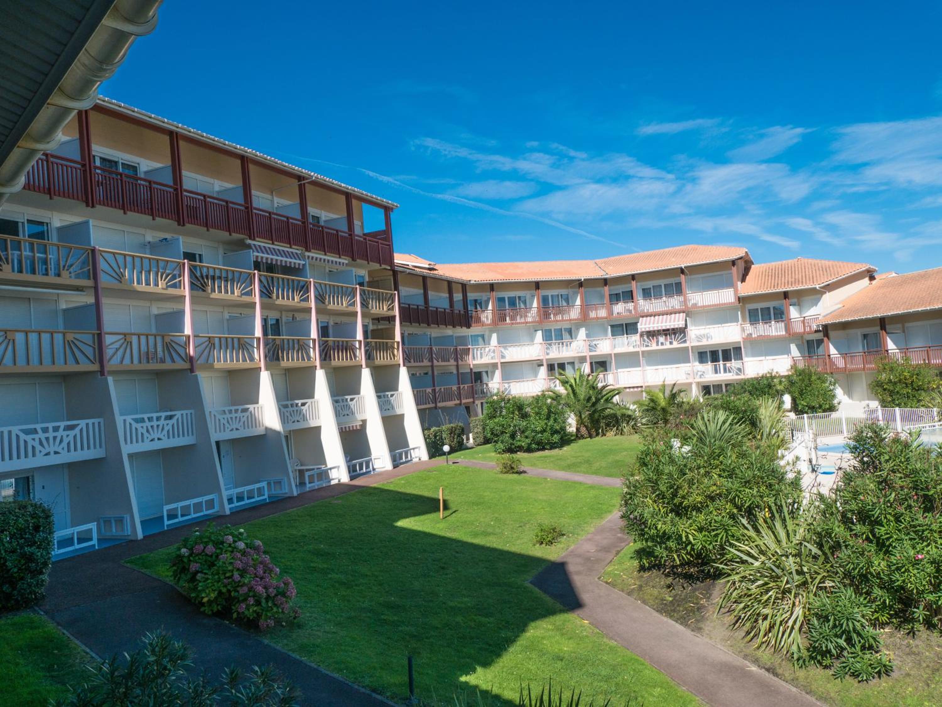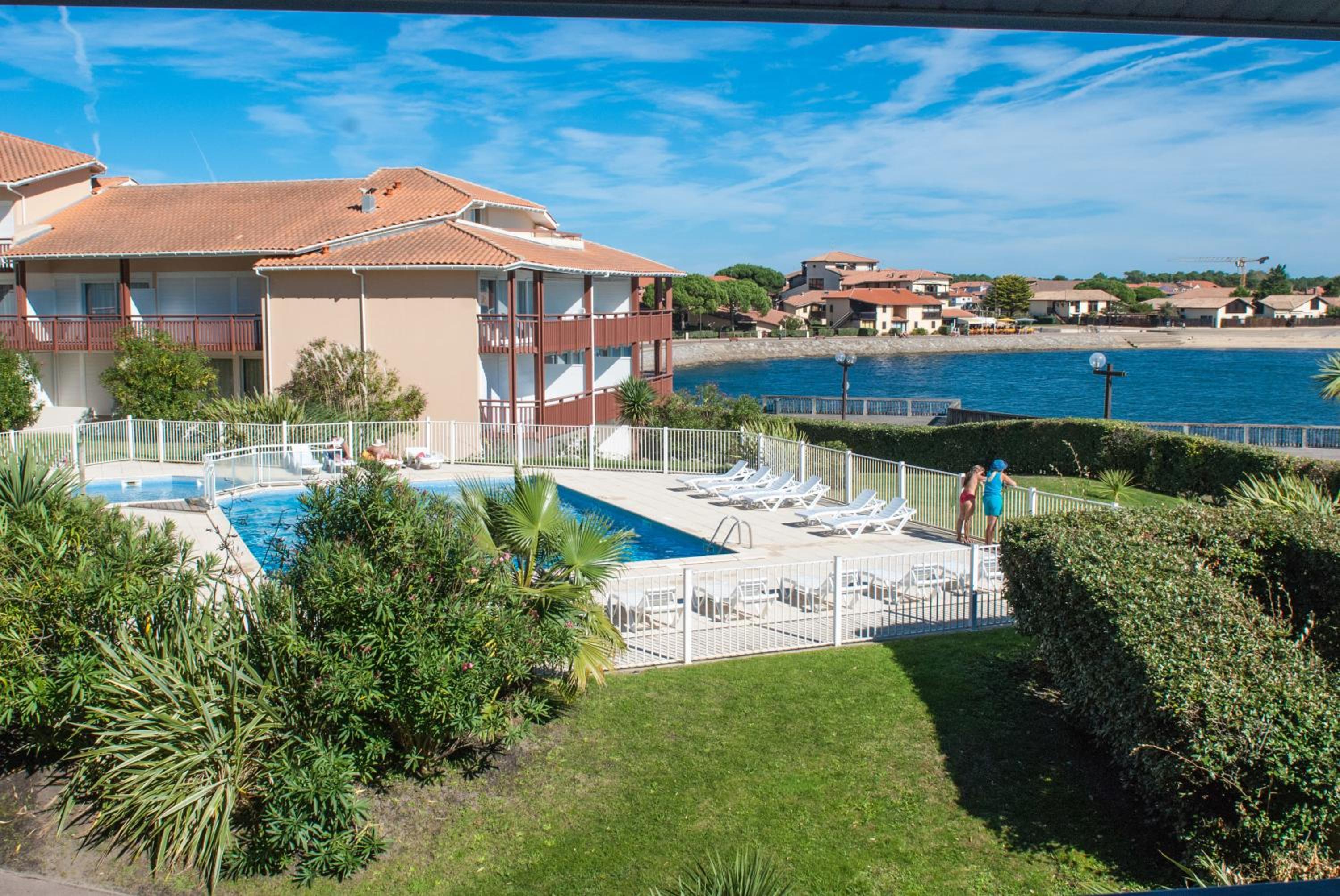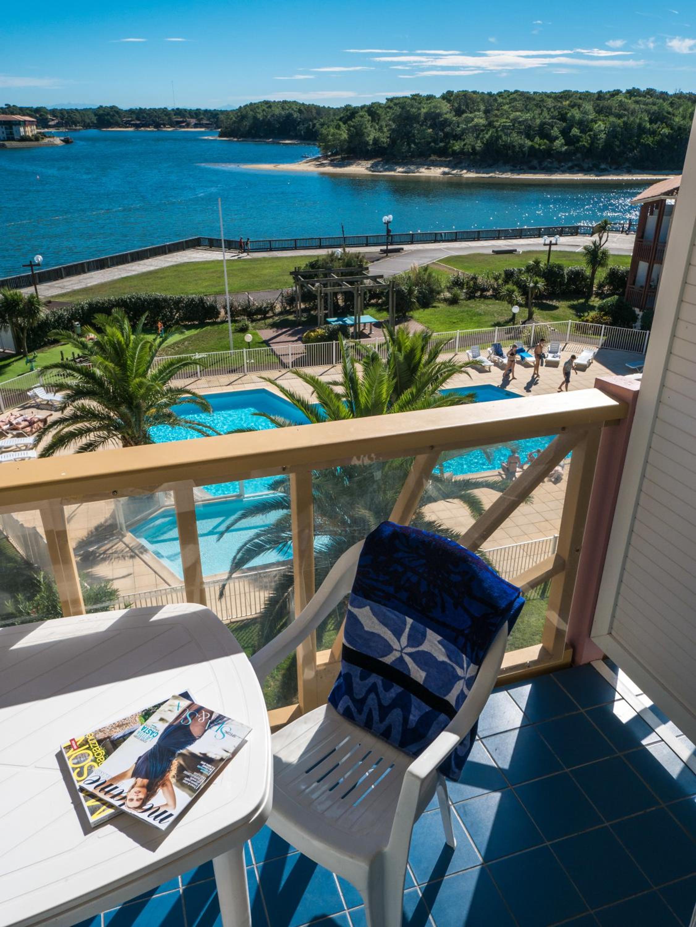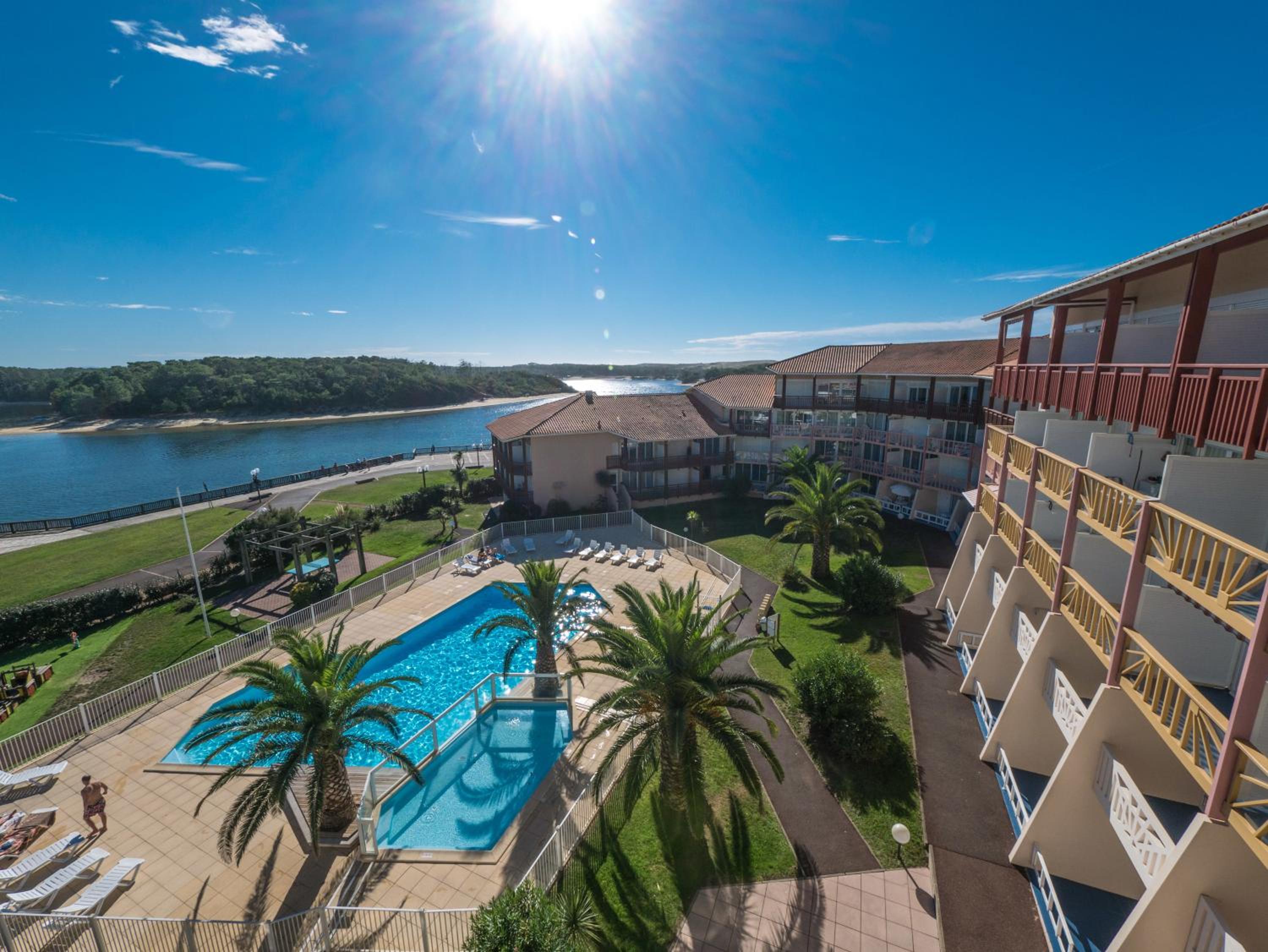Located between the ocean and the lake, Mer&Golf Le Boucanier Port d'Albret offers a unique stay surrounded by nature. The residence's 2 circular arches house around 120 apartments with stunning views of the swimming pools, lake, or garden.