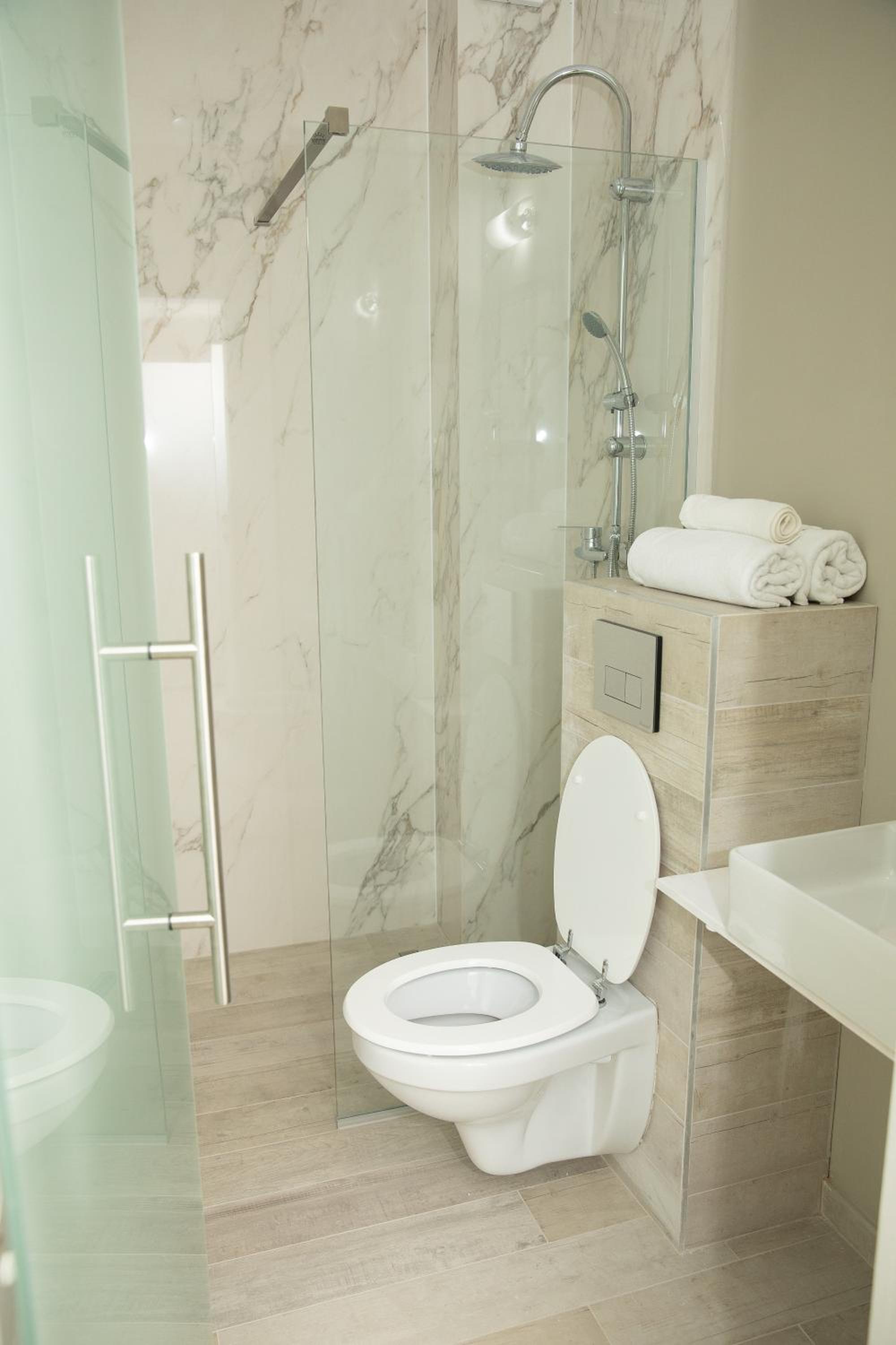 The bathroom doors offer very little privacy. The bathroom door has no lock, my 1 year old kid can just push it and come into the bathroom while doing my business and access the only garbage bin which has no cover. Also if you have someone over in the room you feel very exposed because the door is glass and 1 cm around it there is nothing, you can just look and hear everything. Nobody likes this trend with exposed bathrooms and I wanted to mention it.