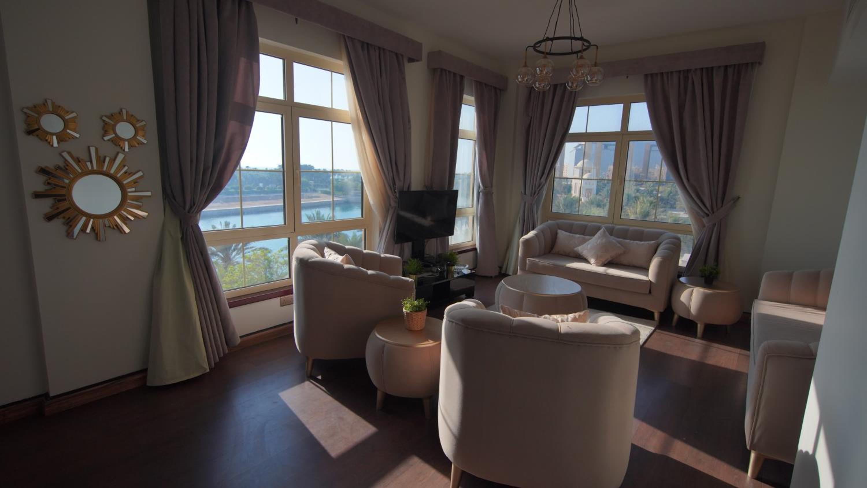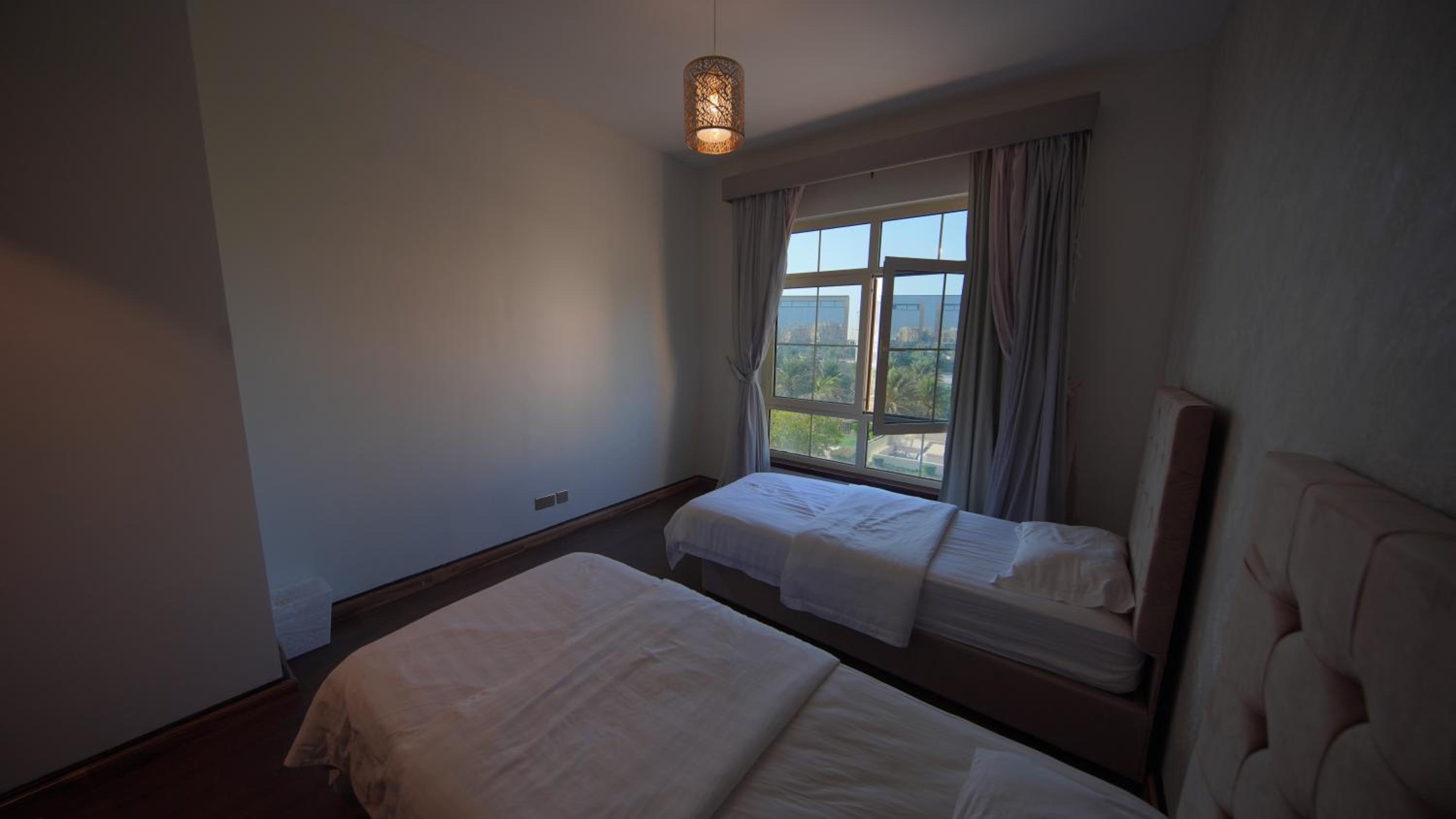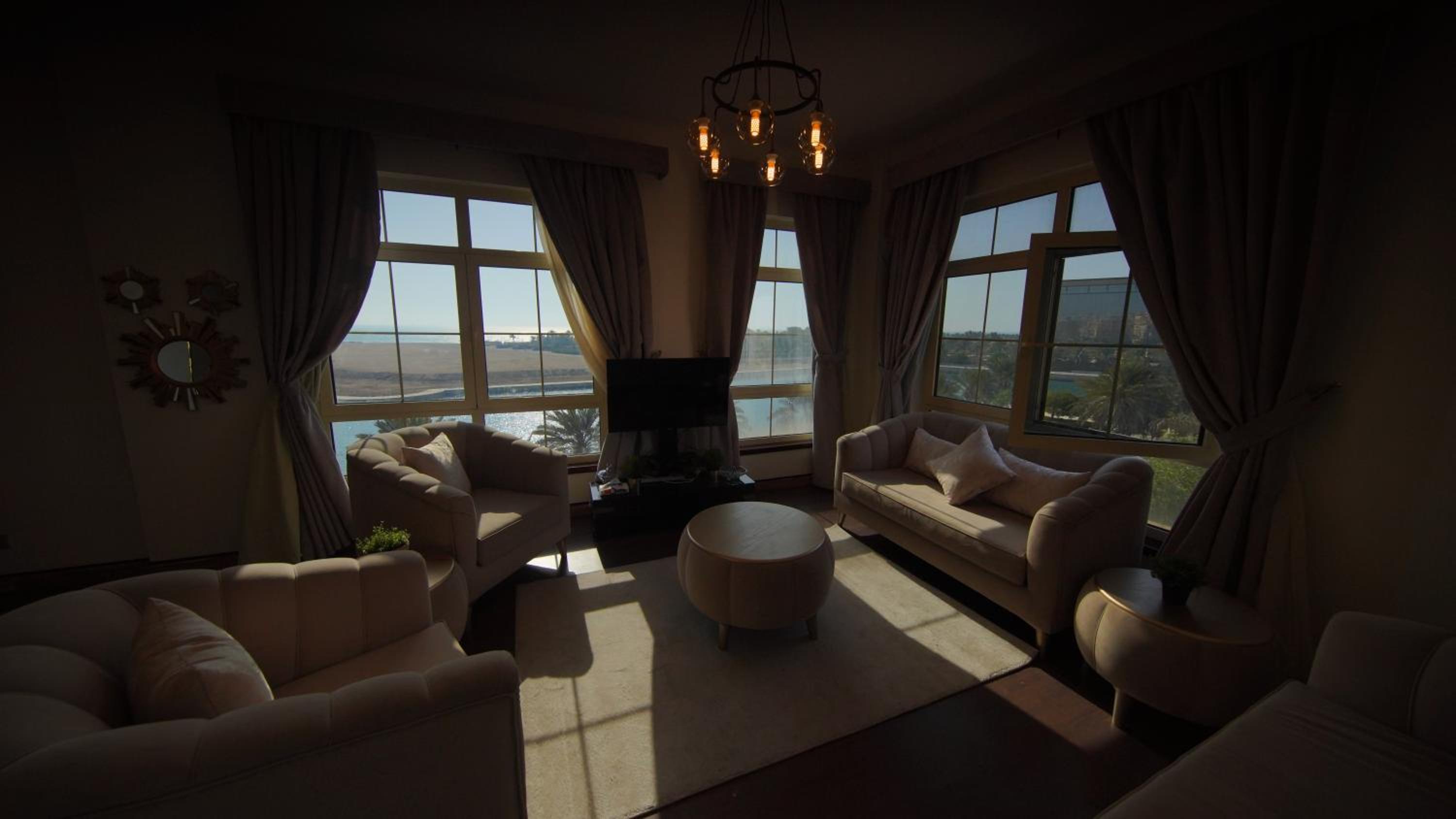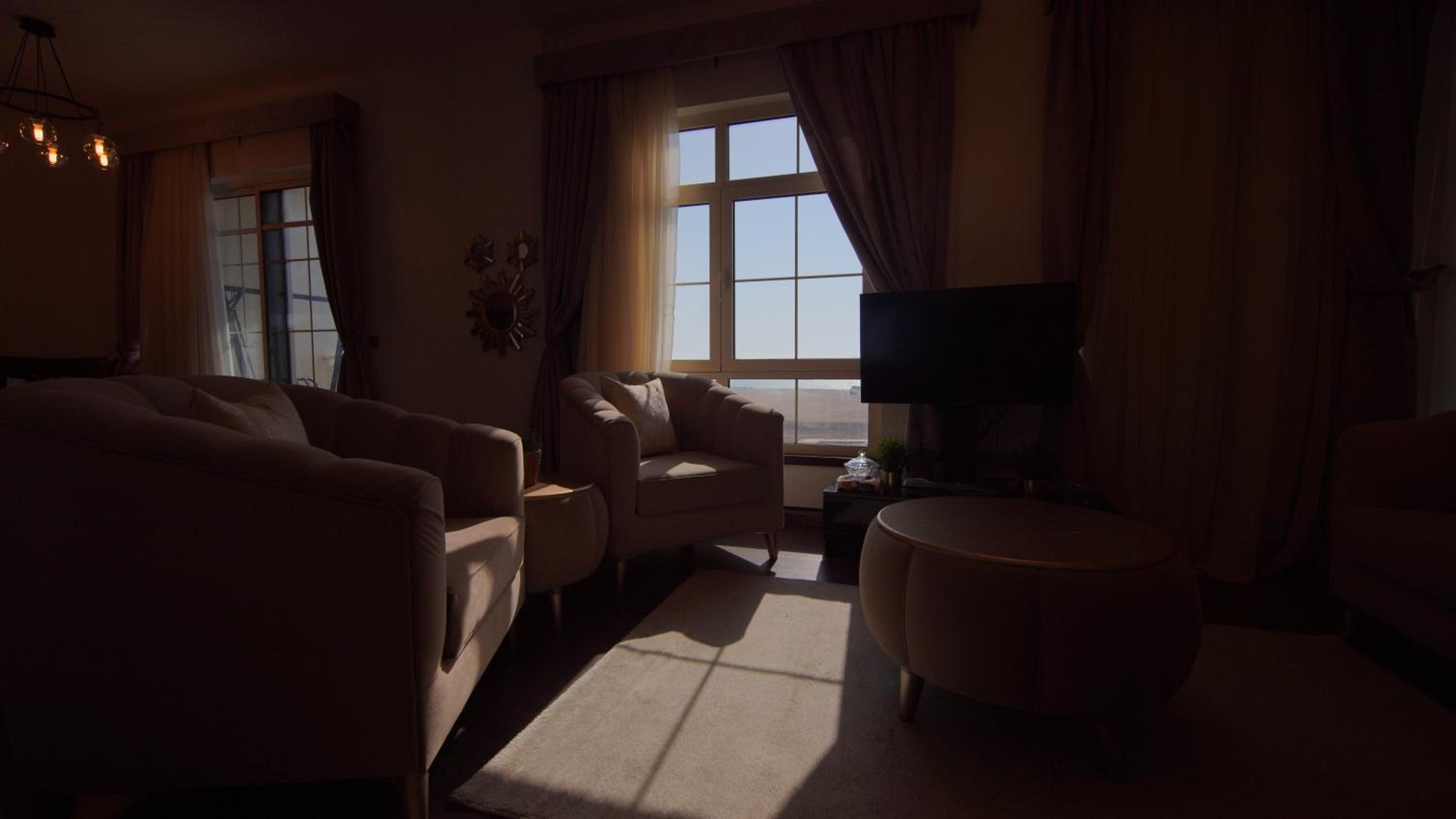 الاطلالة جميلة على الرغم ان بعض الشبابيك وسخة وما تشوف زين من خلالها، الشقة ككل ما تستاهل سعرها غير نظيفة وغير مهيئة من ناحية الصيانة