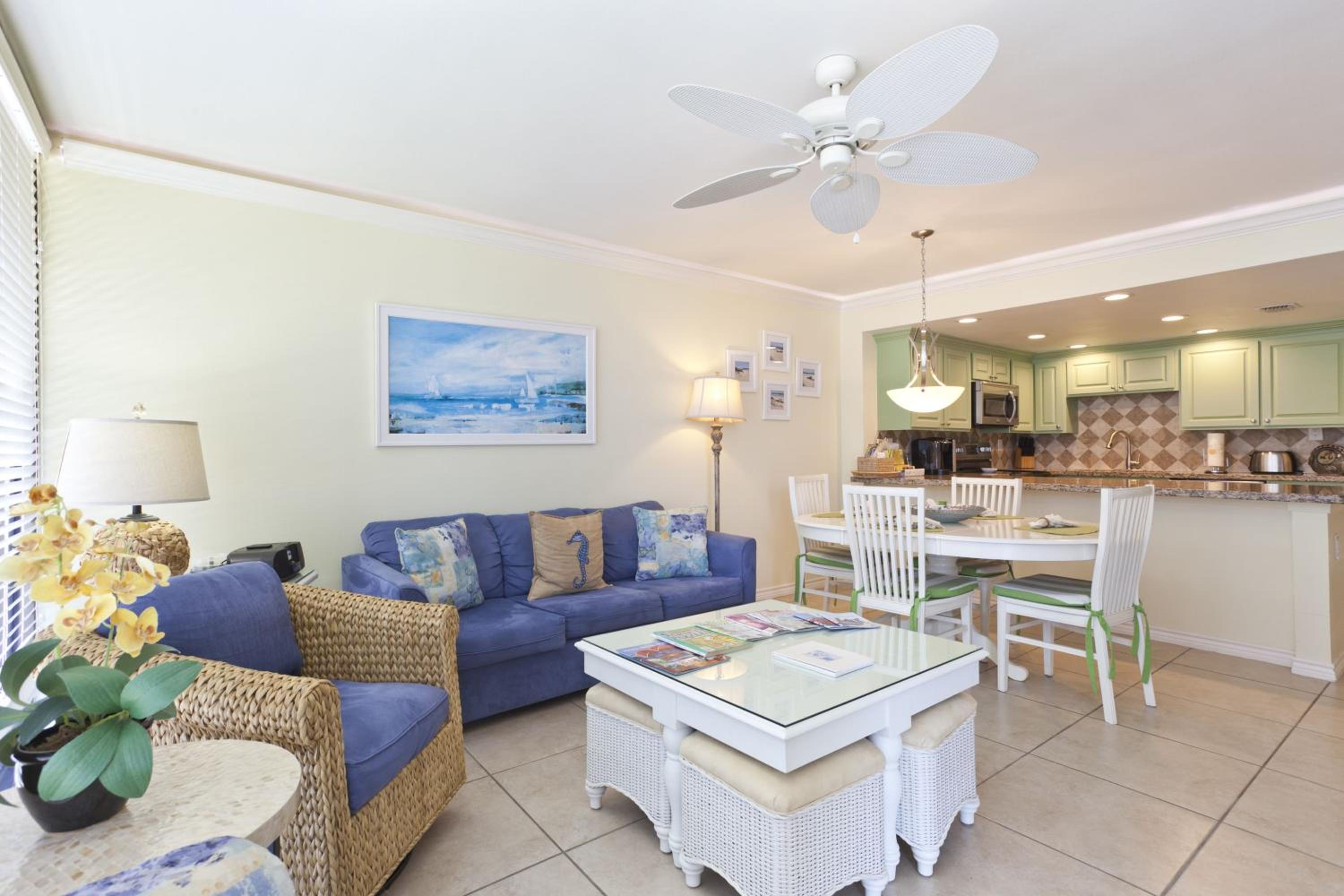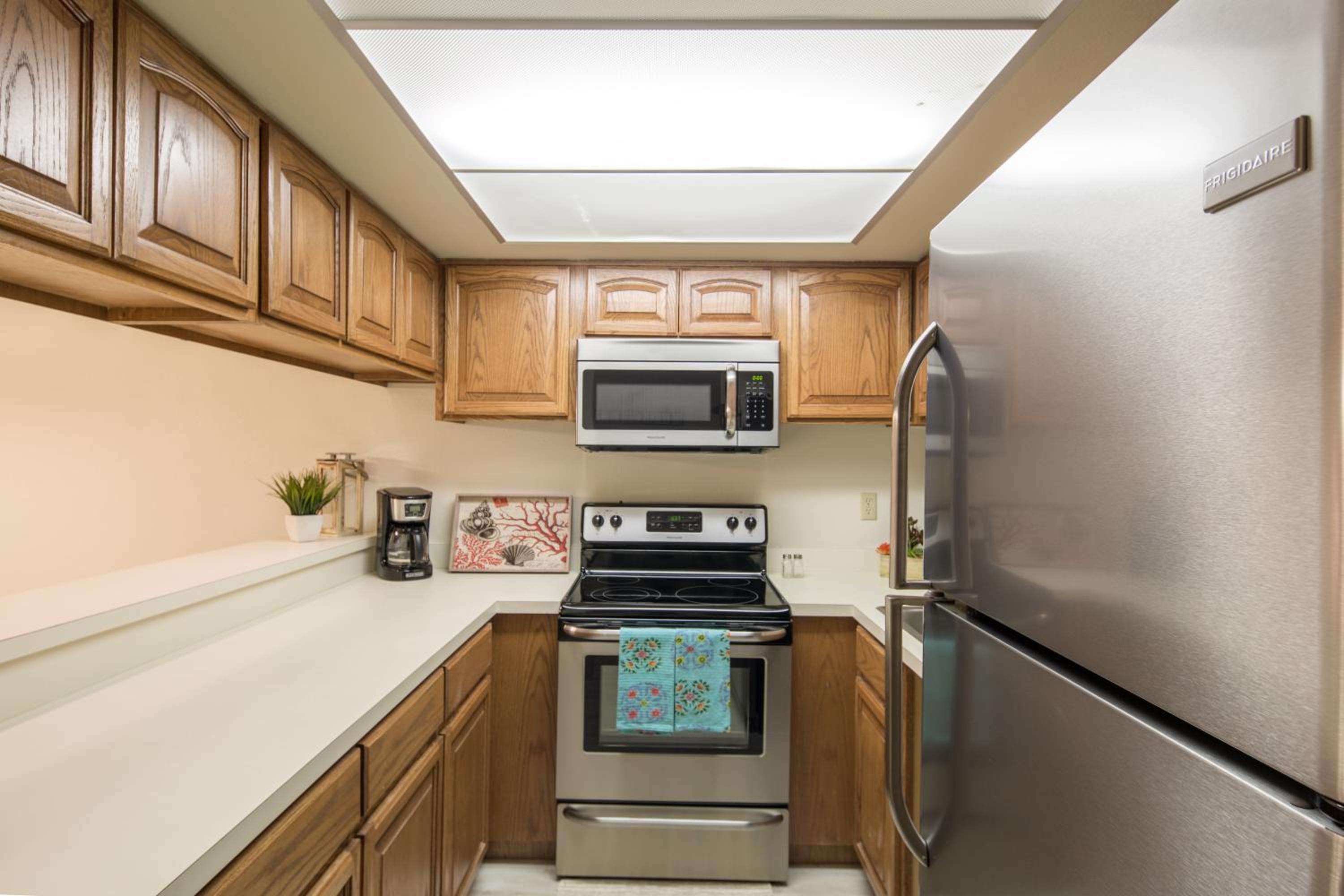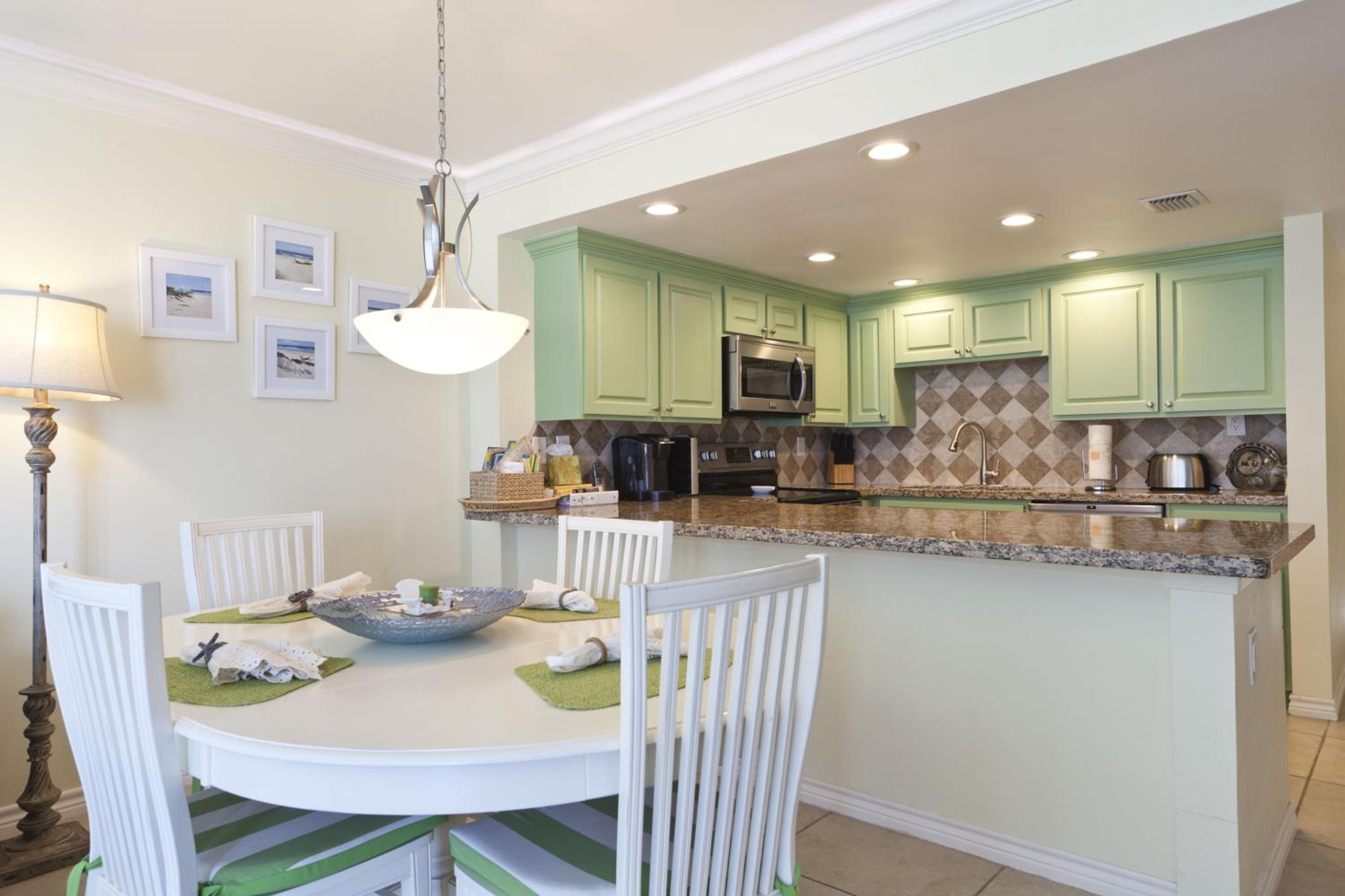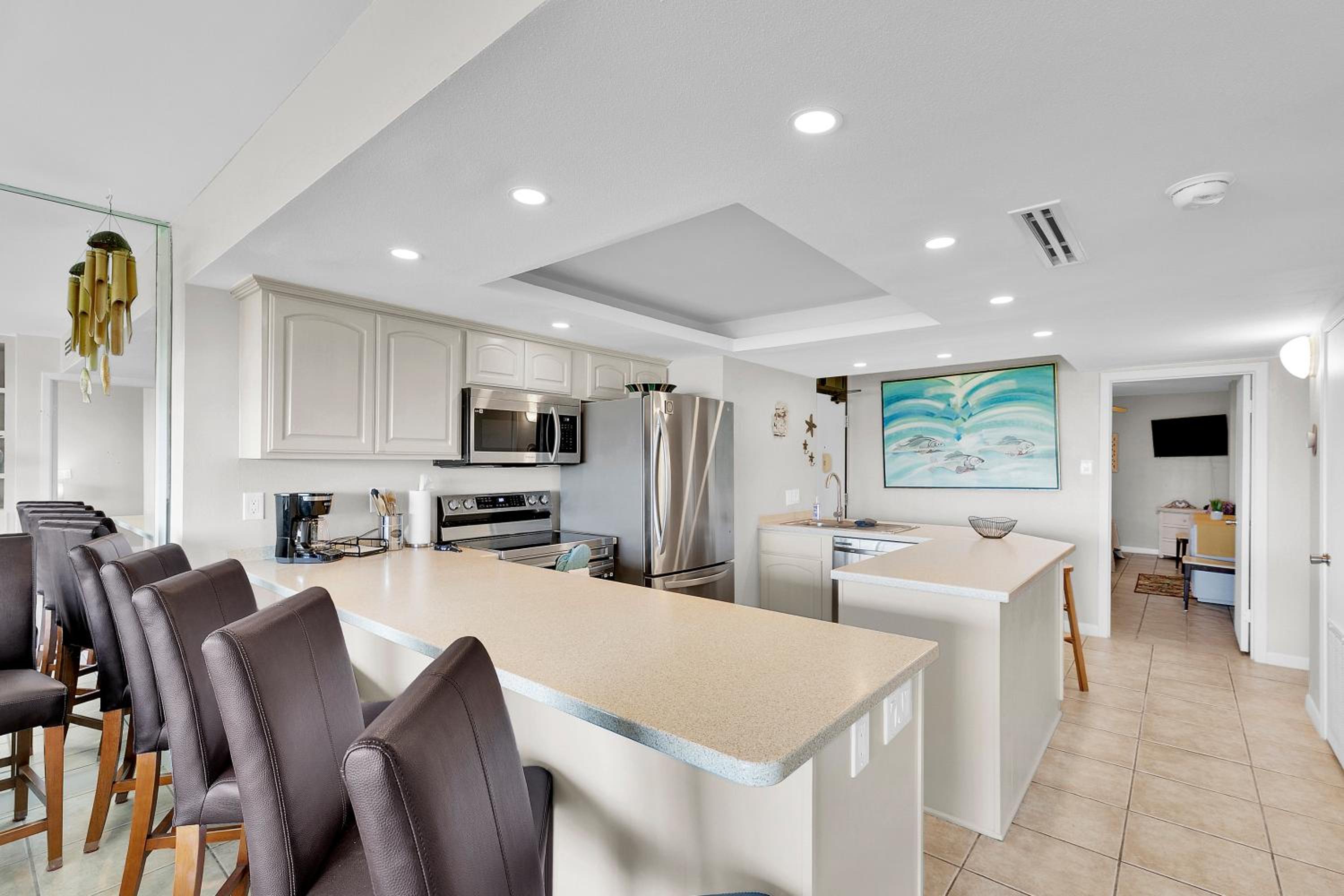 Each uniquely decorated condominium at Sea Vista features a flat-screen TV, DVD player, and a kitchen equipped with modern appliances. Some units offer a dining area and balcony for a perfect vacation setting.