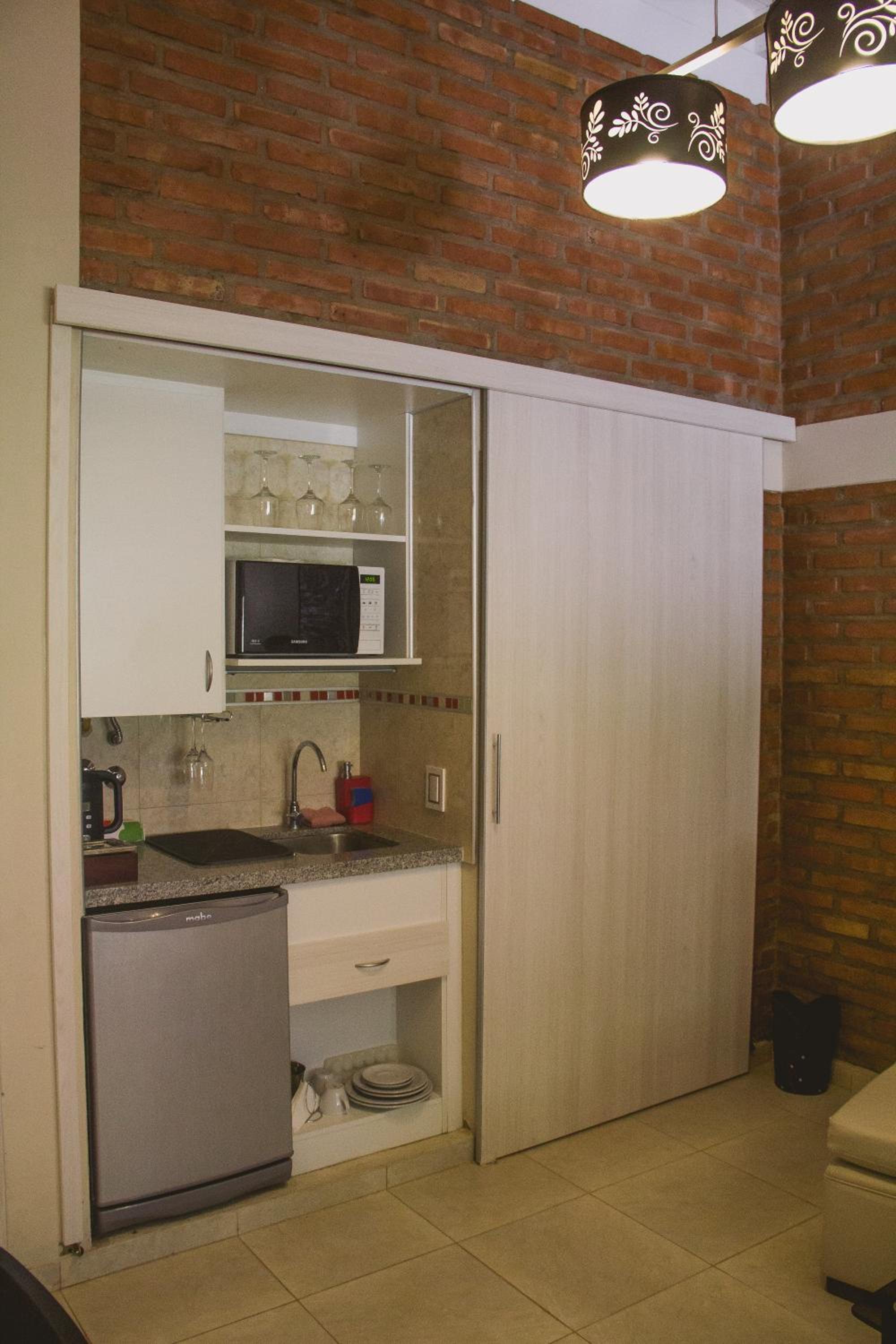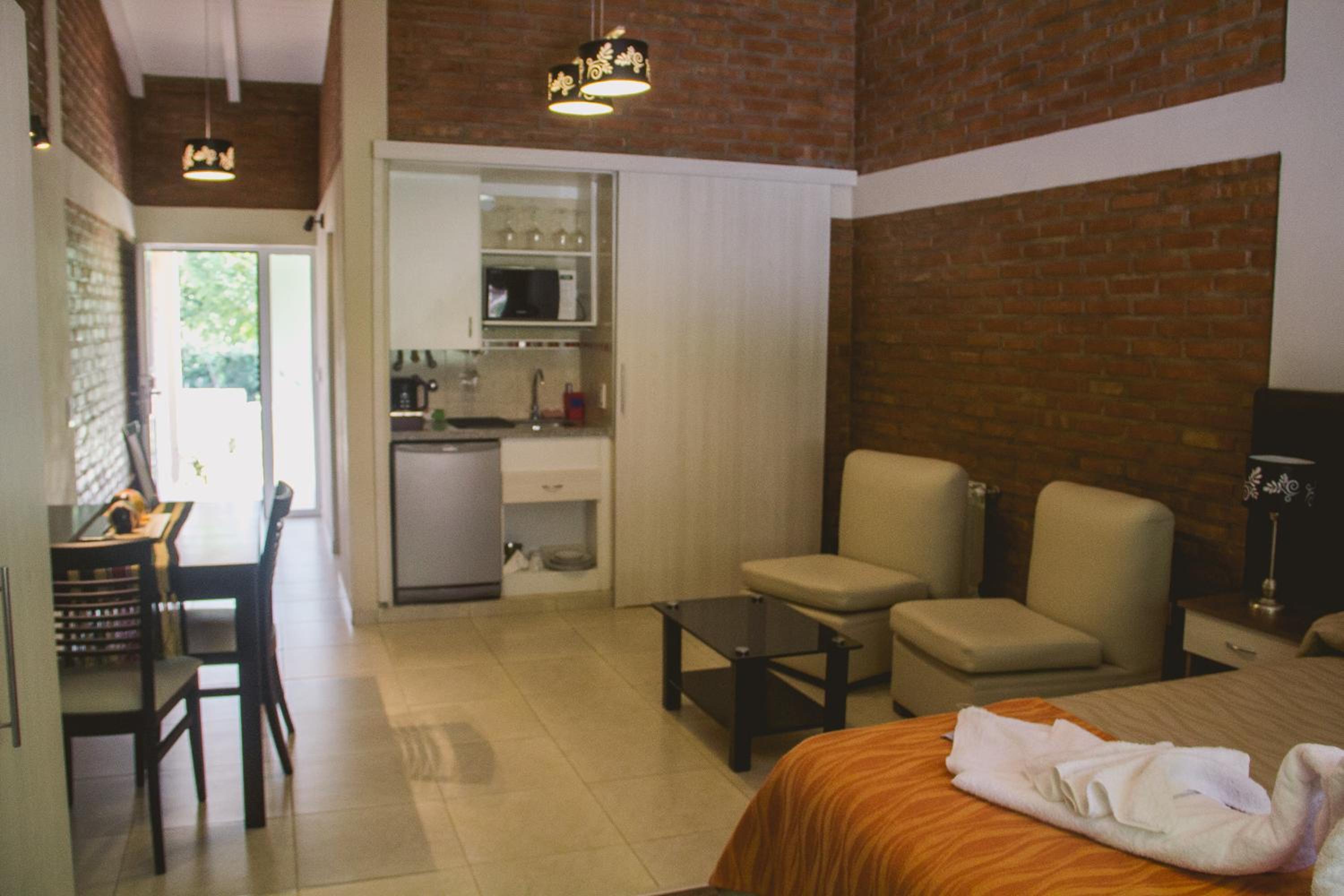 La habitación incluye un estar y comedor además de una kichinette. El baño es amplio. Muy cómodo. La cama amplia y muy confortable. Tiene un S.U.M. estupendo. Con todos los utensilios necesarios para cocinar (Horno eléctrico, cocina a gas, micro onda, etc. No falta nada. También incluye un gimnasio. Es una síntesis de hotel y casa de veraneo. Podés usar todo y no tenés que limpiar. El desayuno muy completo. Y Luciana, su propietaria, está atenta a tus necesidades.