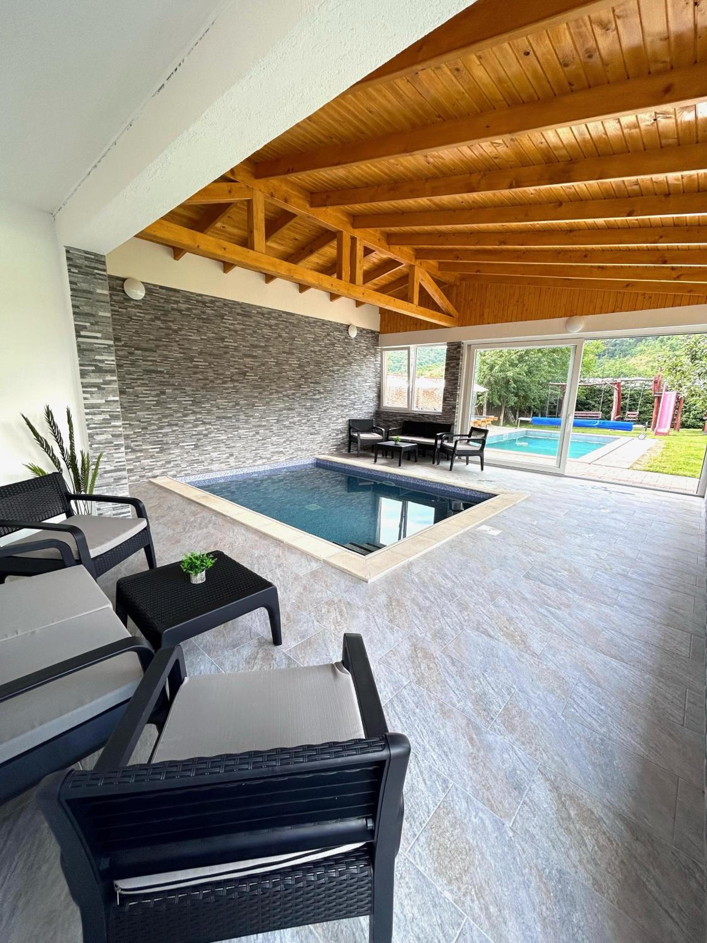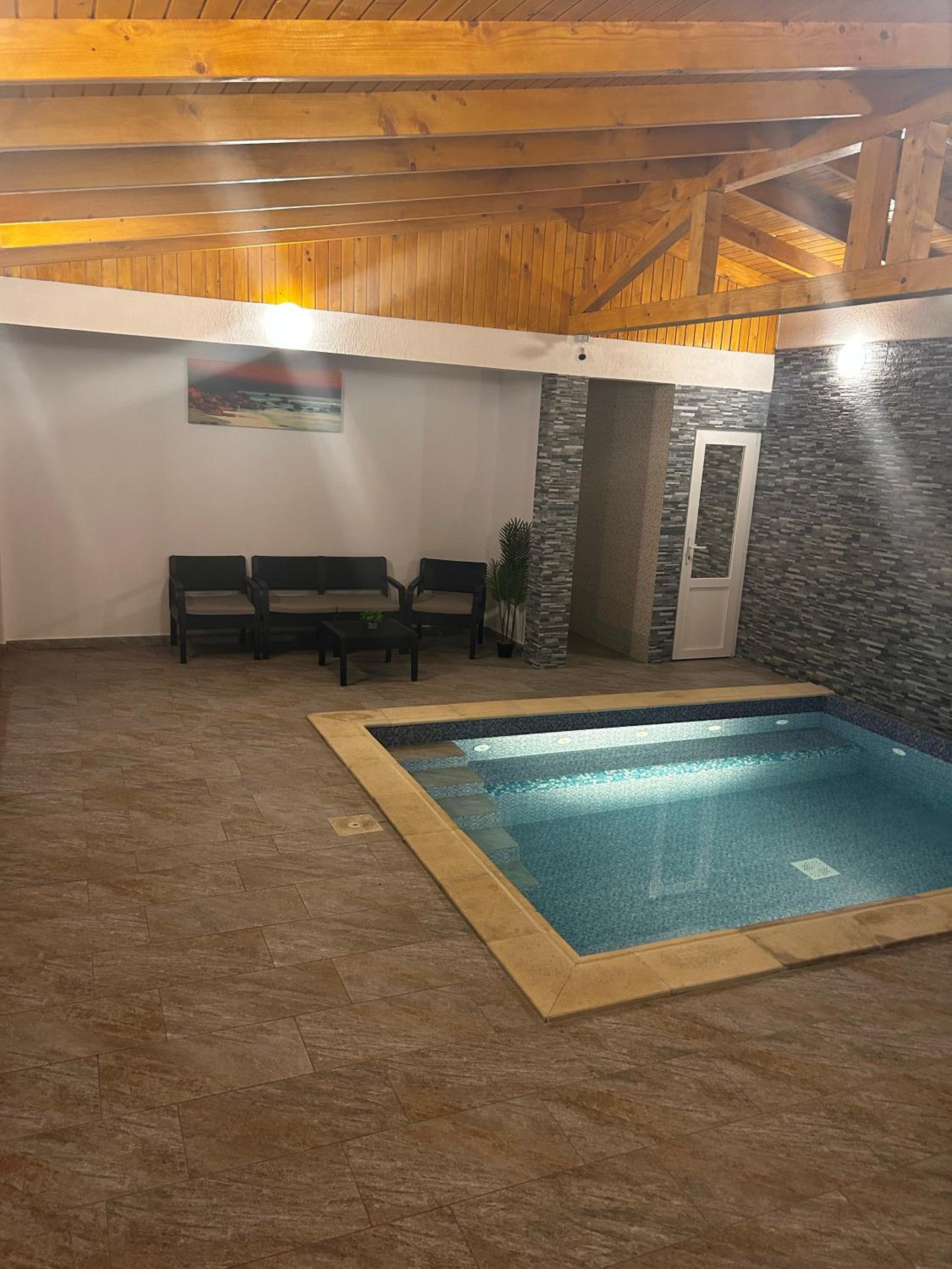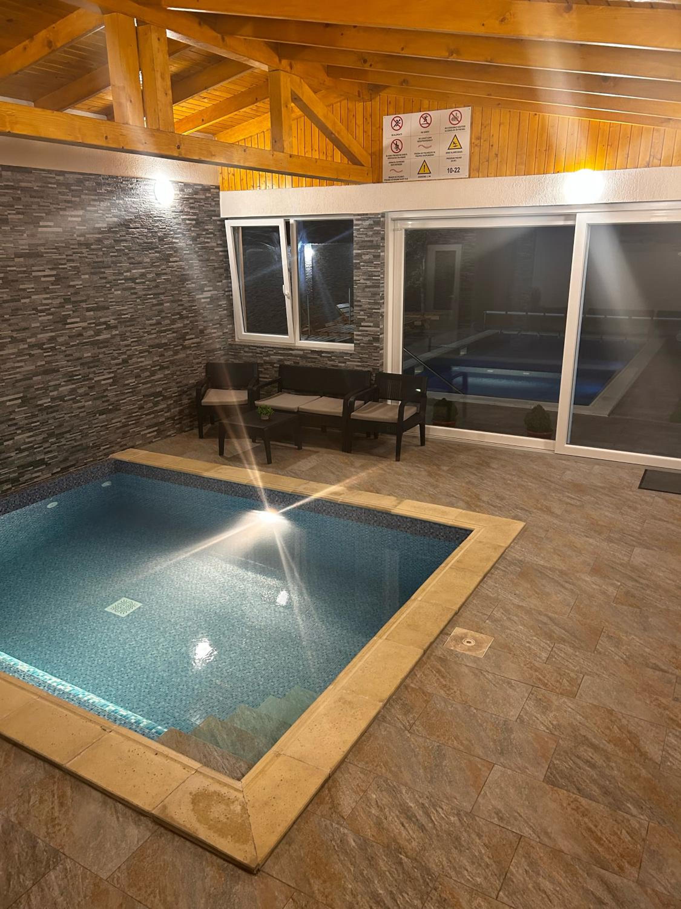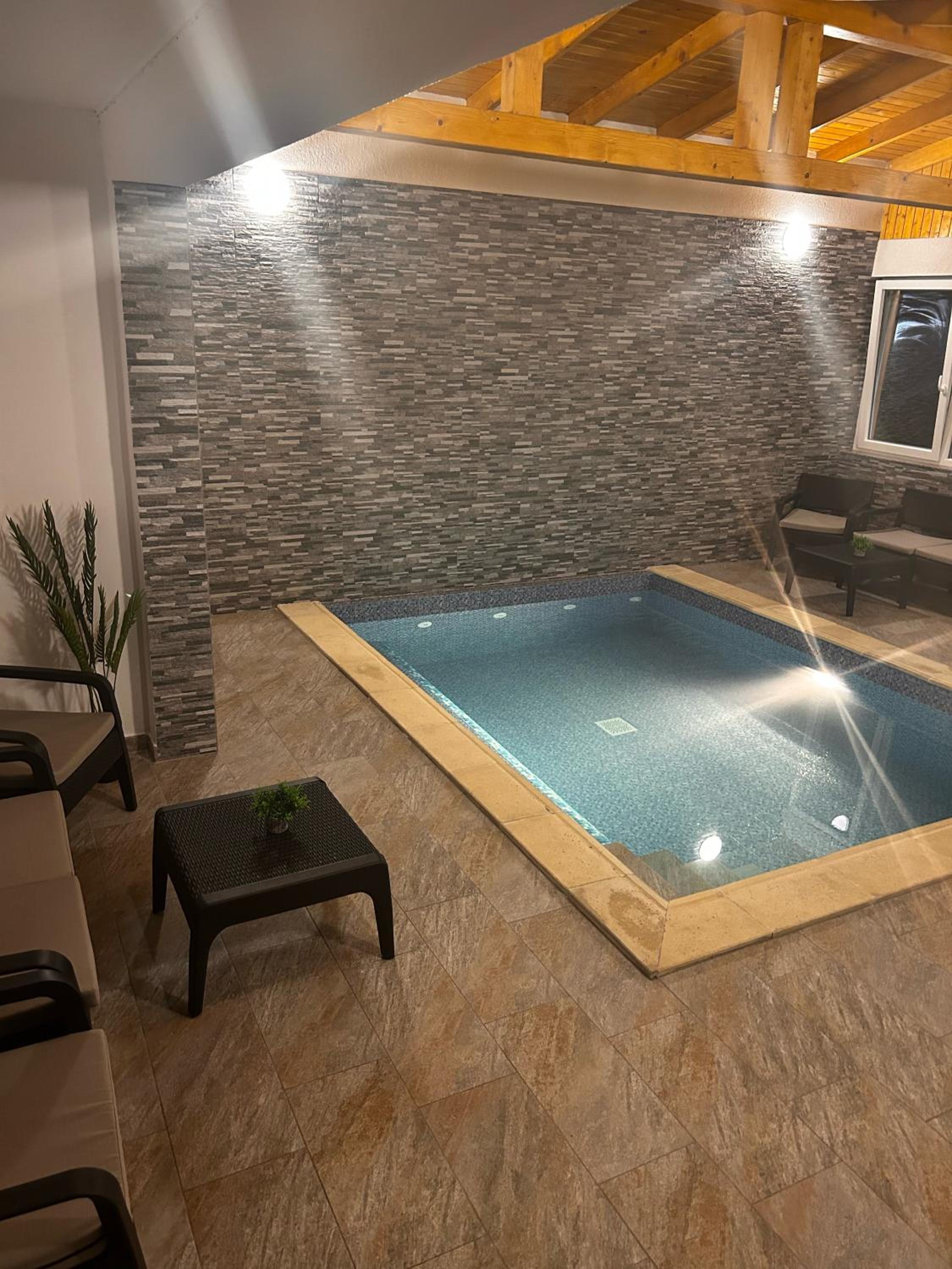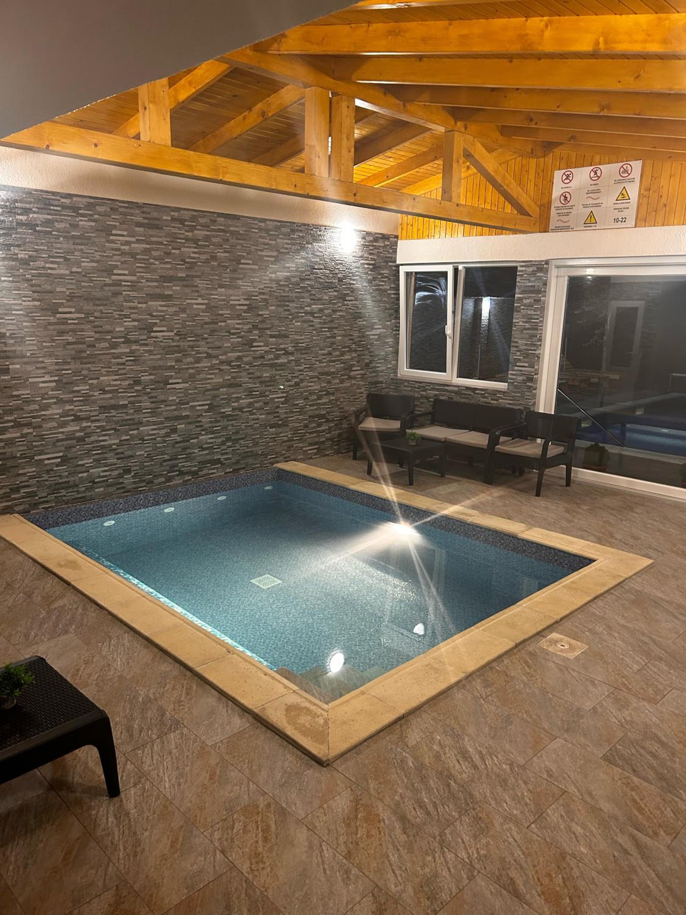 Piscina este încălzită. Doua bazine,unul interior,altul exterior,te simți că la spa. Curate și amenajate cu gust.