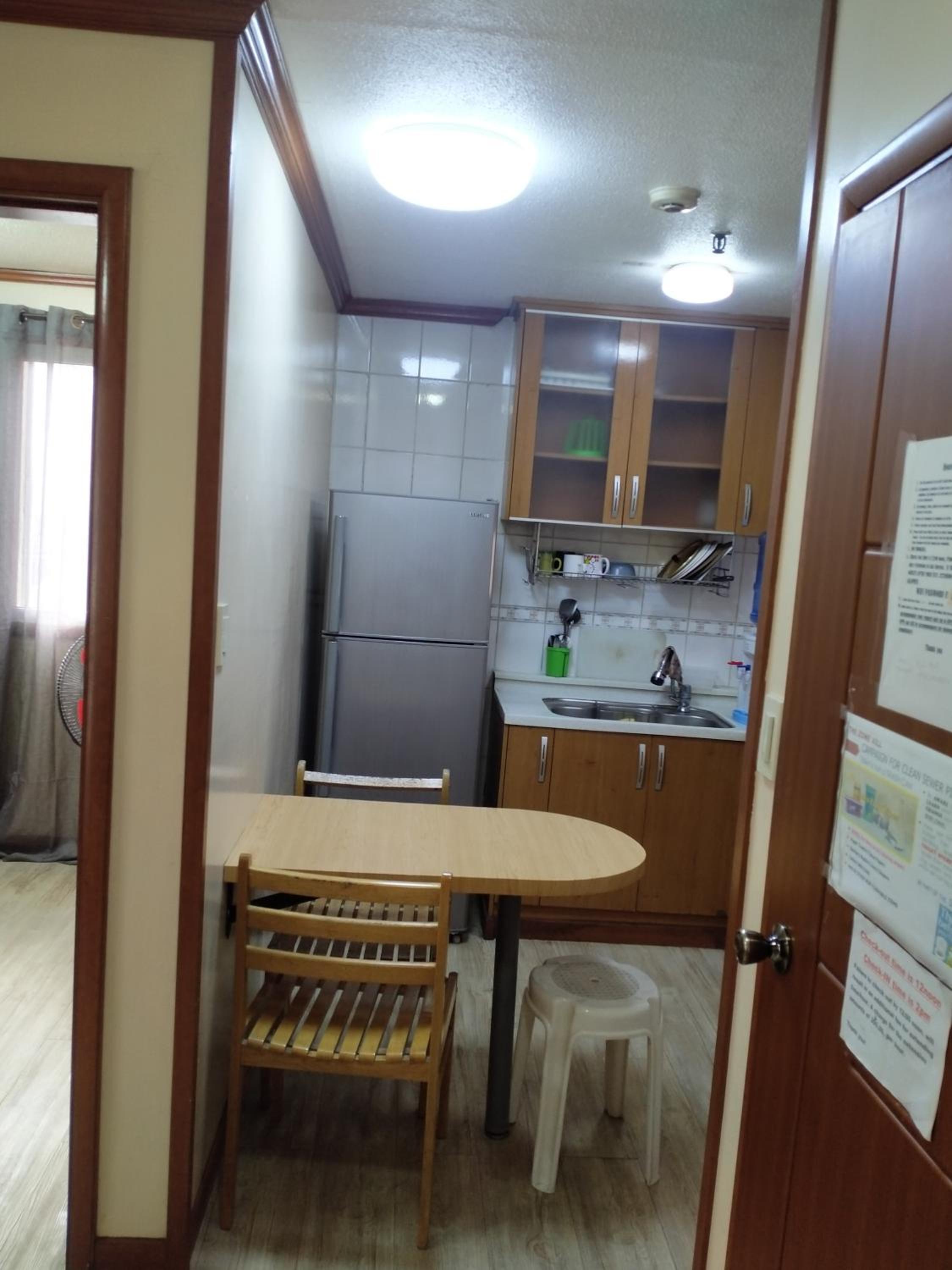 Good location. Helpful staff. Unit was spacious, homey and secured. Elevator is a plus for seniors. Wifi is fast. Secured pay parking. There is a convenience store at the Reception where you can buy basics. Pet friendly (add 250 per pet). You can cook in the kitchen as kitchenwares are provided. I have to buy dishwashing liquid but the staff give me a bottle. Fridge is working.