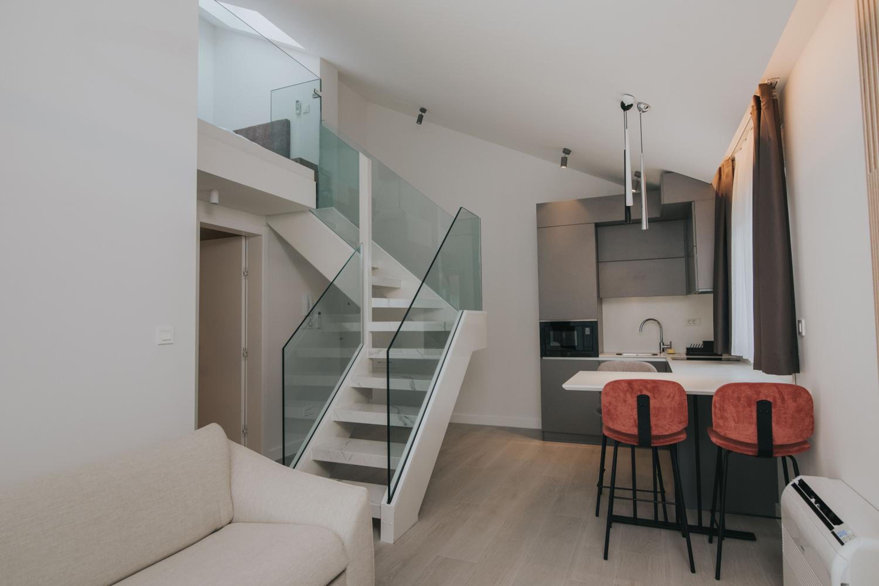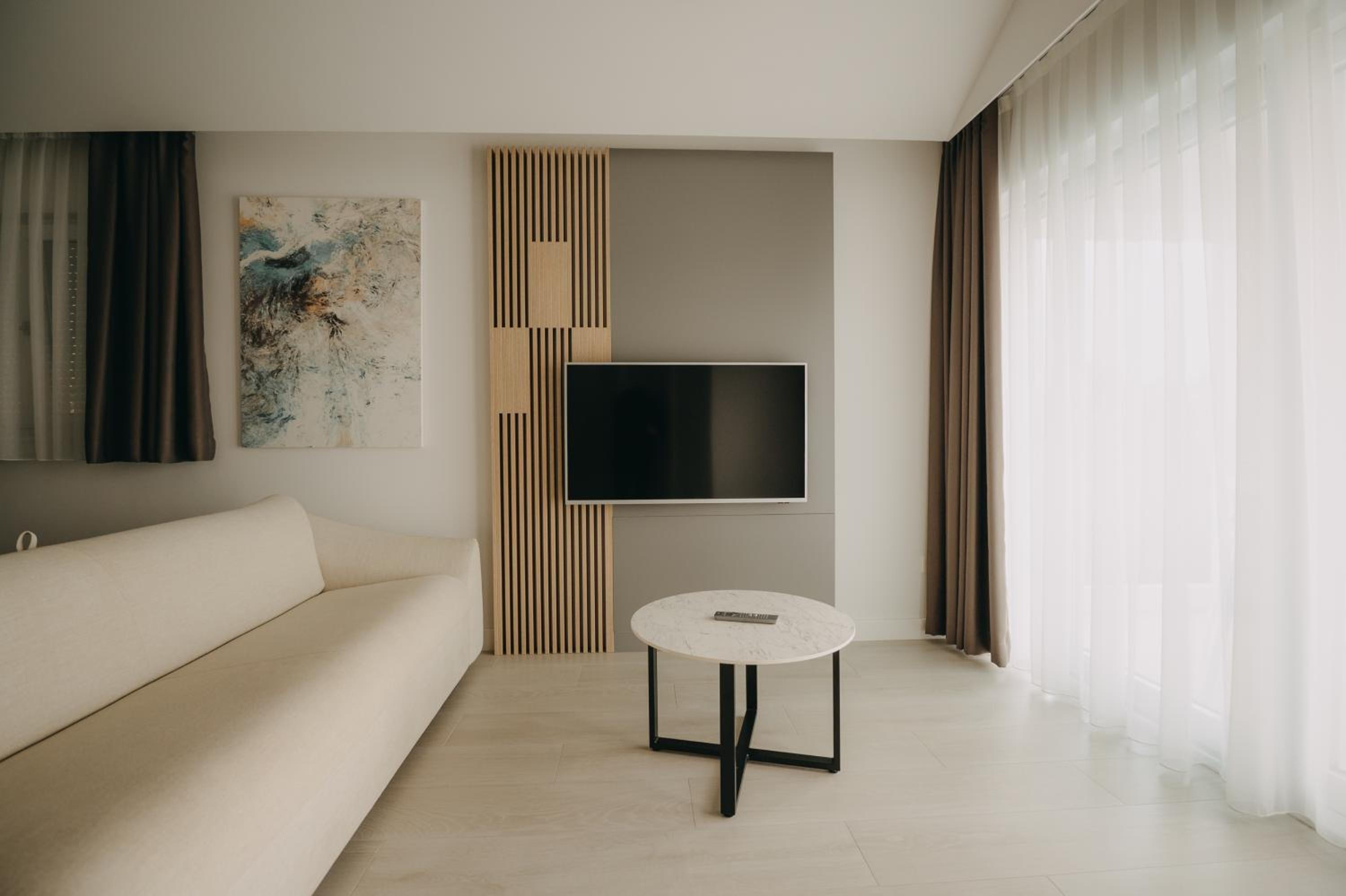 A szoba tiszta, rendezett, modern.