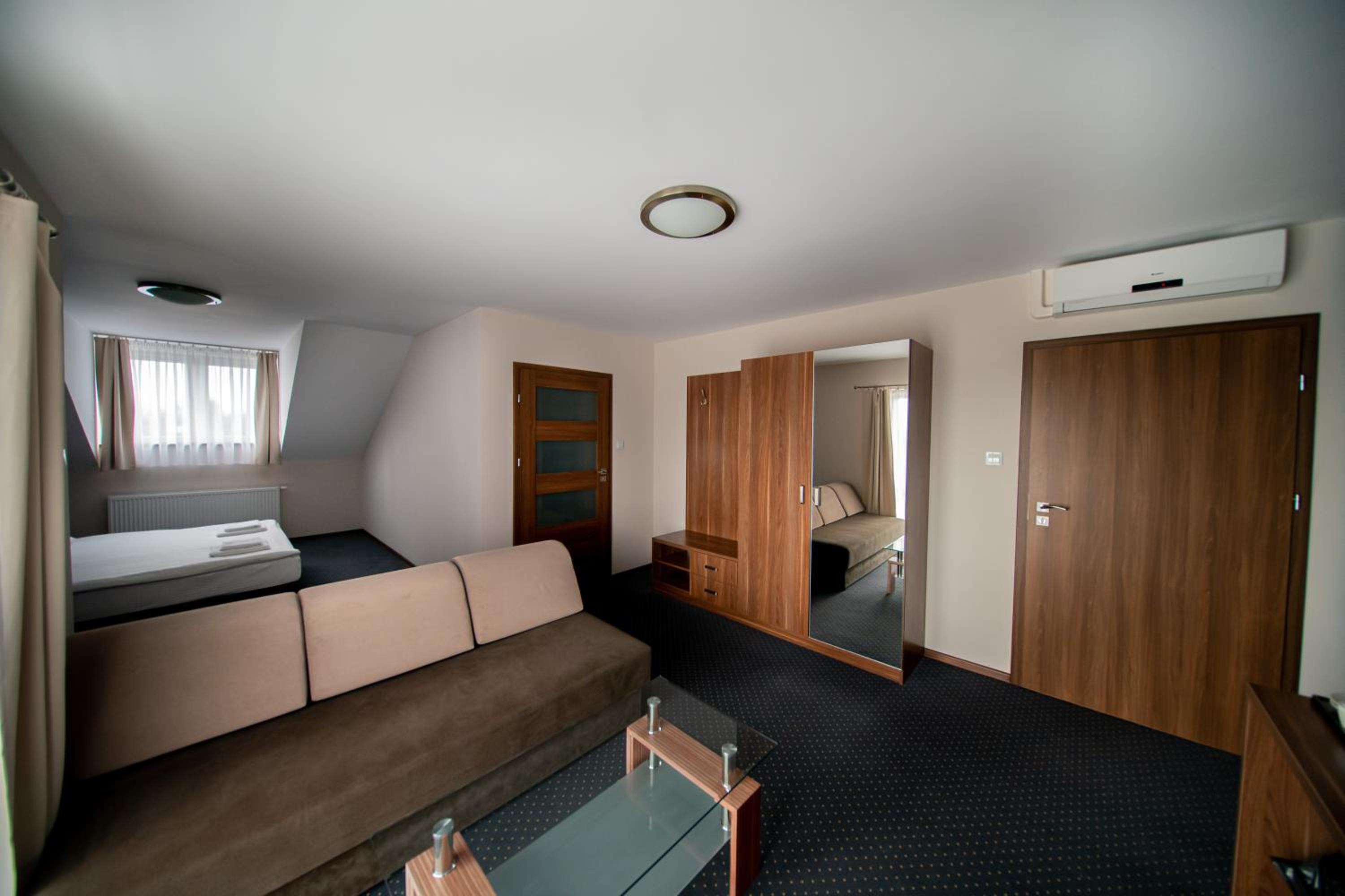 Wygodne łóżko z niedzielonym materacem i prześcieradłem .Duże przestrzenne pomieszczenie z wygodnym wypoczynkiem.