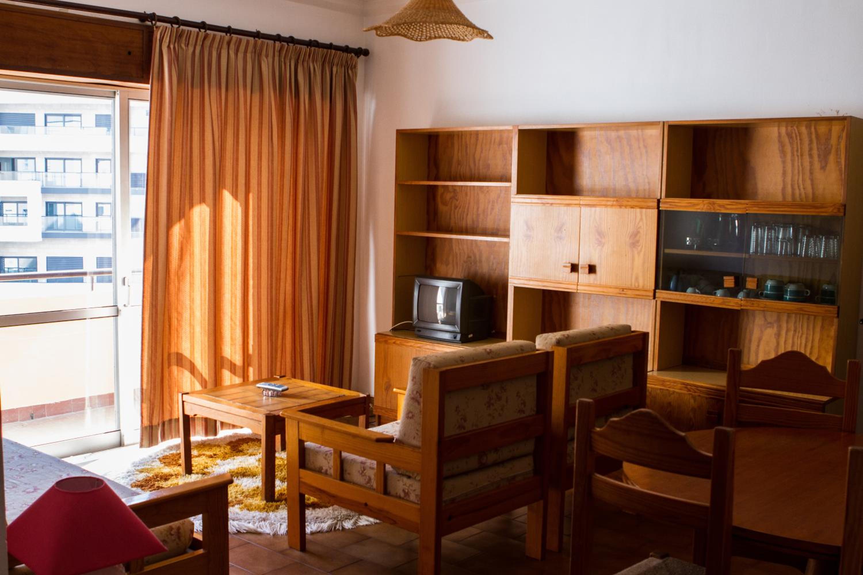 Experience traditional Portuguese charm at Columbia Apartamentos with cable TV, wooden furniture, and tiled floors. The cozy and simple decor creates a comfortable atmosphere for your stay in Portimão.