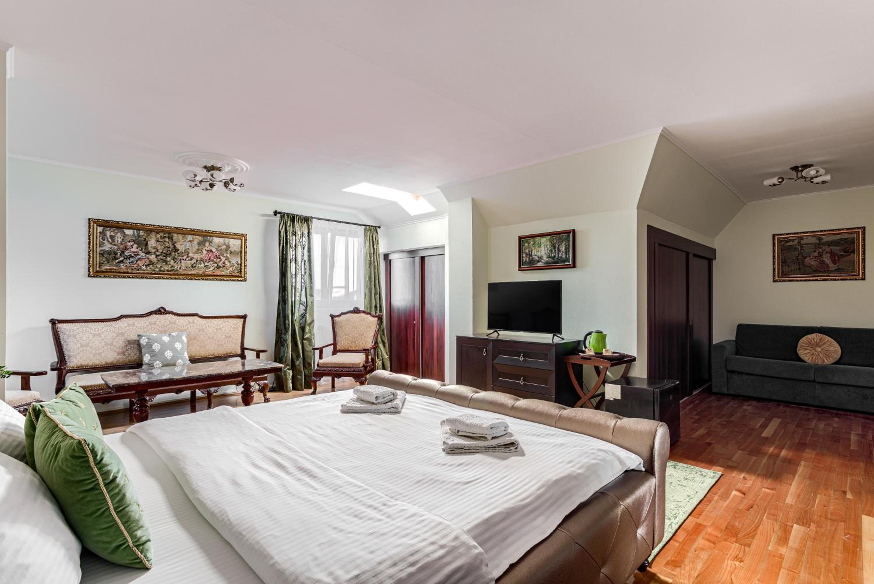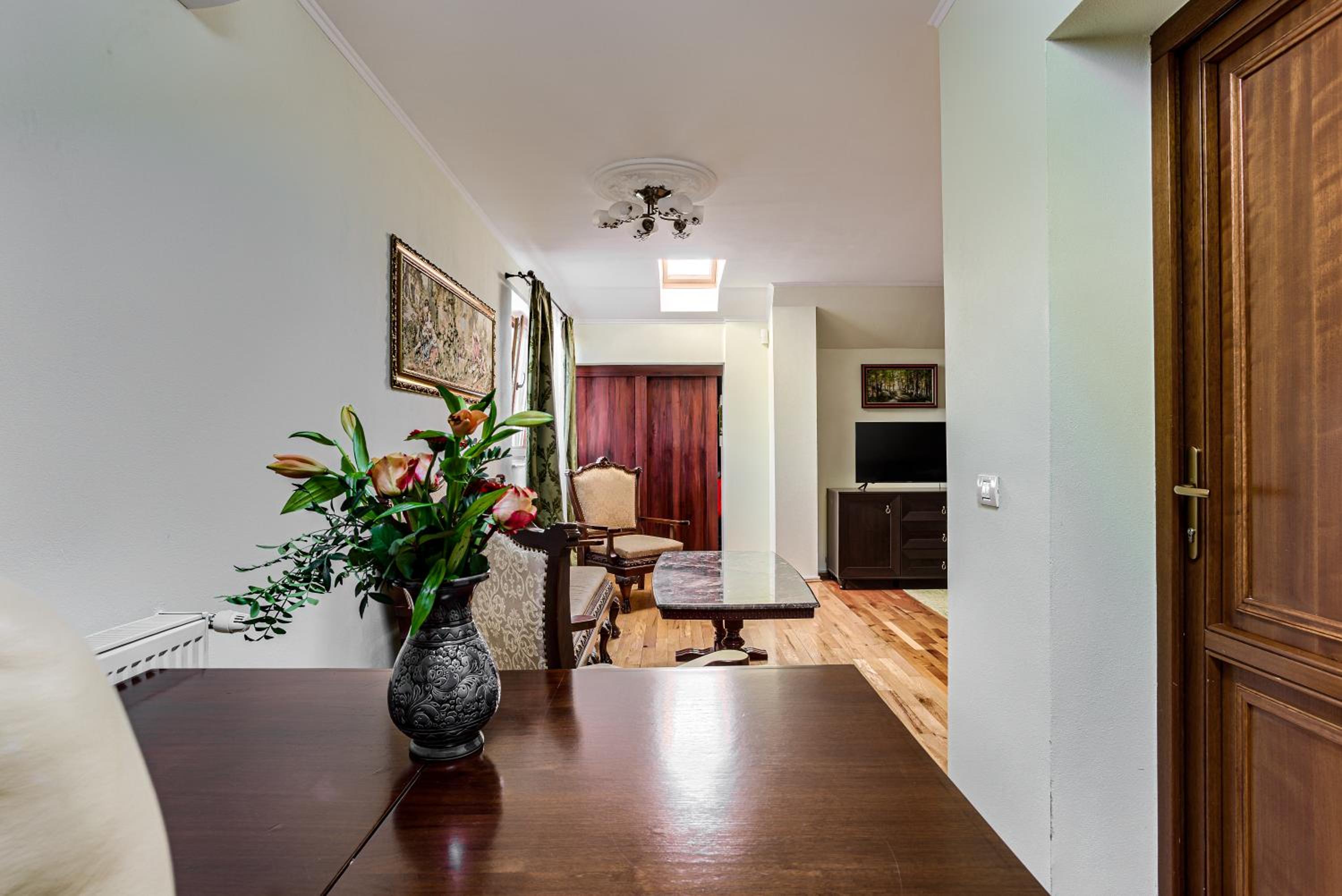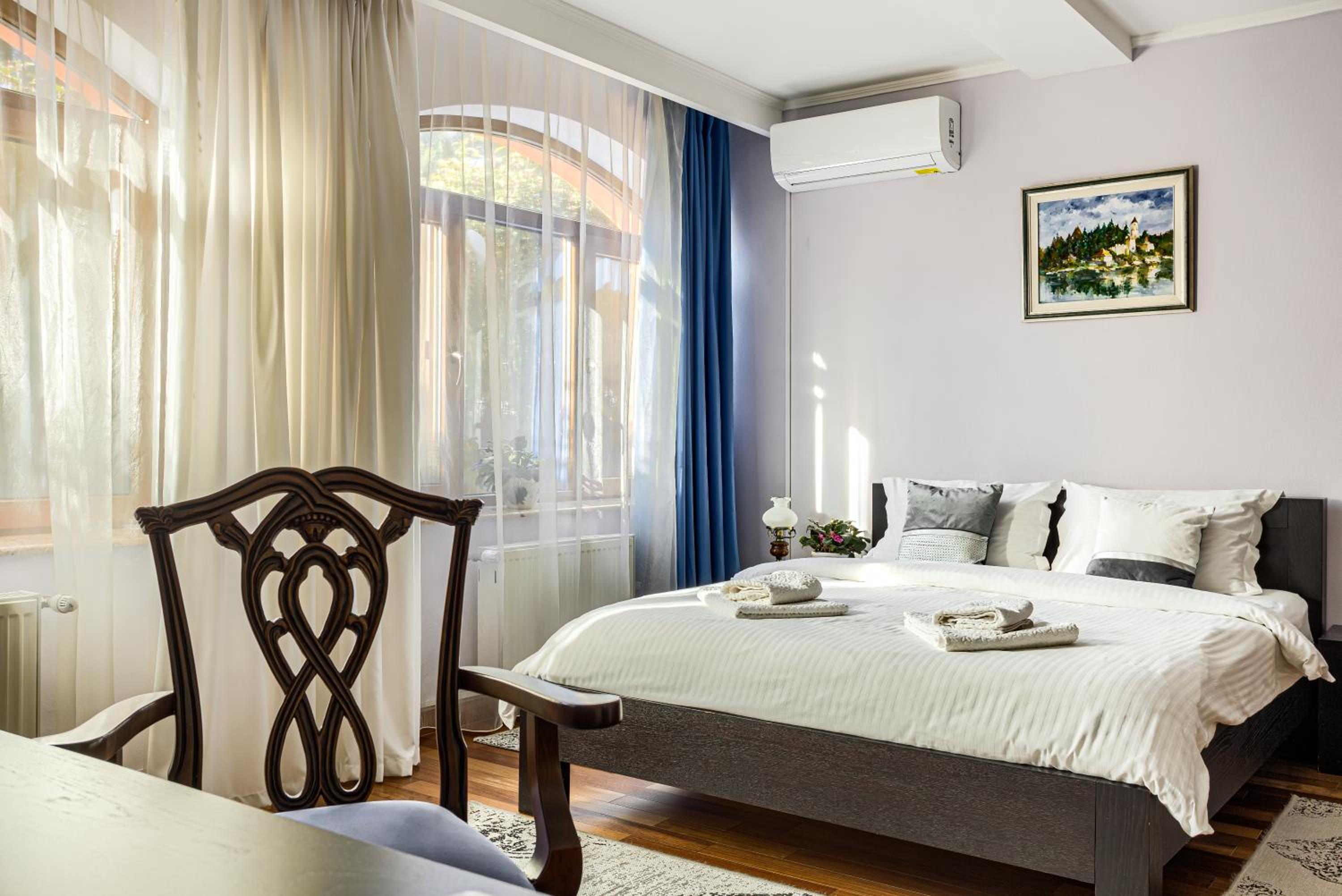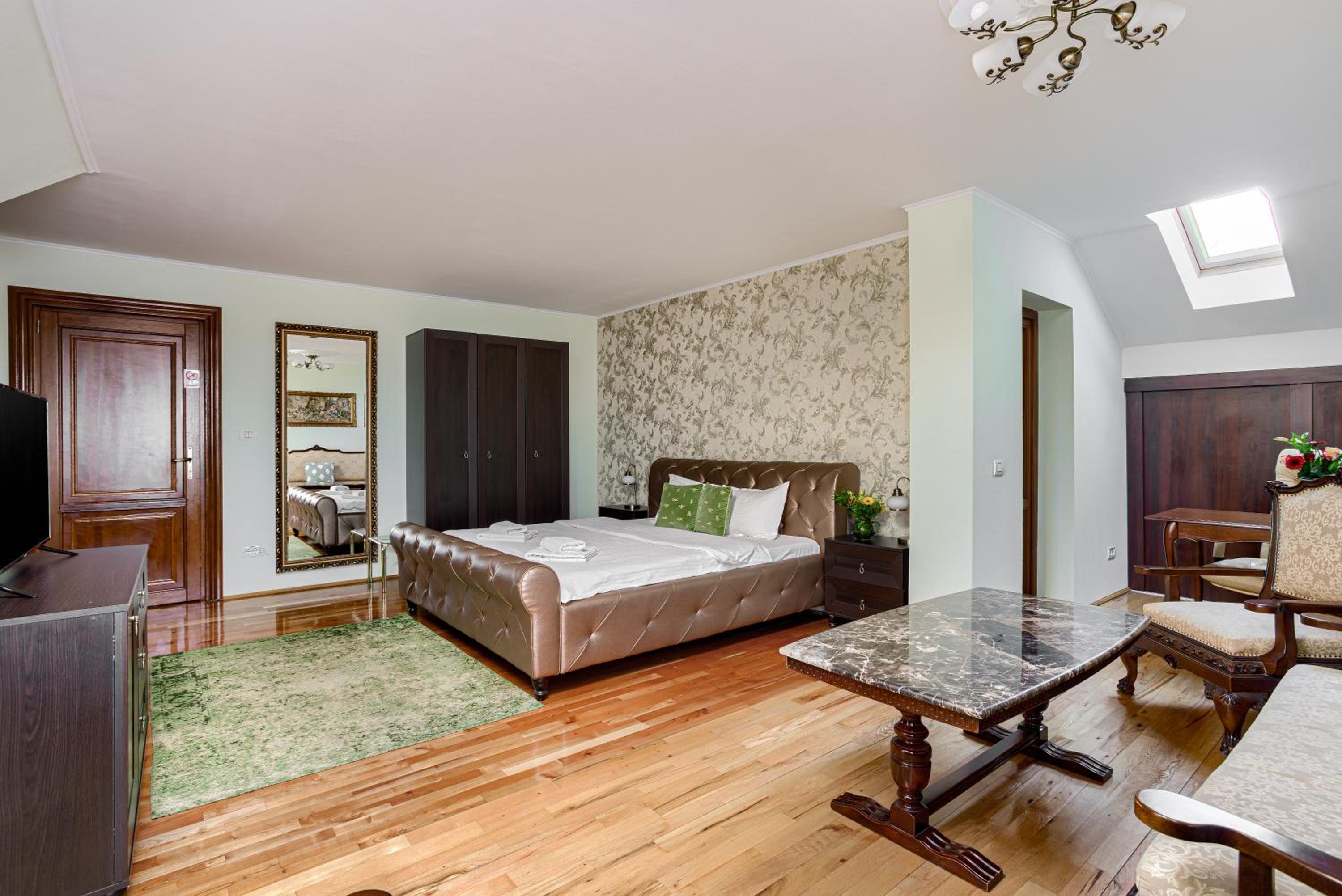 Although on the outskirts of the city, the place is beautiful and picturesque. The courtyard is large, well organized, you can park inside. With a taxi you can reach the center quite quickly. A taxi is recommended, because in the vicinity there is a not so friendly neighborhood (but not in close vicinity but around 1 km away).