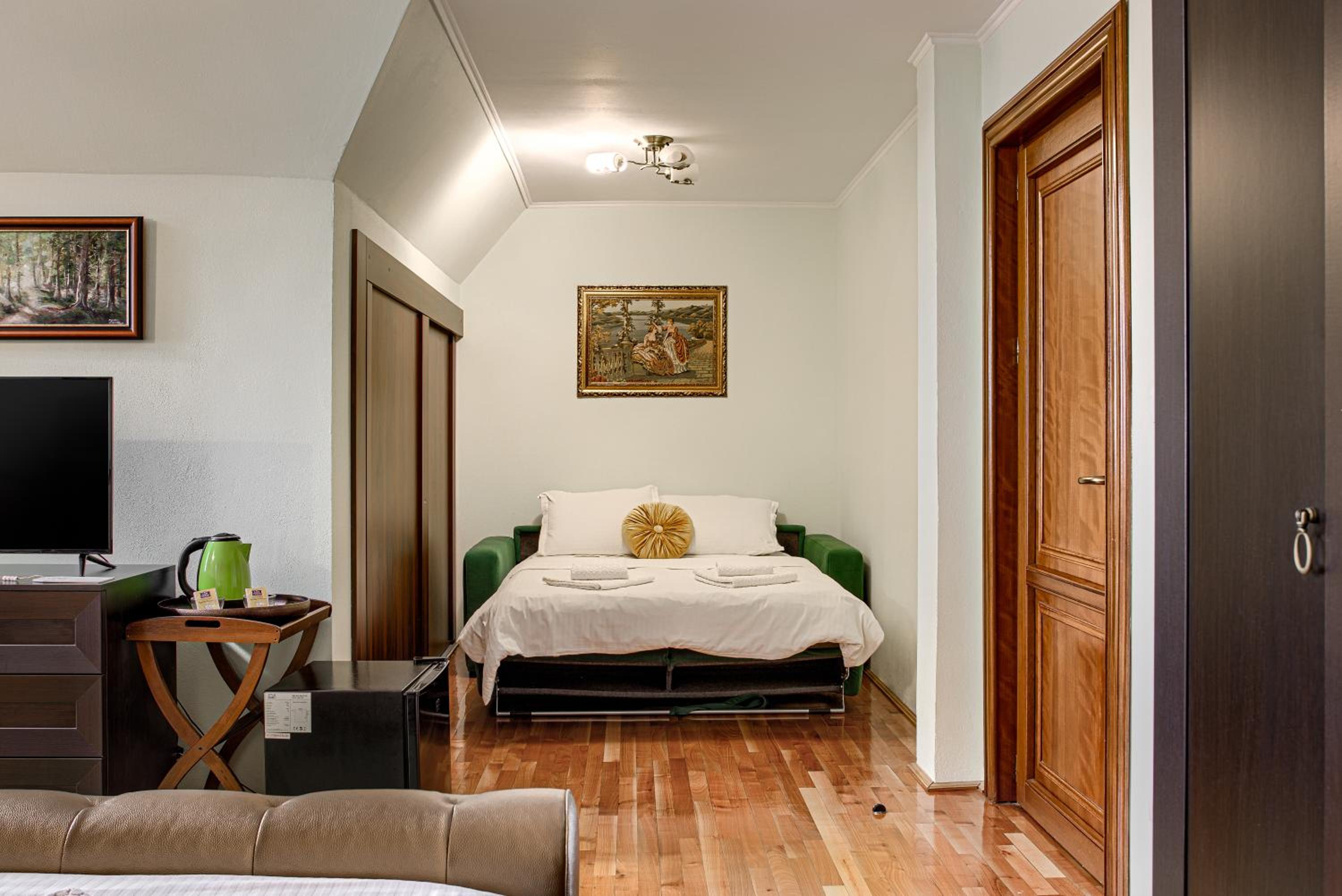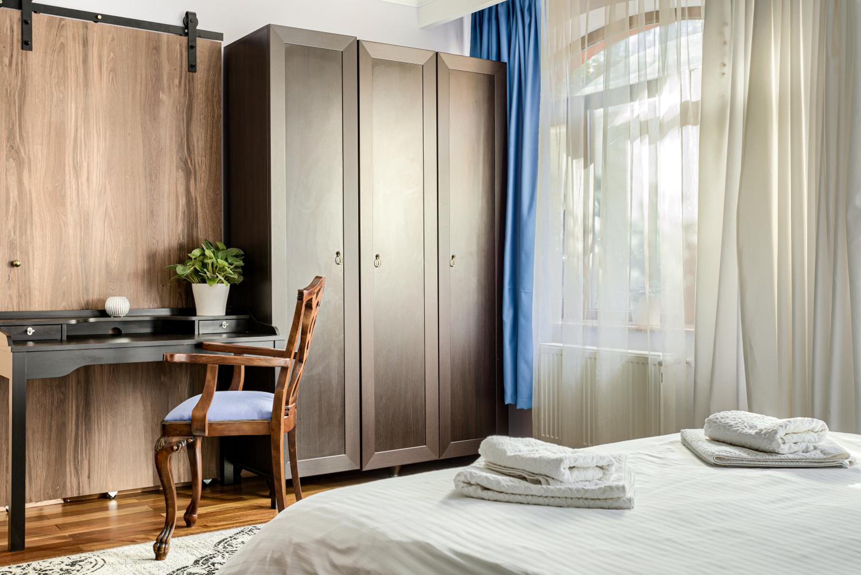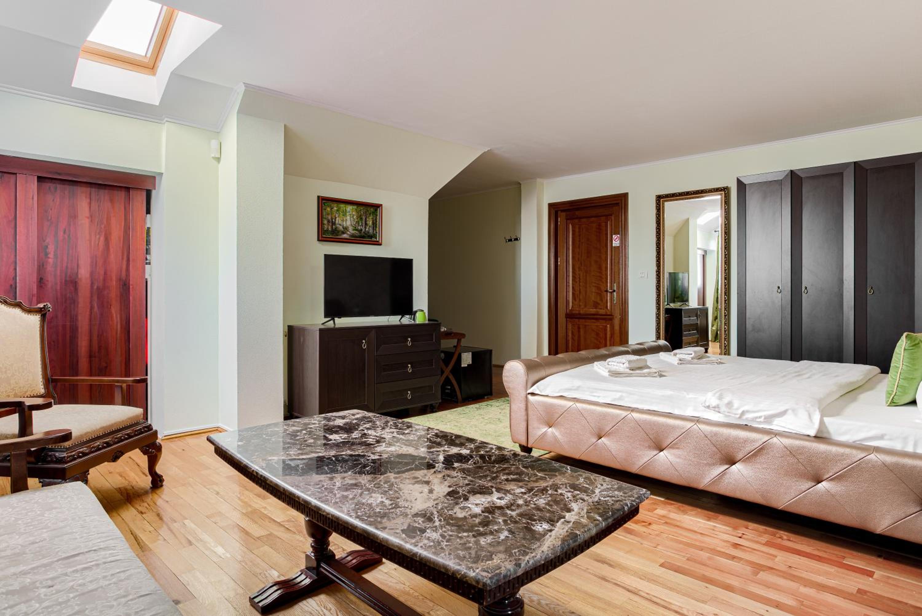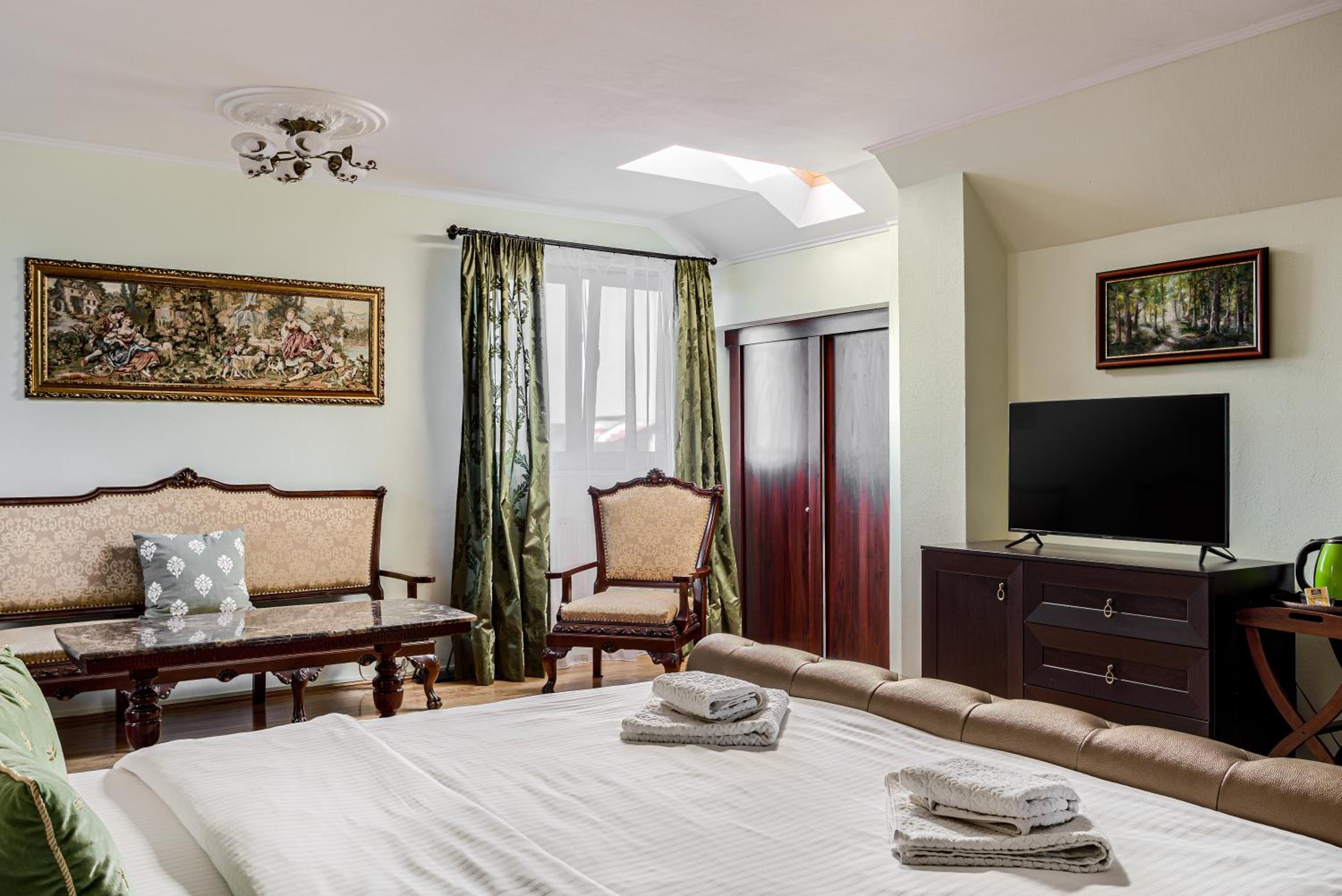 Although on the outskirts of the city, the place is beautiful and picturesque. The courtyard is large, well organized, you can park inside. With a taxi you can reach the center quite quickly. A taxi is recommended, because in the vicinity there is a not so friendly neighborhood (but not in close vicinity but around 1 km away).
