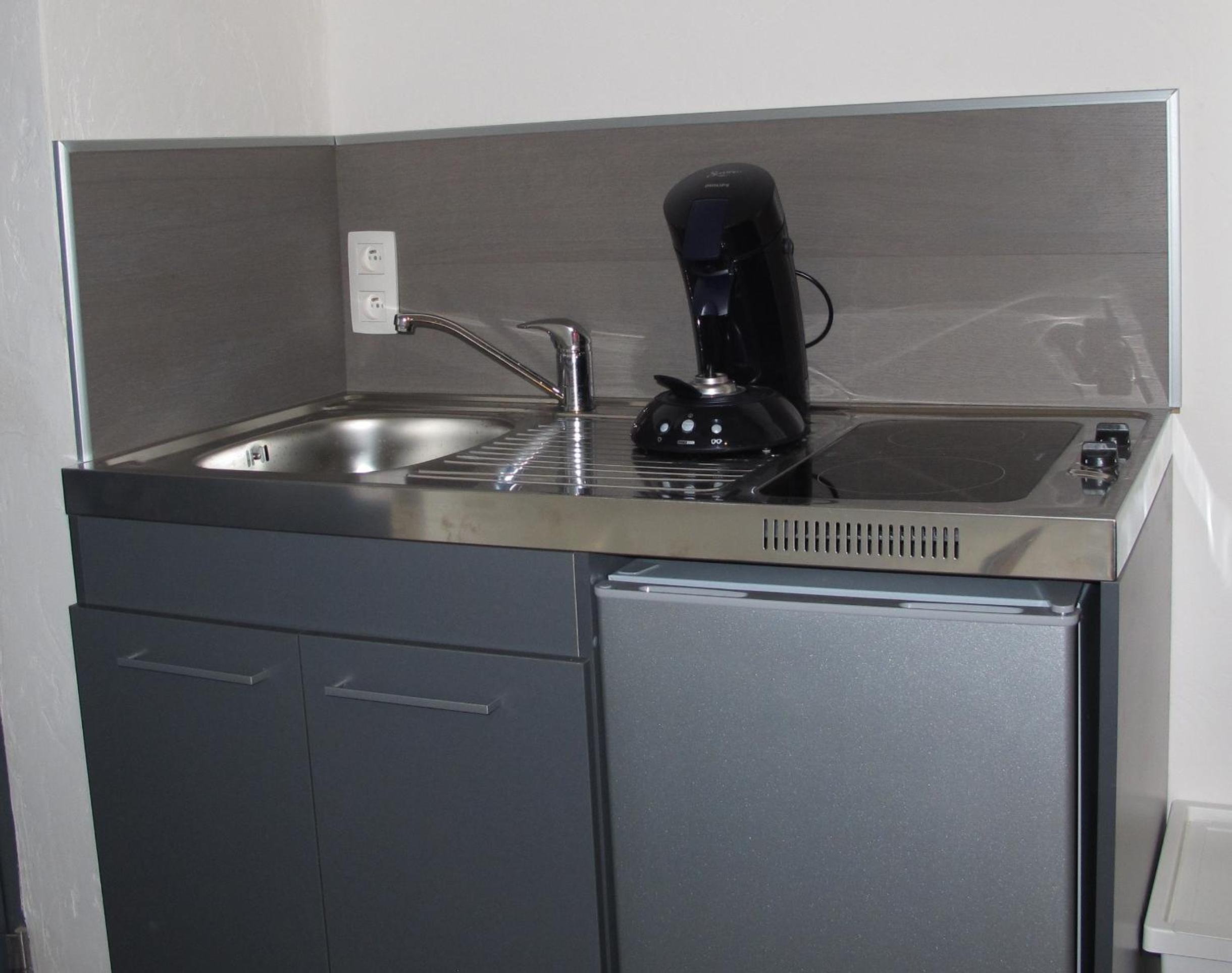 Extrem kleine Küche; weder Backofen noch Mikrowelle und kein Licht auf der Küchenzeile.