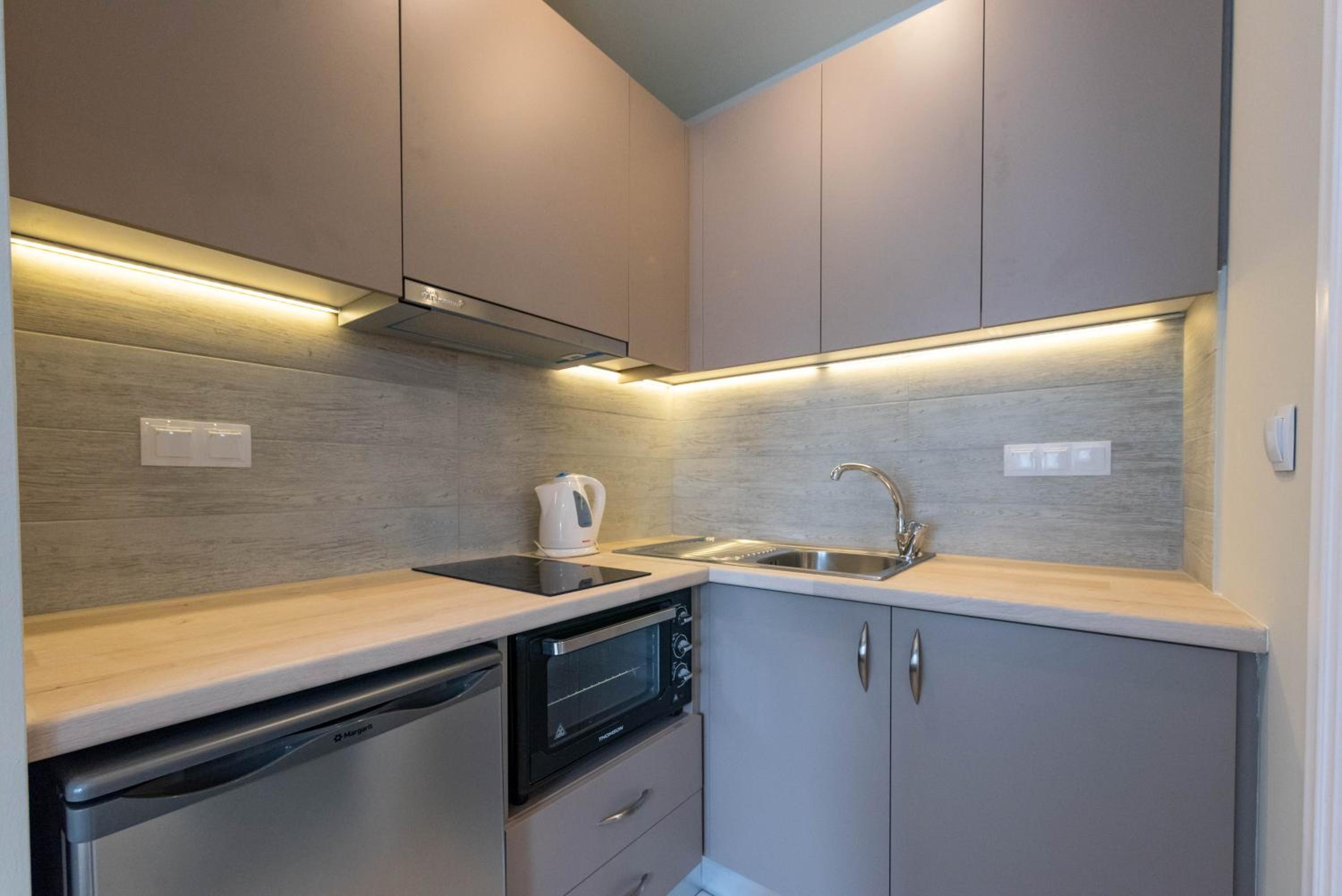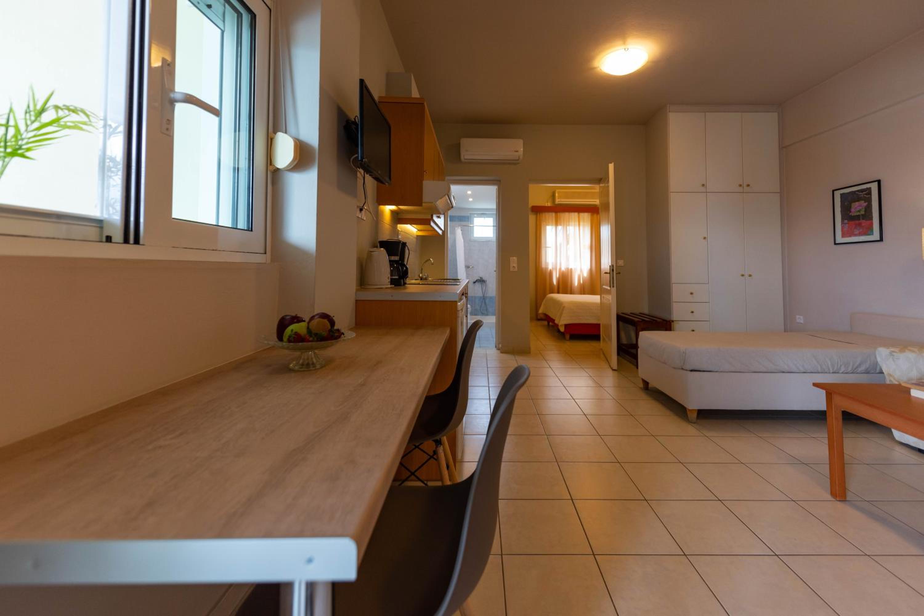 The hotel offers air-conditioned rooms and apartments equipped with modern facilities such as TVs, fully equipped kitchens, orthopaedic mattresses, and in-room safes. Daily room and maid service ensure a comfortable and hassle-free stay for all guests.