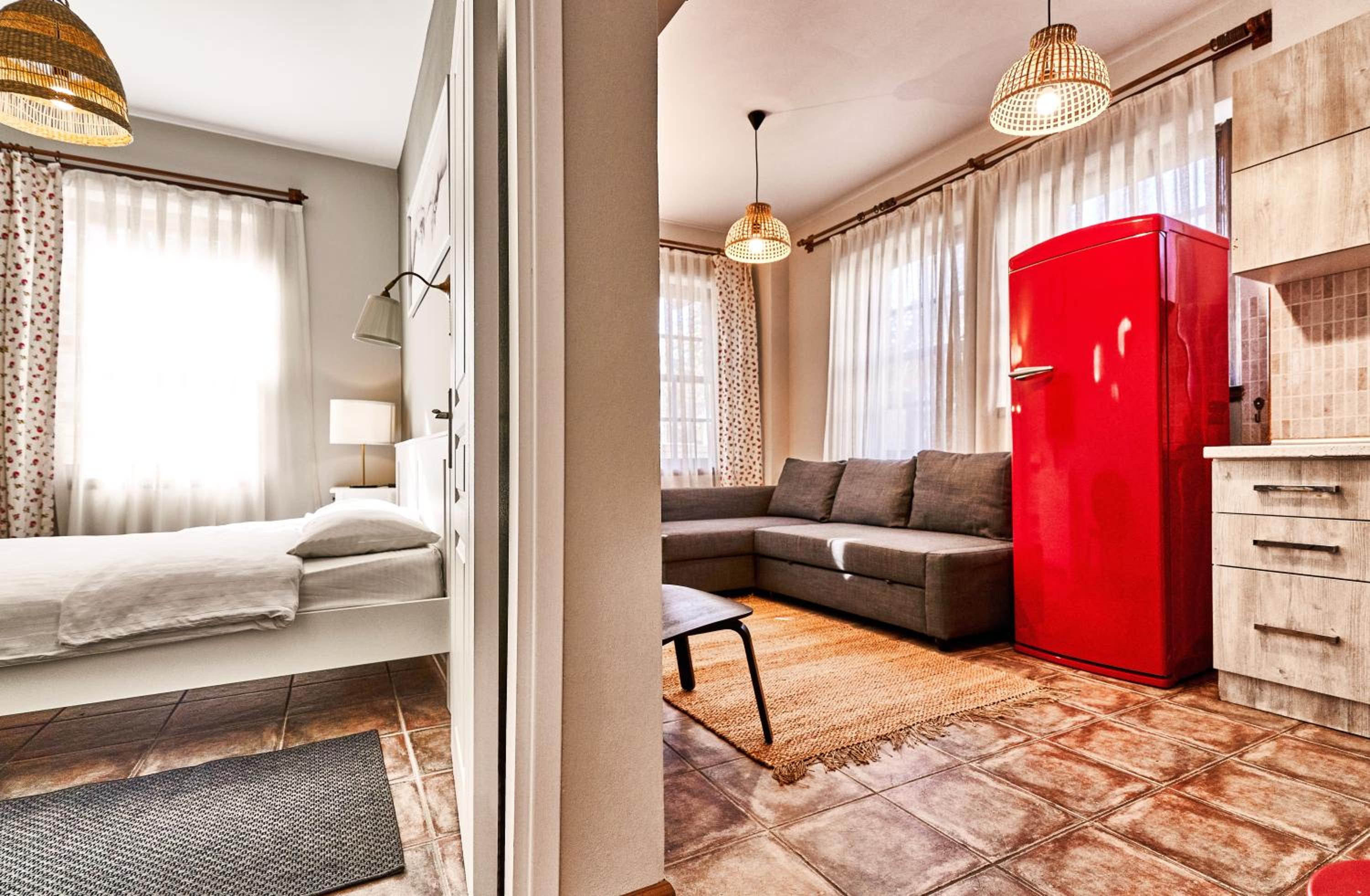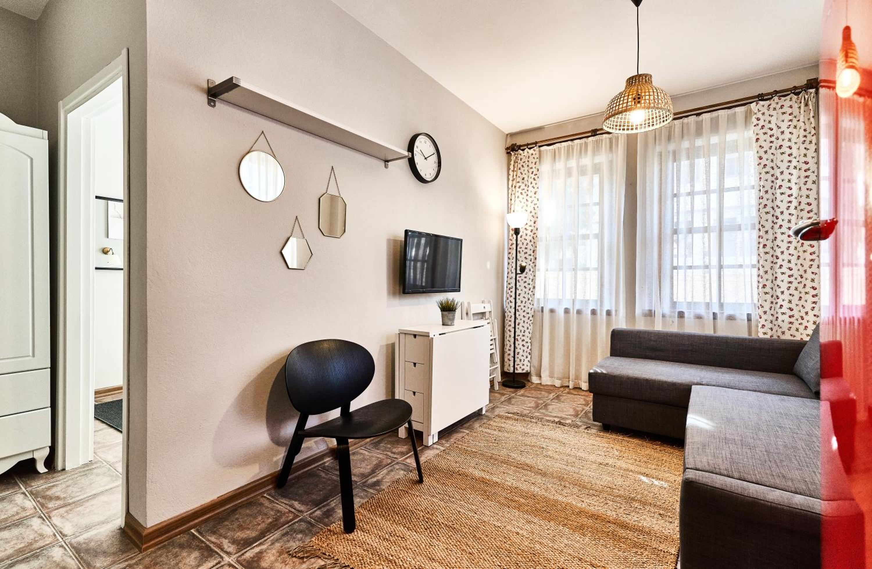 Not very ergonomic: the kitchen is very small and it's difficult to cook anything there, and there's nowhere to hang or put things in the bathroom. There were problems with the kettle. In the area with the sofa, it would be nice to add a small open cupboard or something similar.