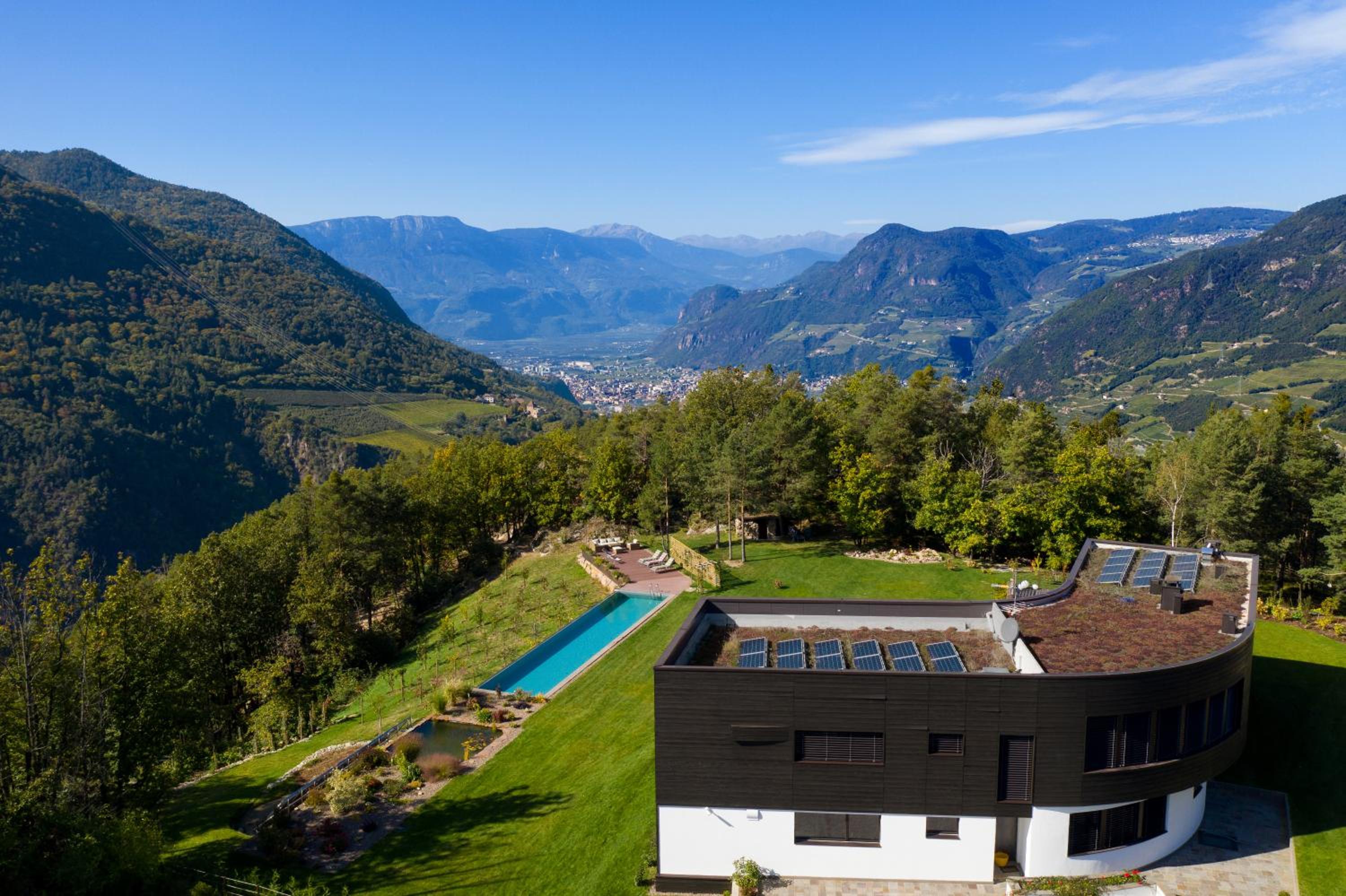 VILLA COLLINA VERDE offers a sustainable aparthotel experience in Bolzano, featuring a pool with breathtaking mountain views and a balcony overlooking a picturesque lake.