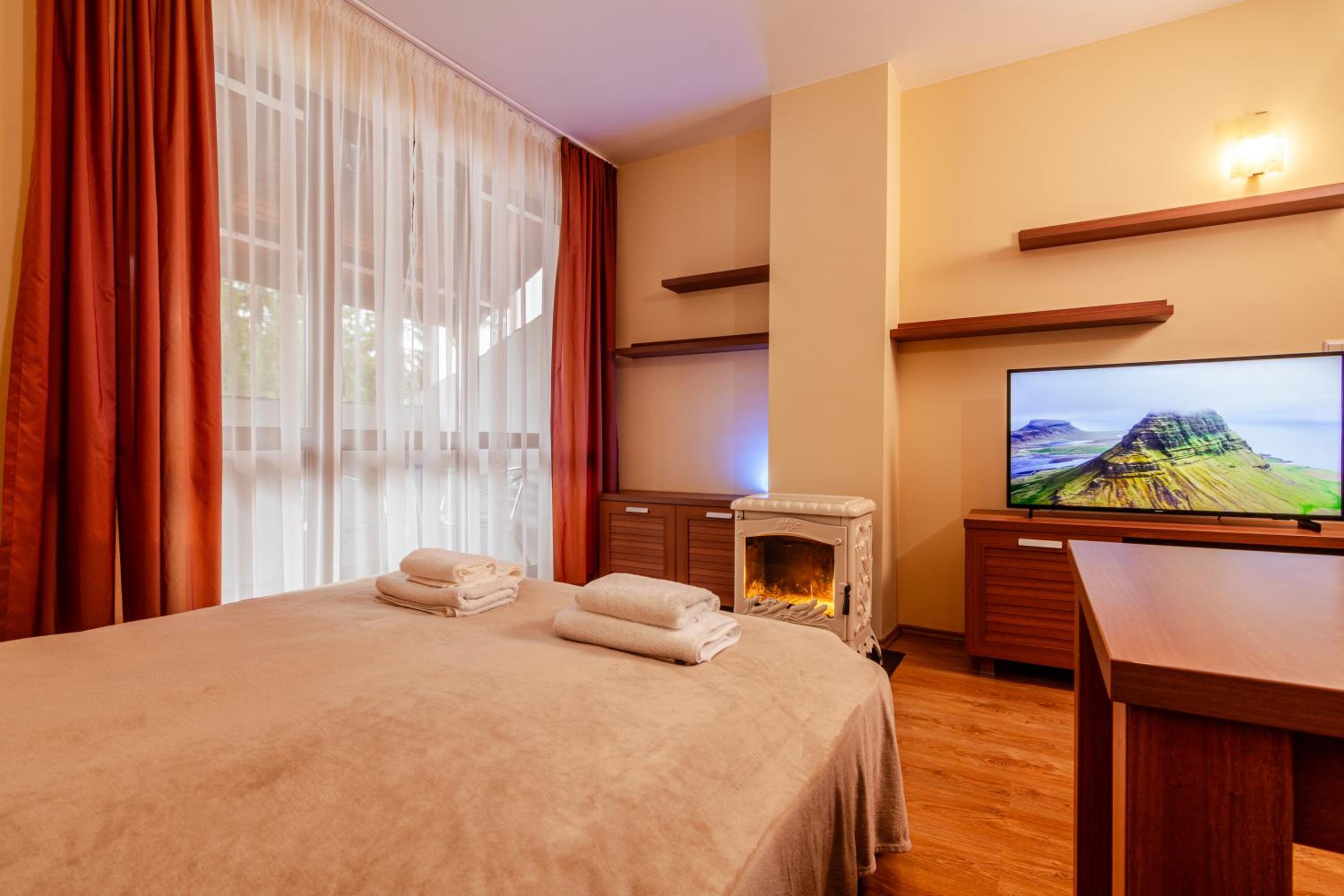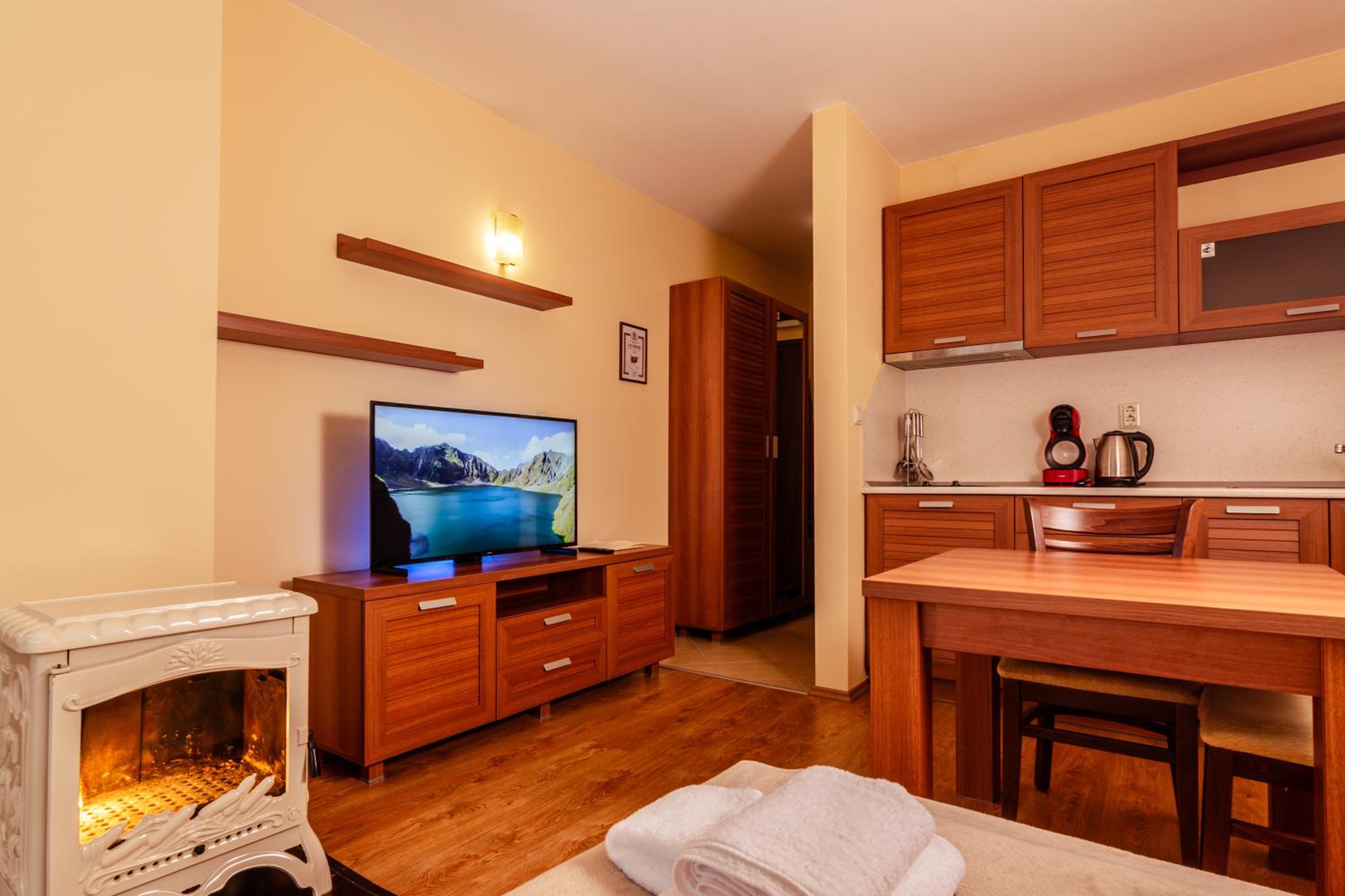 Luxurious Amenities: Enjoy a spacious aparthotel with a flat-screen TV, fully equipped kitchen, and a cozy fireplace. The private bathroom comes with complimentary toiletries and a hair dryer for your convenience.