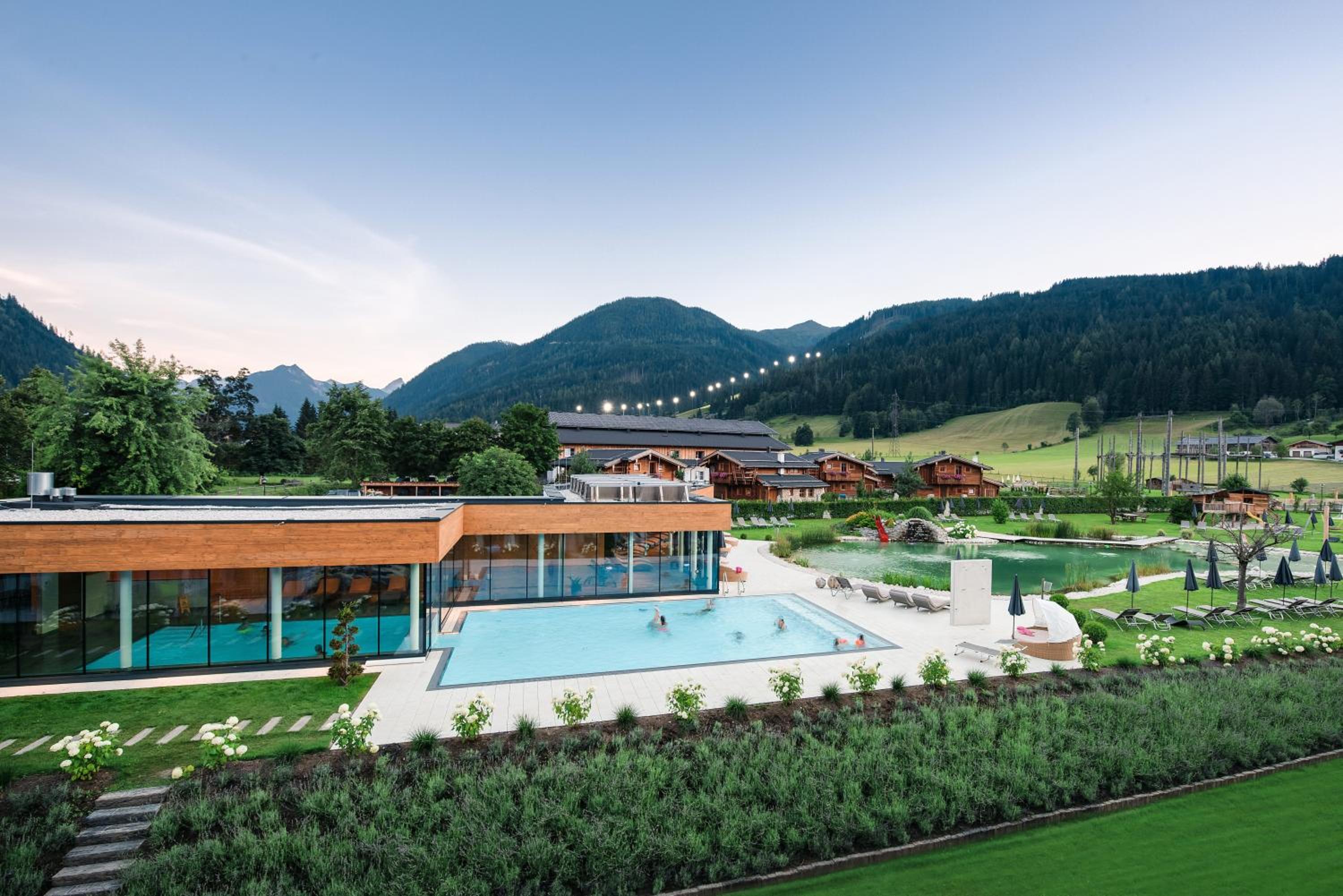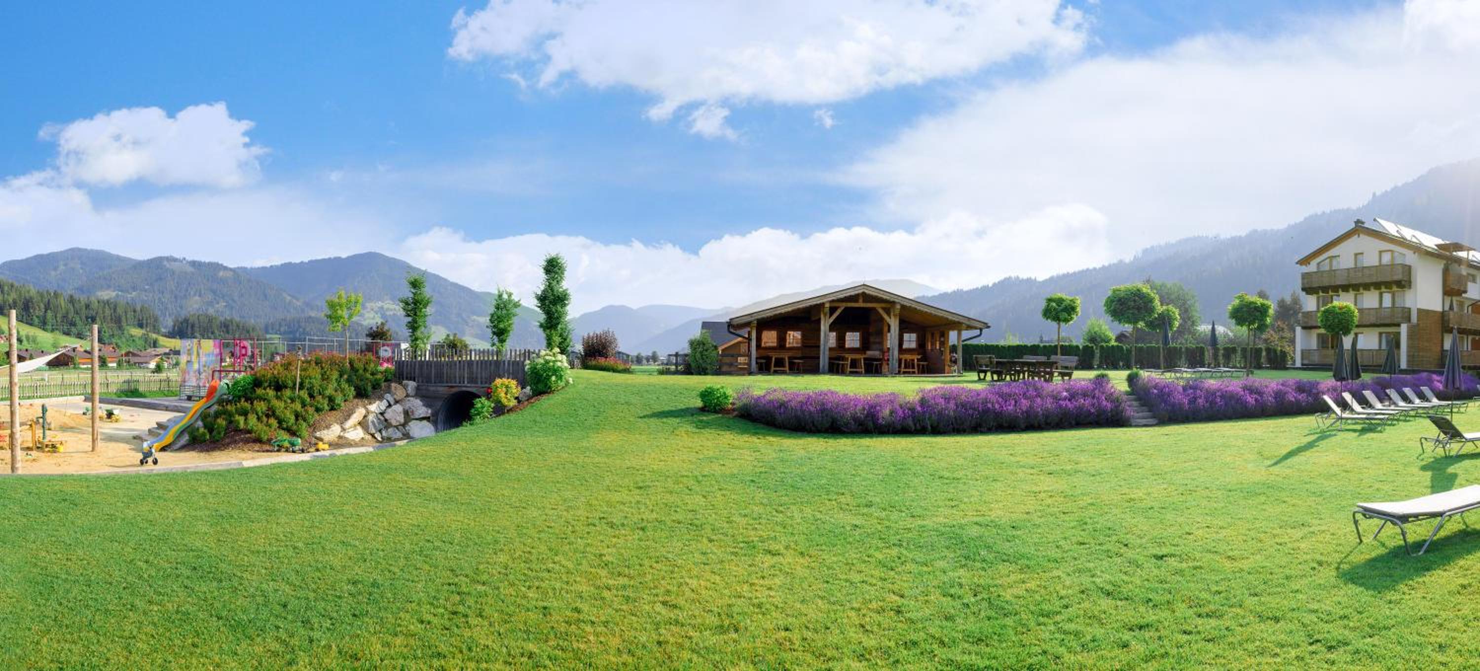 Unwind in the expansive garden featuring a 5,000 m² sunbathing lawn and a 700 m² swimming pond. Families will appreciate the children's playground, making it the perfect retreat for guests of all ages.