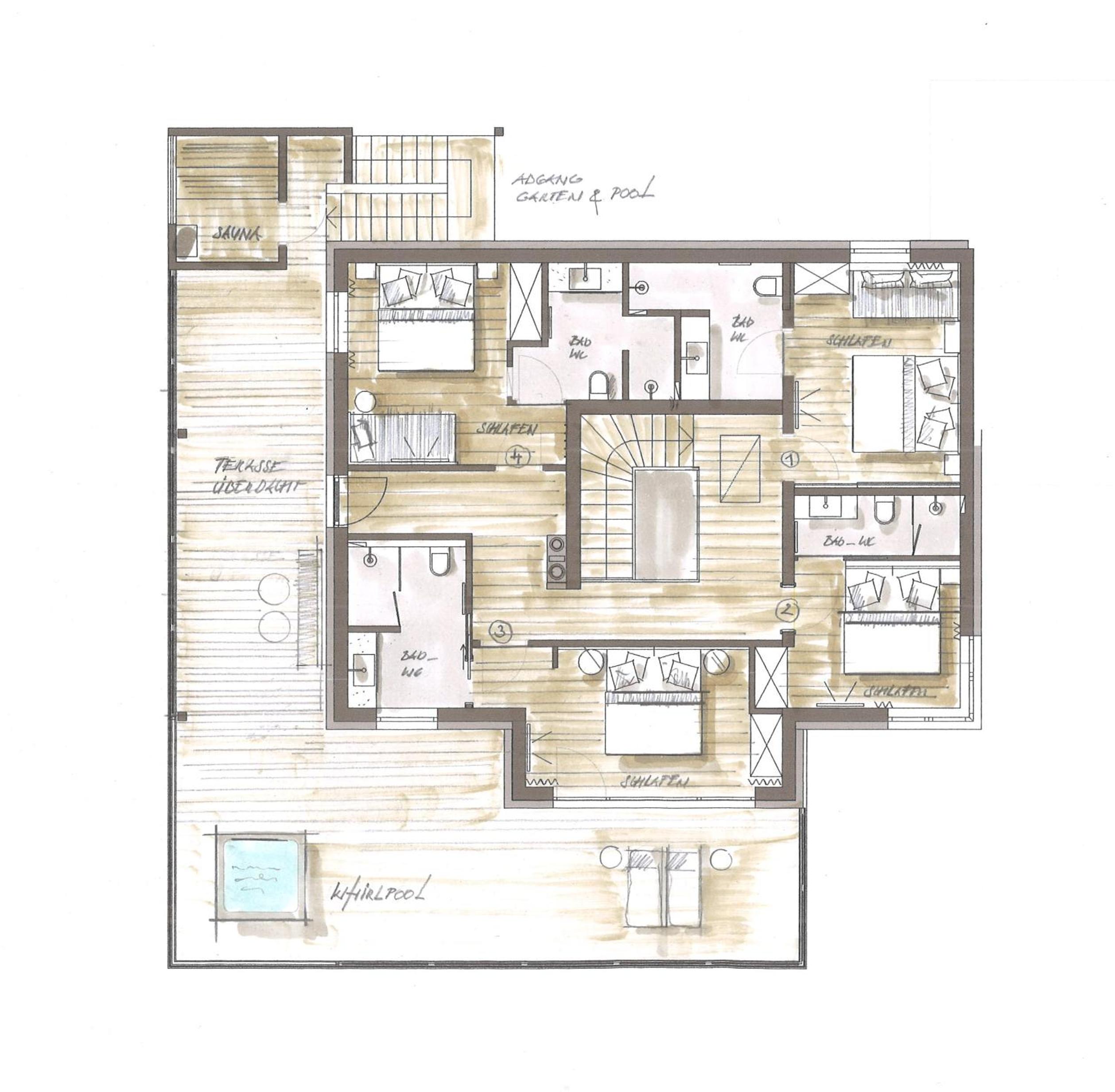 Schönes Appartement mit Kpchenzeile, Herd und Mikrolwelle. Bad und WC zu jedem Zimmer, sowie ein weiteres WC im Wohnvereich. Wunderschöner Wellnessbereich mit Sauna und Hallenbad, wobei man auch bei gleichwarmer Wassertemperatur (gefühlte 33 Grad) ins Freie schwimmen kann., Whirlpool im Außenbereich.