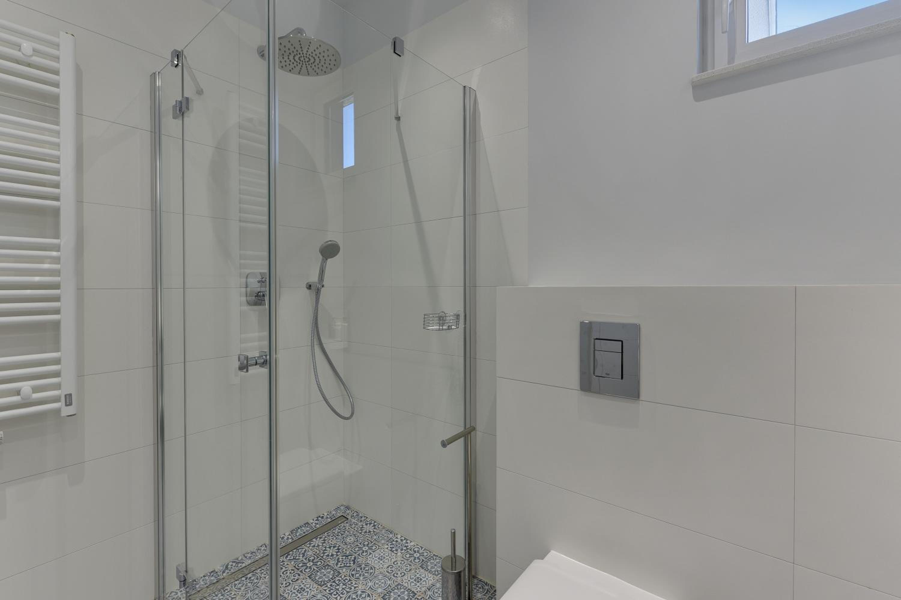 widoczne ślady wilgoci i grzyba pod prysznicem.