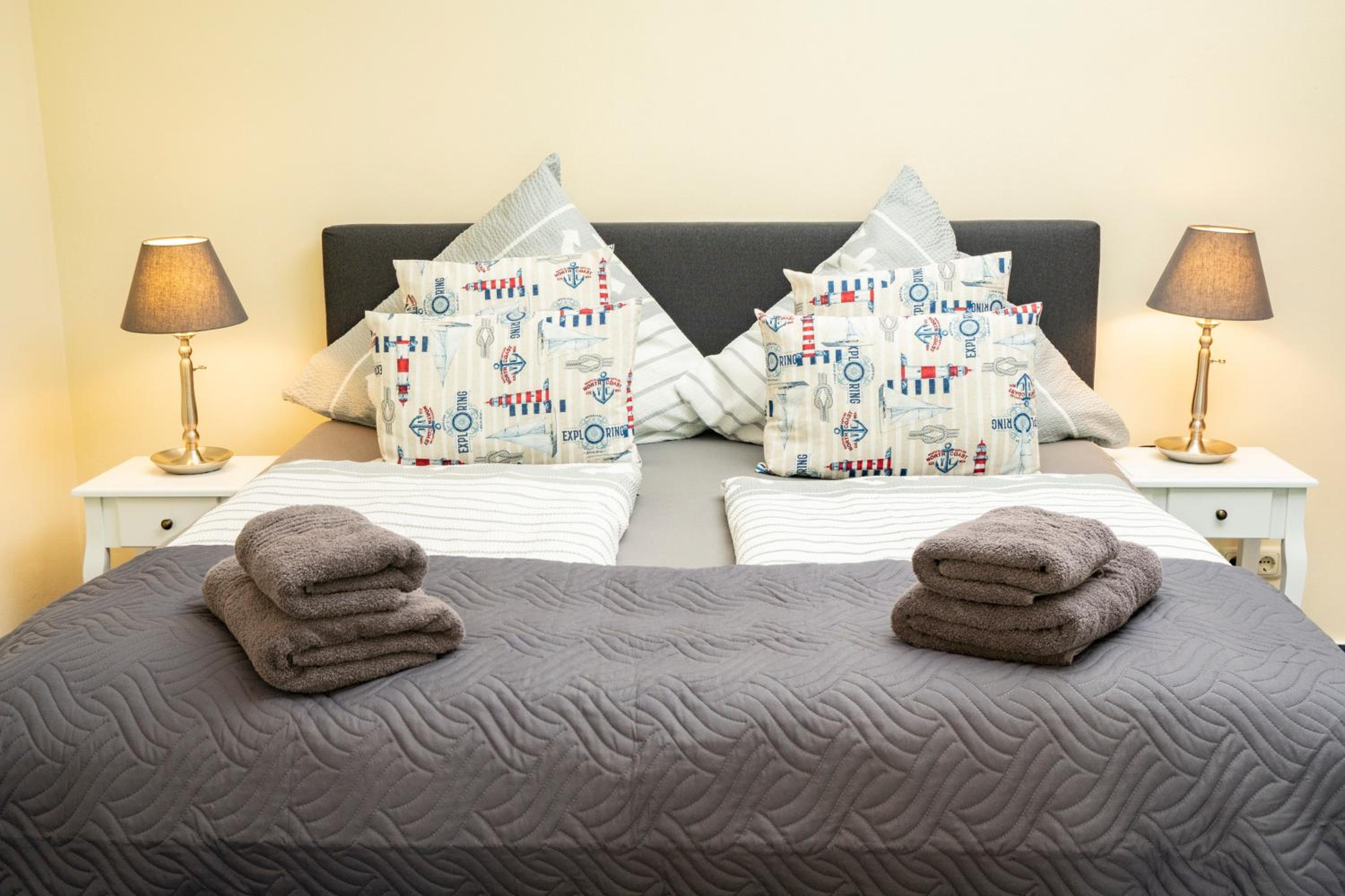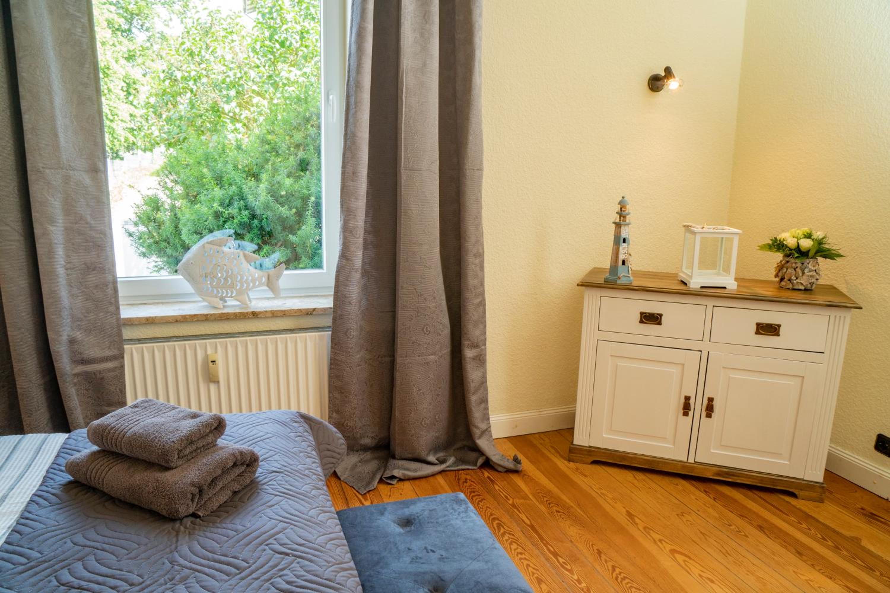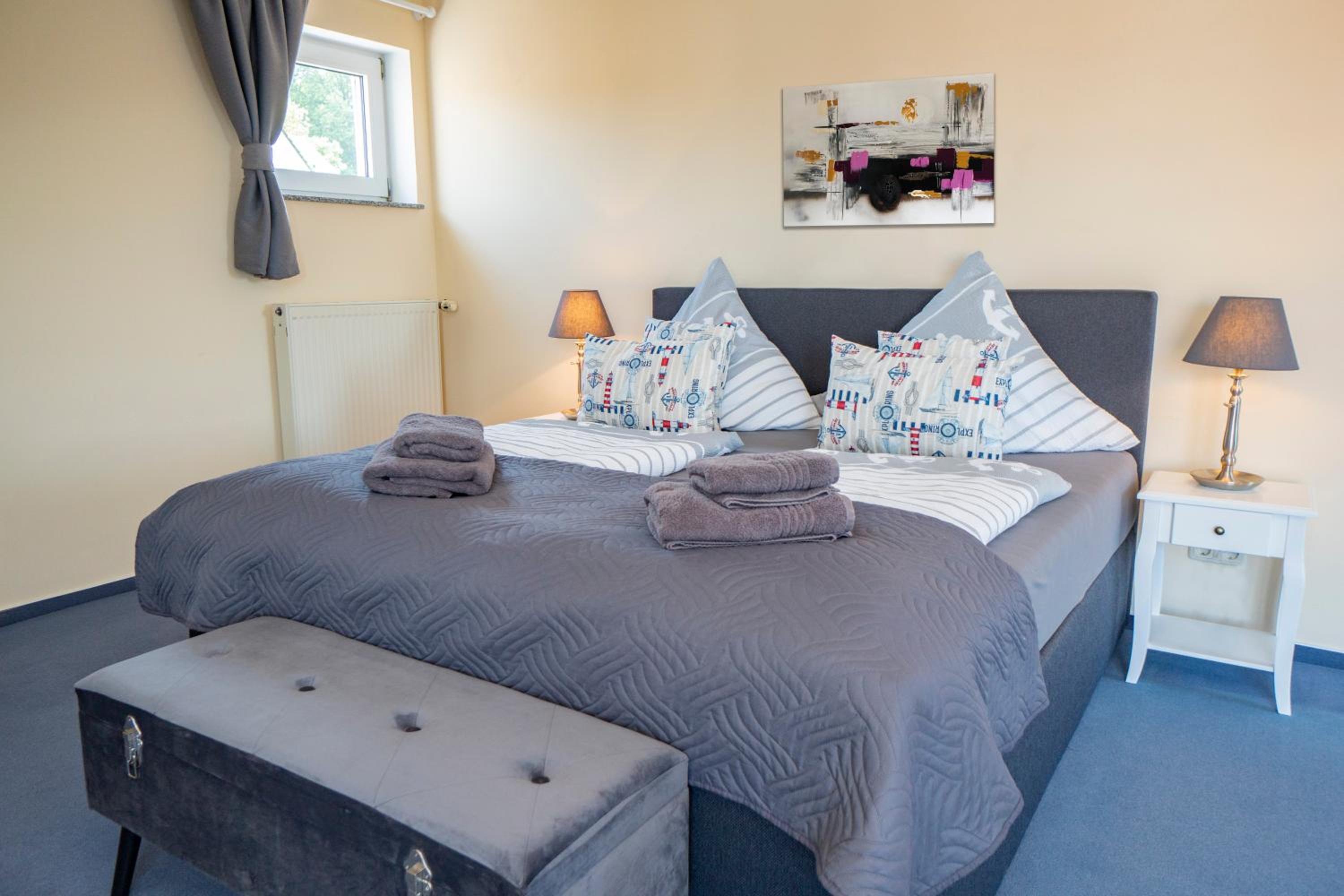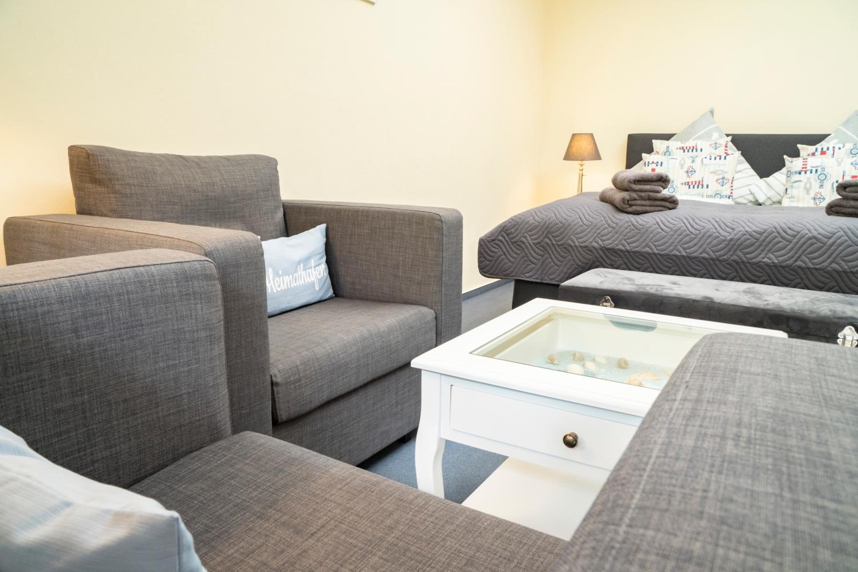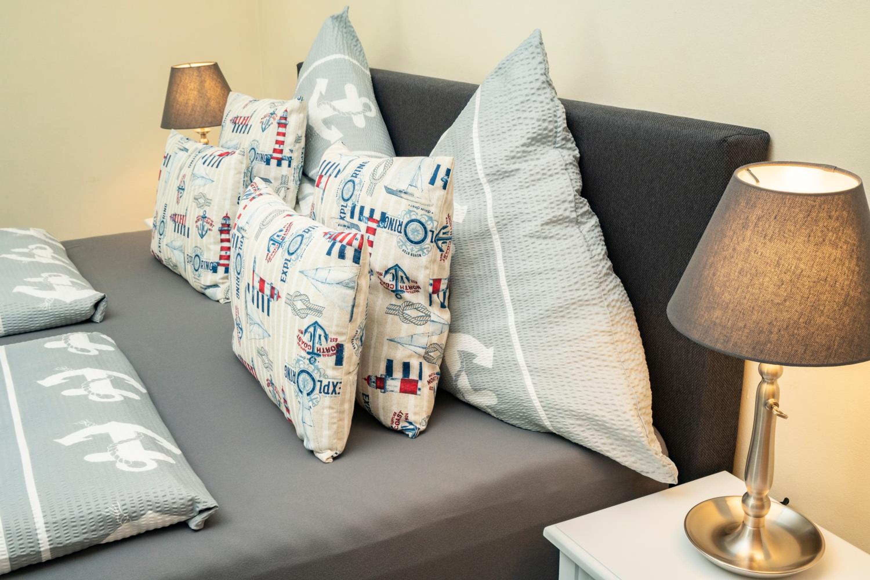 Wir haben den Schlüssel mit Hilfe des Codes aus der Schlüsselbox nehmen können und somit das Zimmer sofort betreten können. Die Ausstattung der Wohnung ist modern im maritimen Stil mit Küchenzeile und Duschbad, und verfügt über ein gemütliches Boxspringbett. In der Nähe gibt es ein gemütliches italienisches Restaurant.