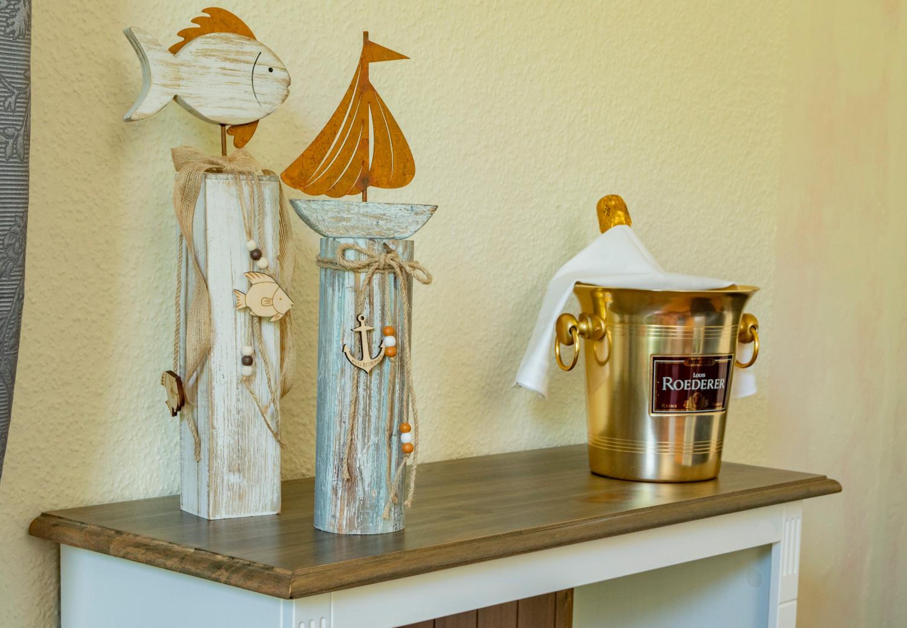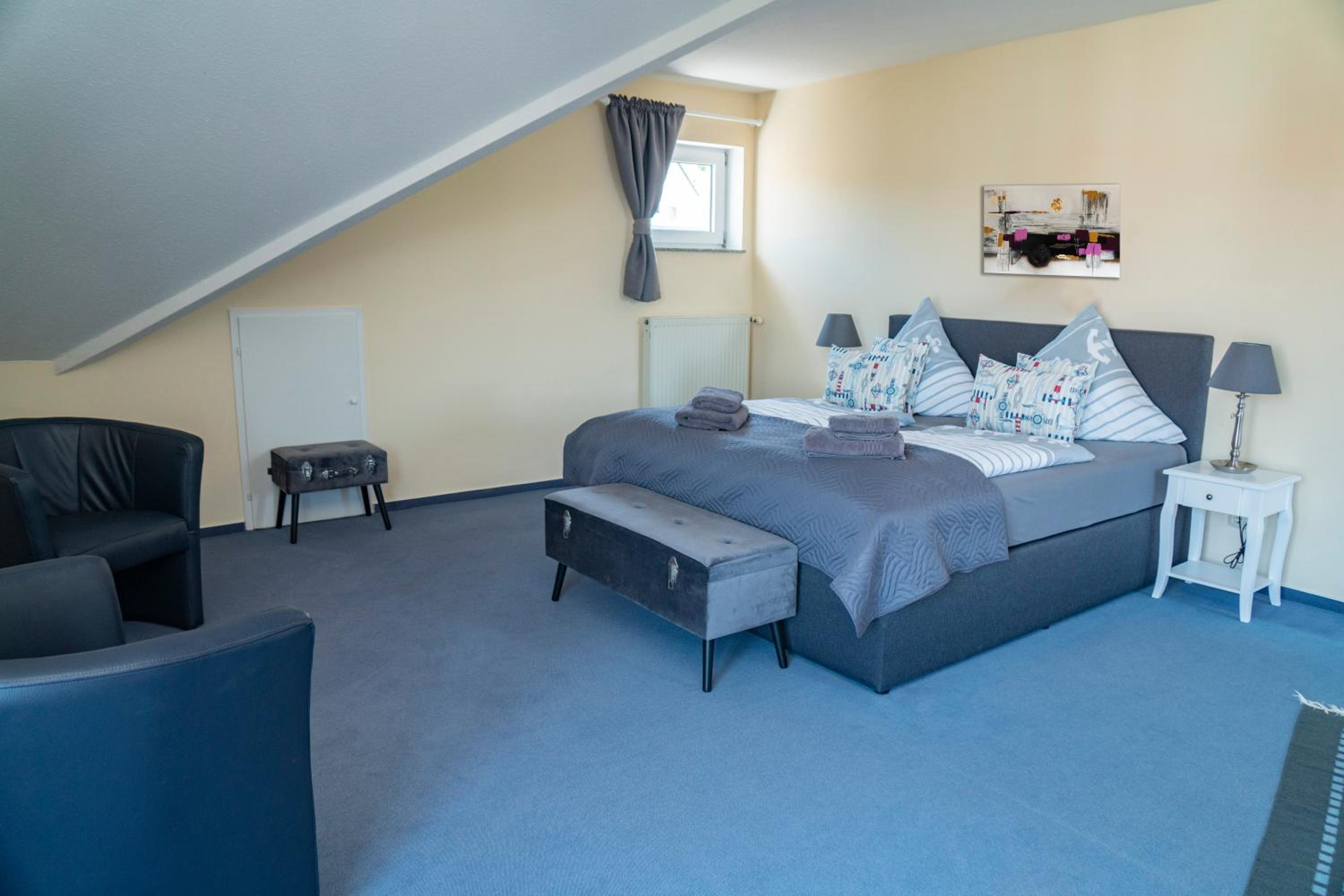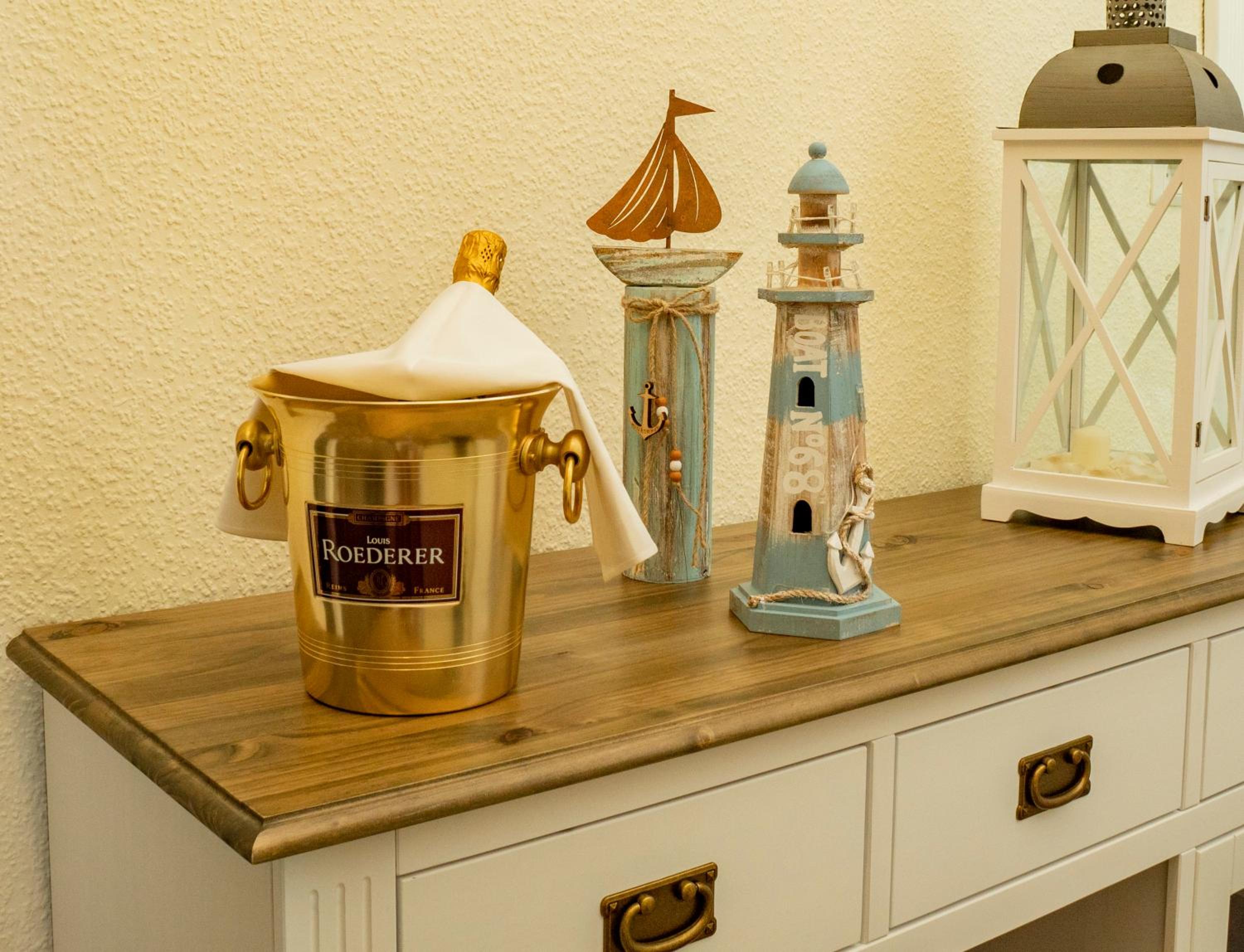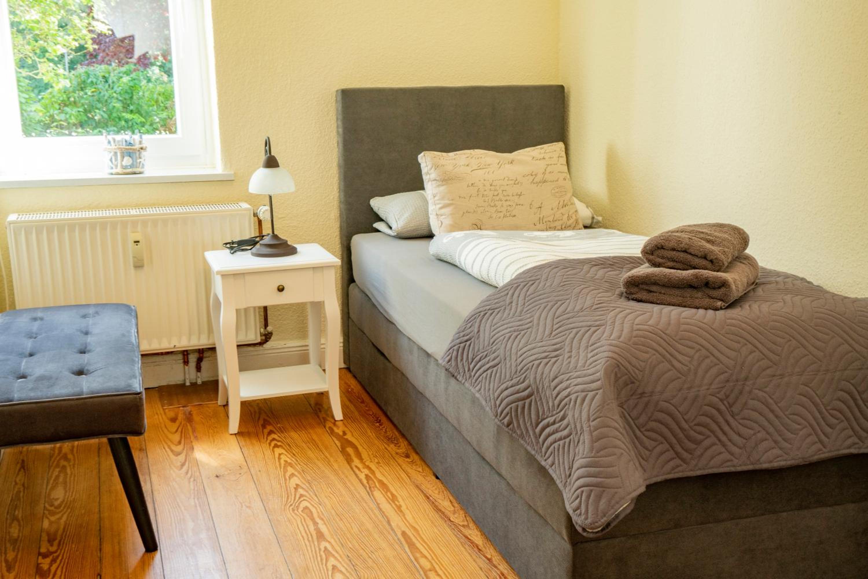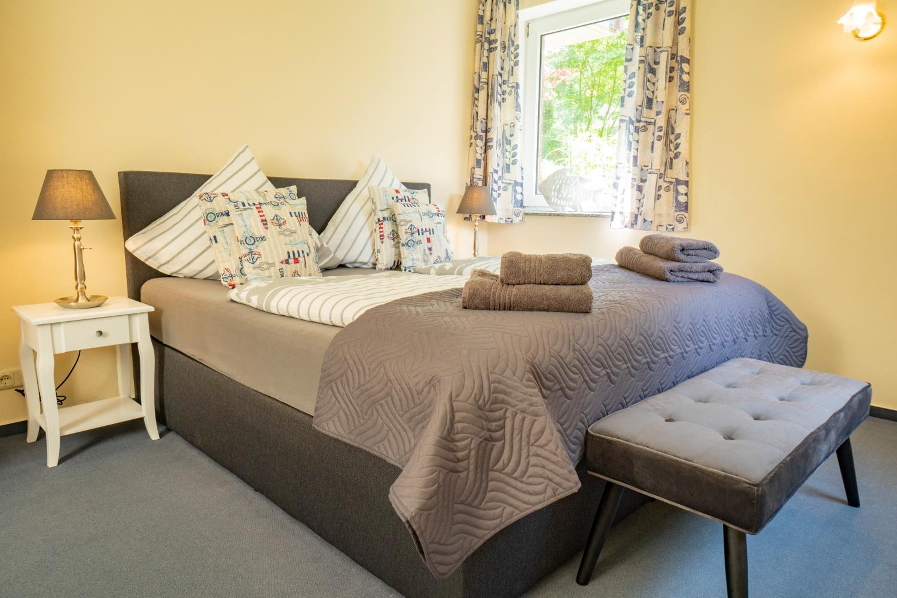 Wir haben den Schlüssel mit Hilfe des Codes aus der Schlüsselbox nehmen können und somit das Zimmer sofort betreten können. Die Ausstattung der Wohnung ist modern im maritimen Stil mit Küchenzeile und Duschbad, und verfügt über ein gemütliches Boxspringbett. In der Nähe gibt es ein gemütliches italienisches Restaurant.