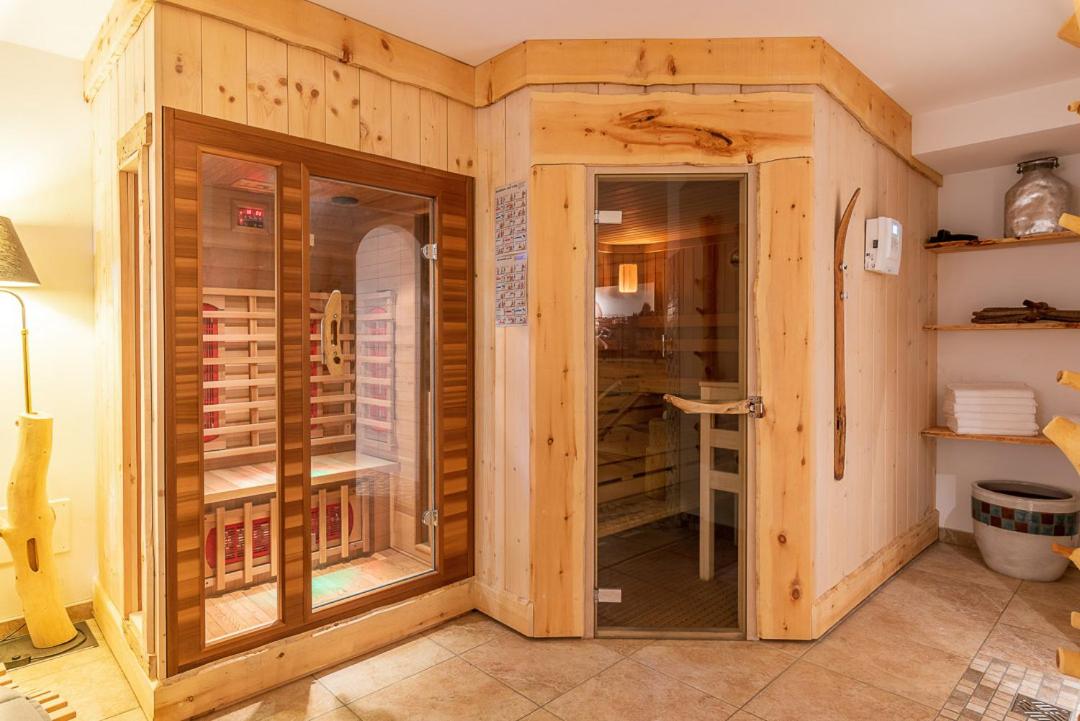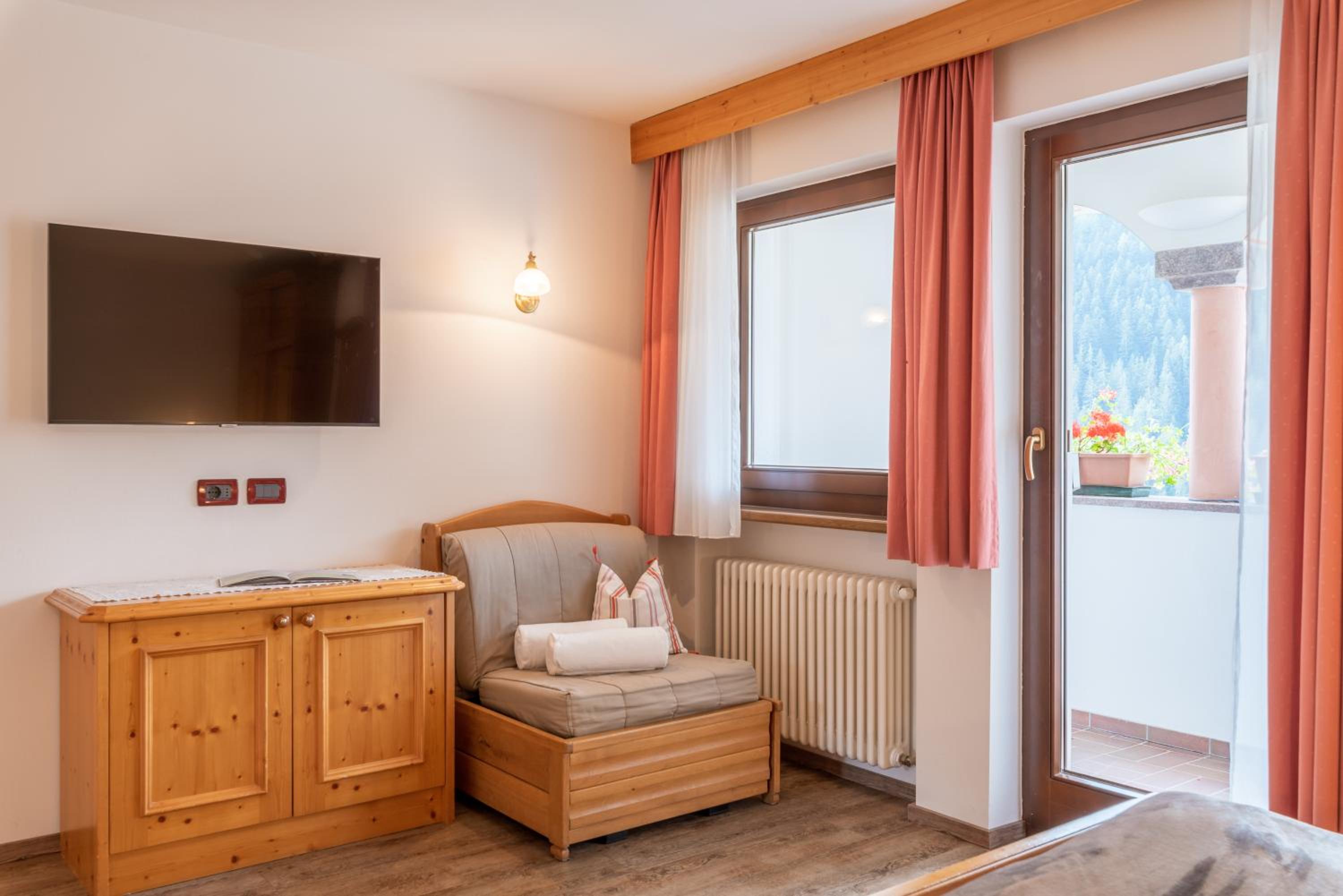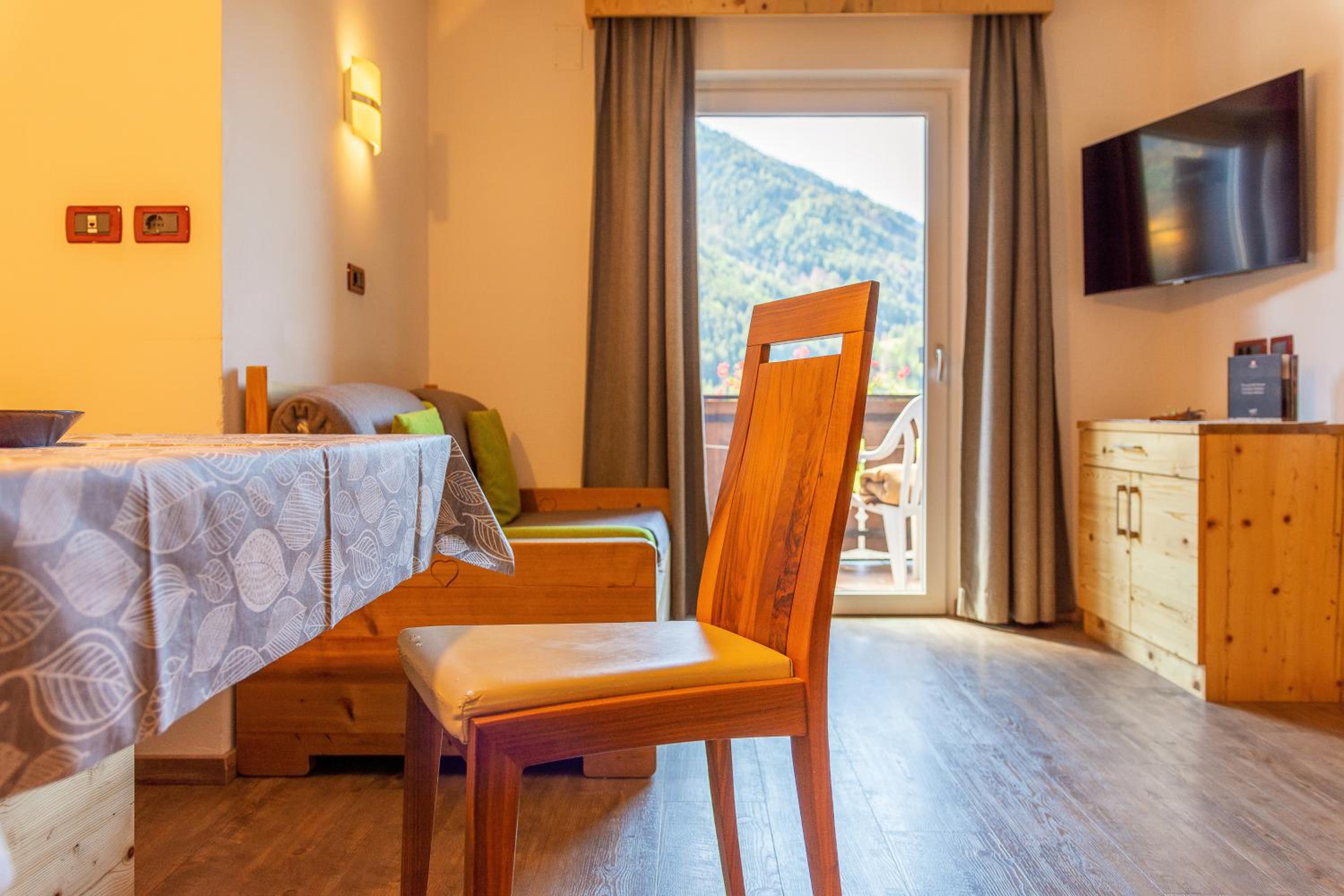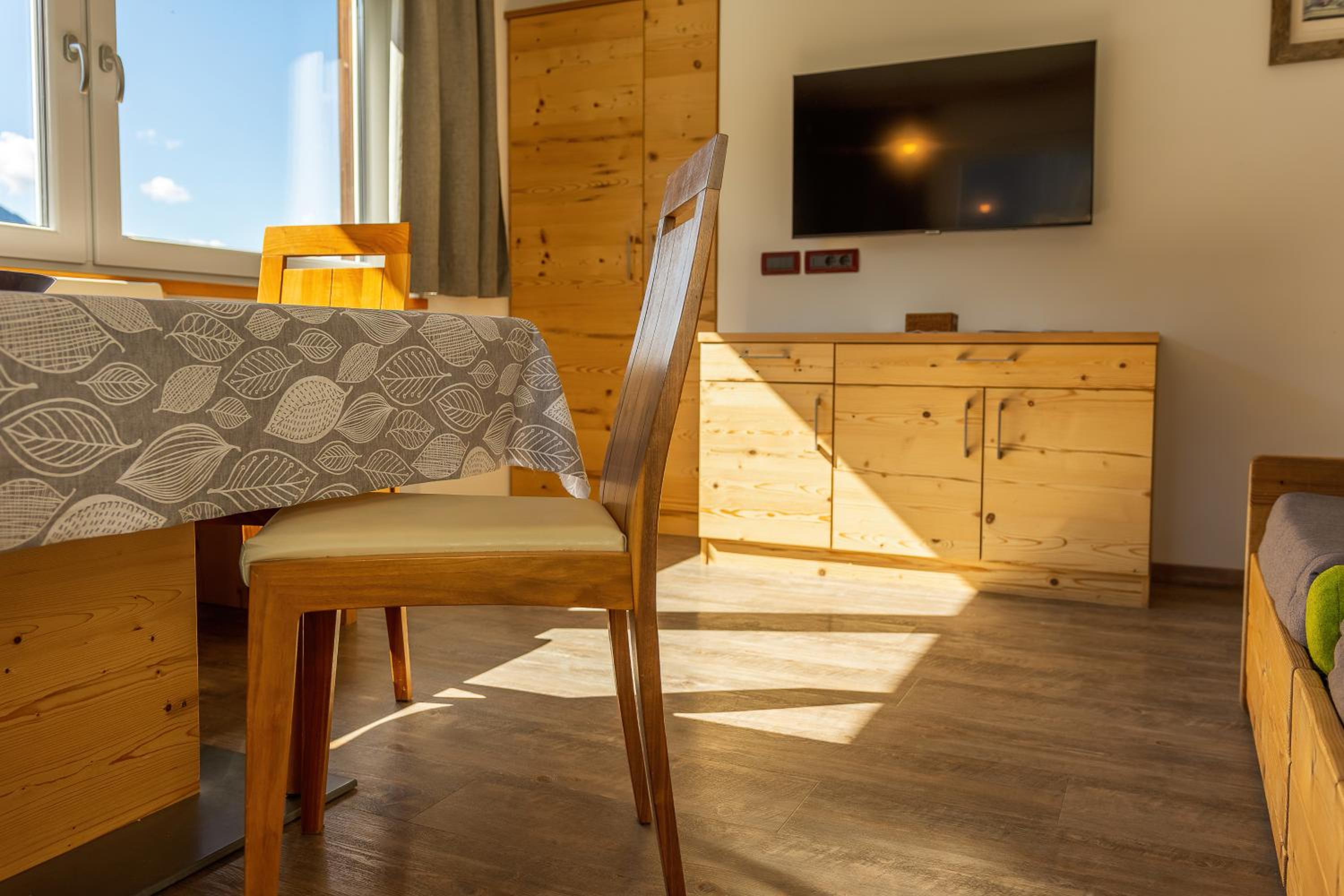 Indulge in the cozy ambiance of wooden furnishings and the warmth of carpeted or parquet floors in our apartments. Unwind while taking in the picturesque views of the garden and mountains from your window. Guests can also access the on-site sauna and sun terrace, perfect for relaxation.
