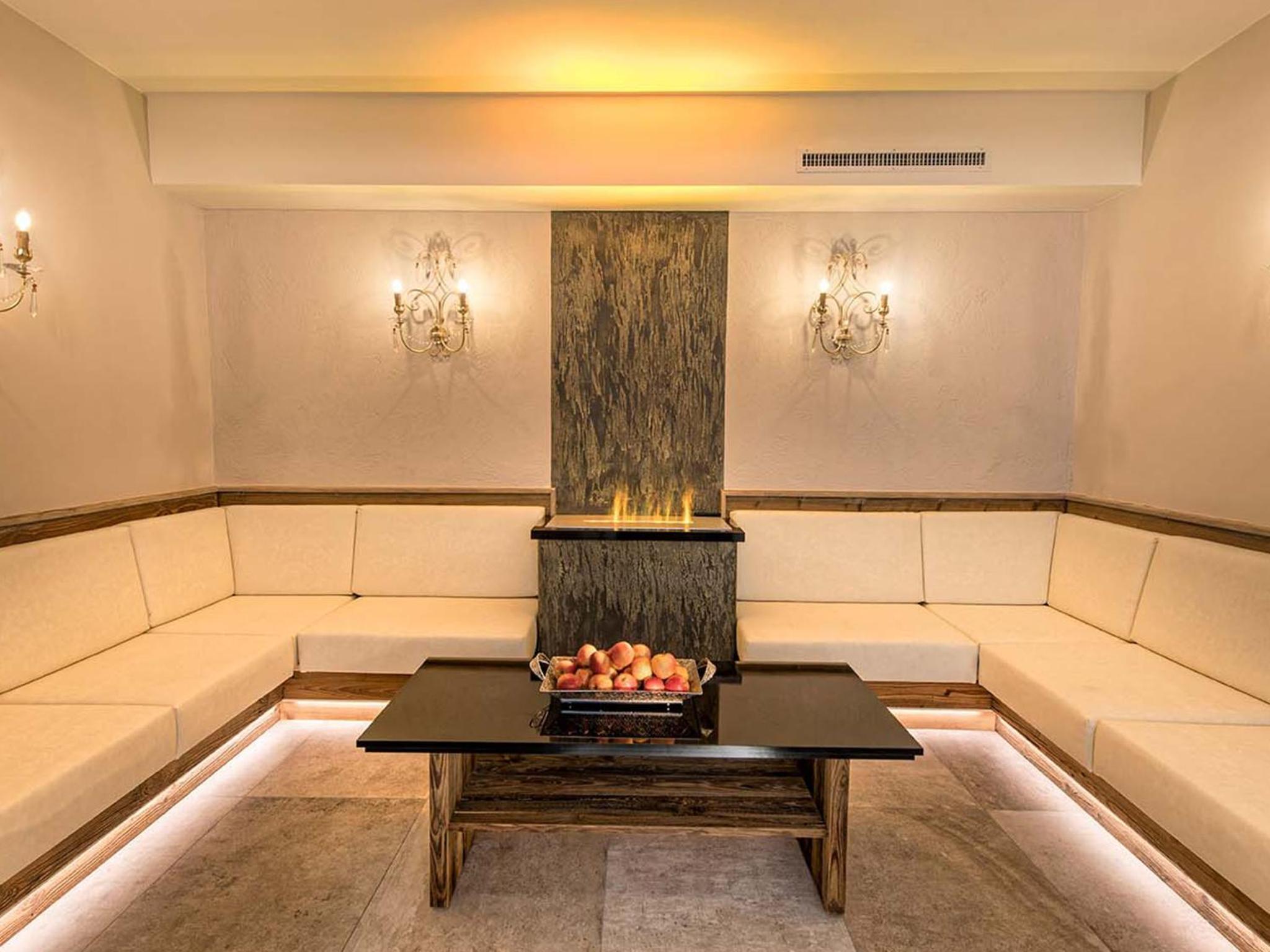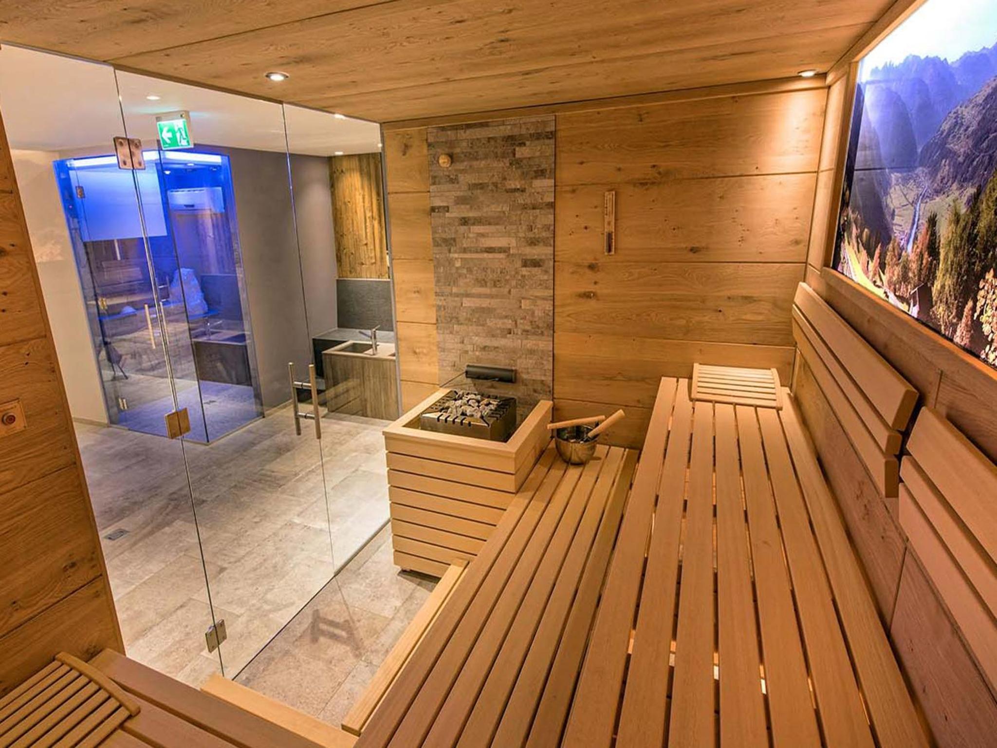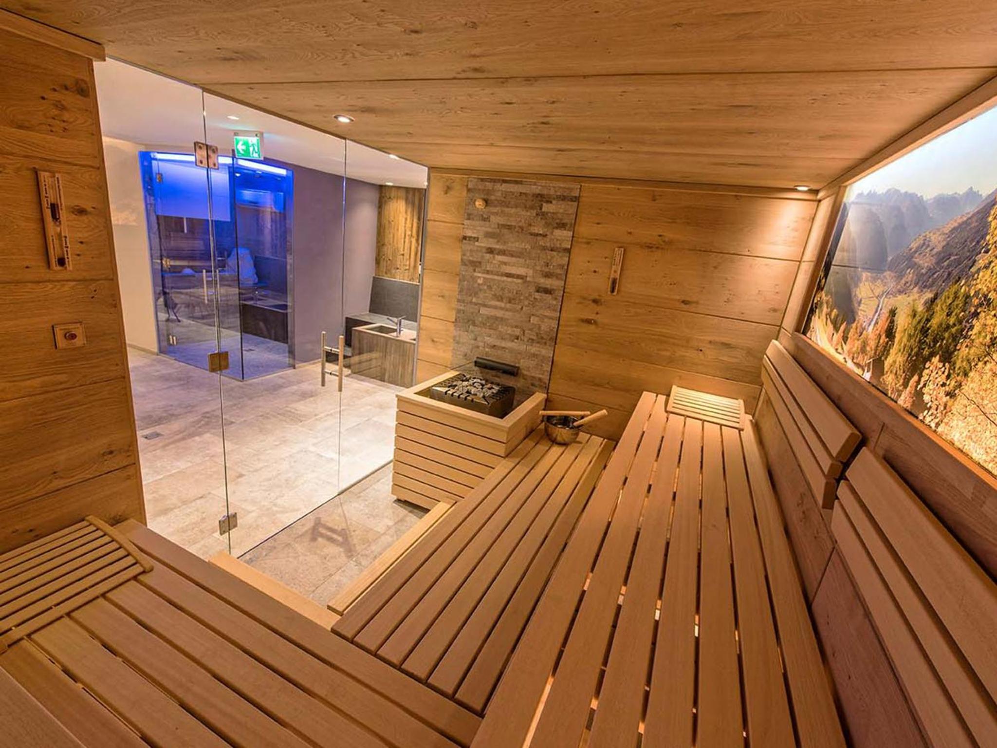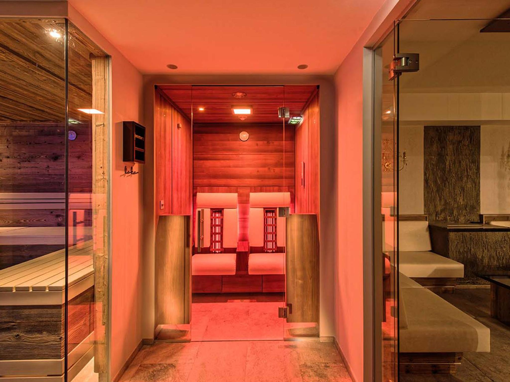 Indulge in relaxation at Hotel Universo's wellness area, offering a sauna, steam bath, and sun bed for the ultimate pampering experience after a day of exploring Serfaus.