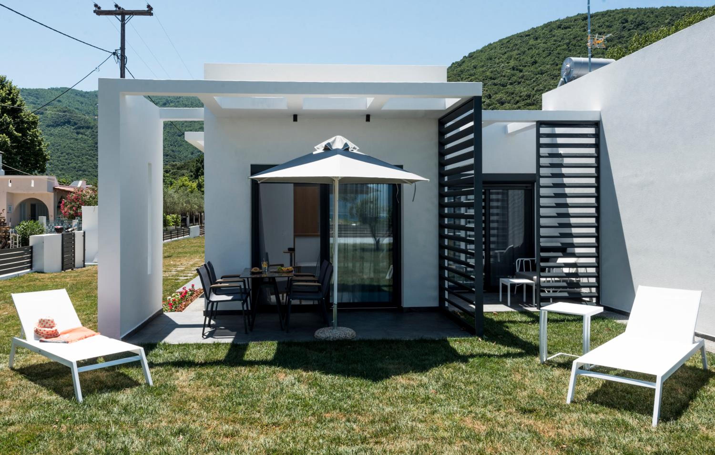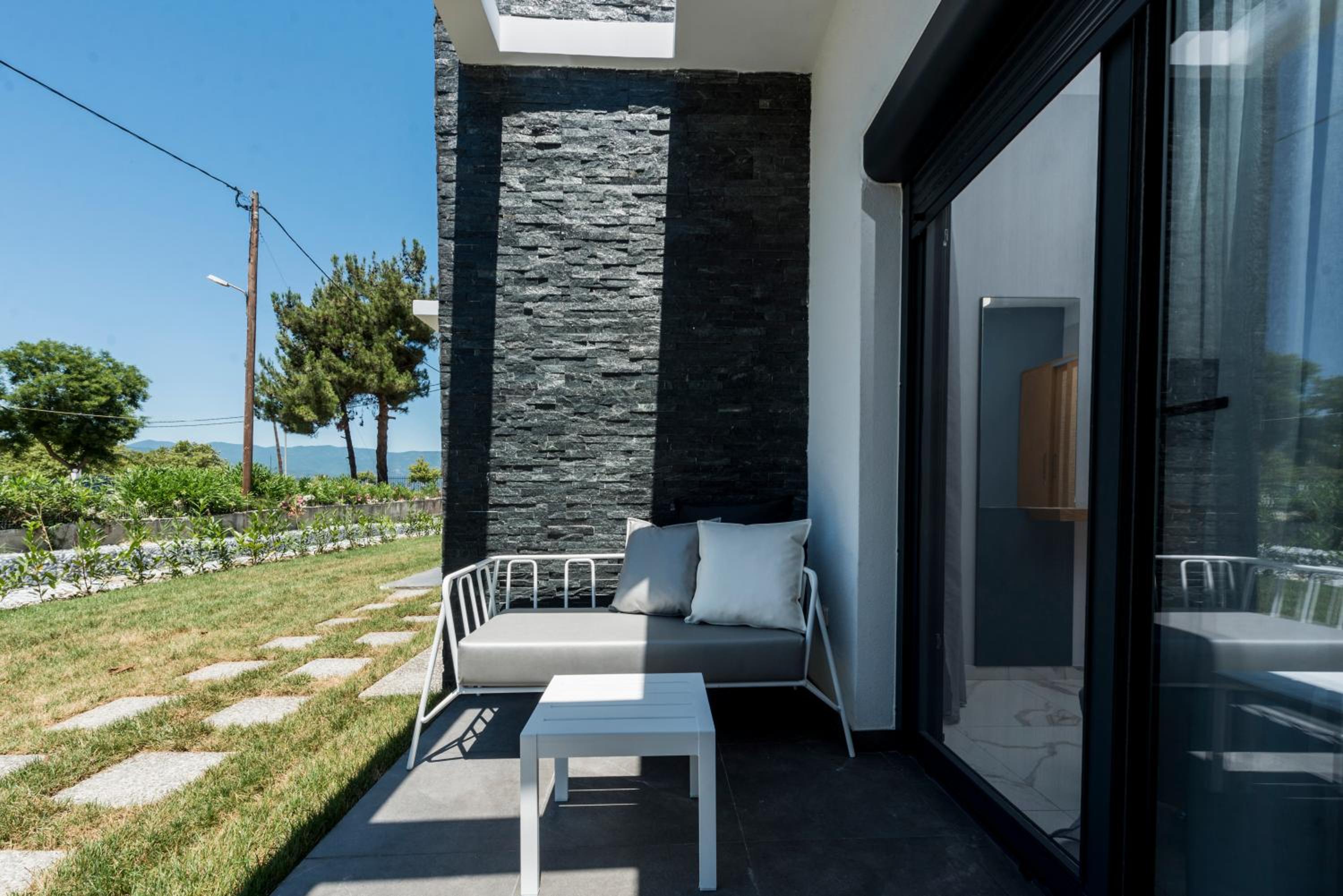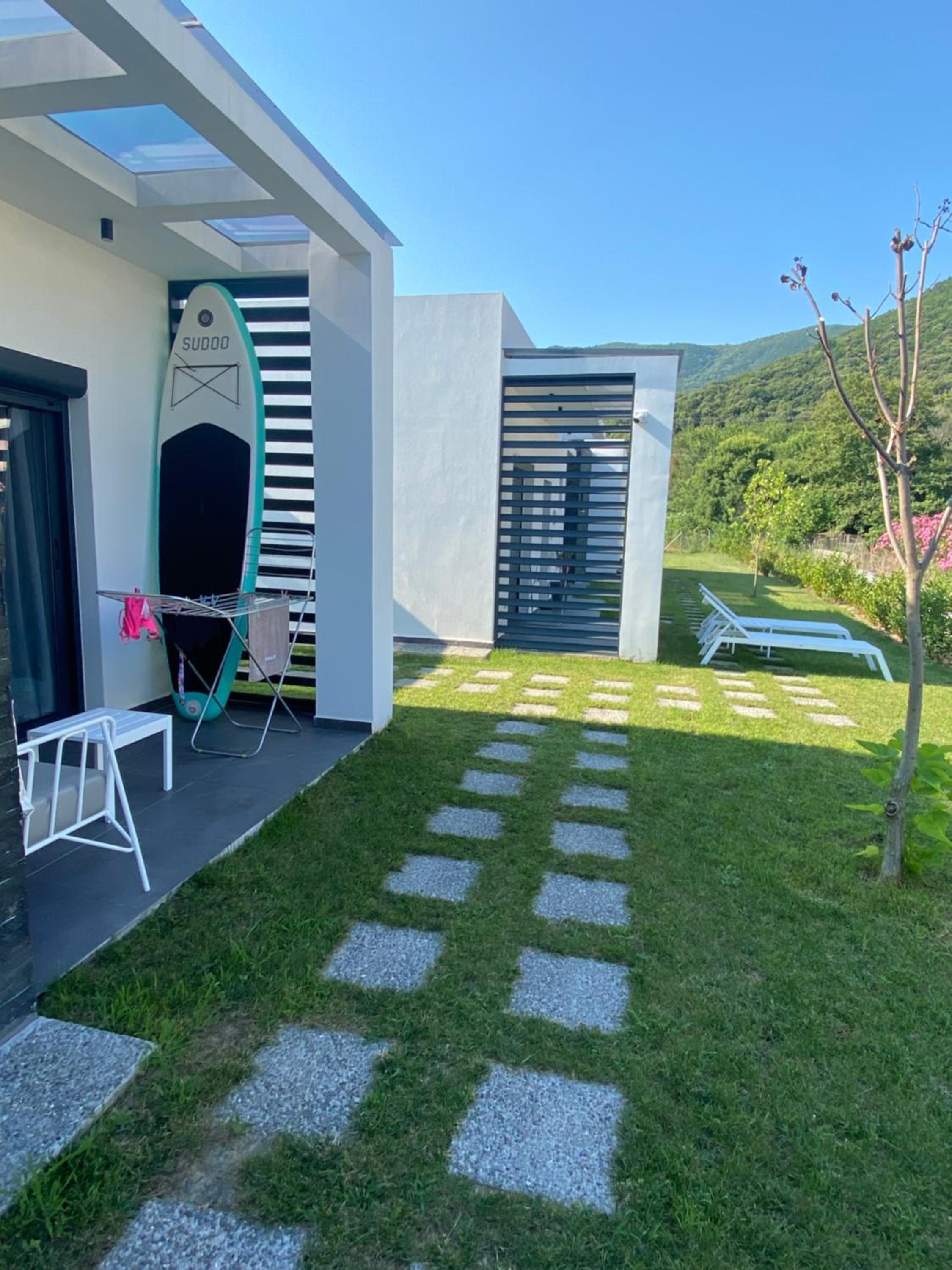 Being on the ground floor, with entrances from both sides, sun loungers in the garden, and the greenery surrounding it are all great things. The building is also new and close to the sea is also very nice.