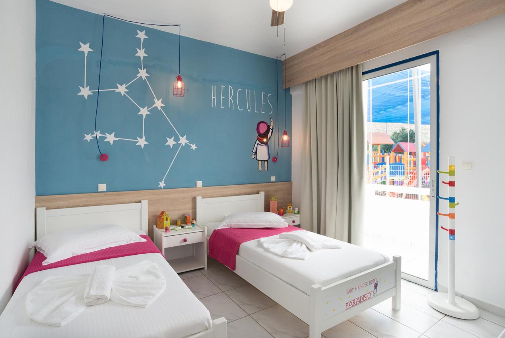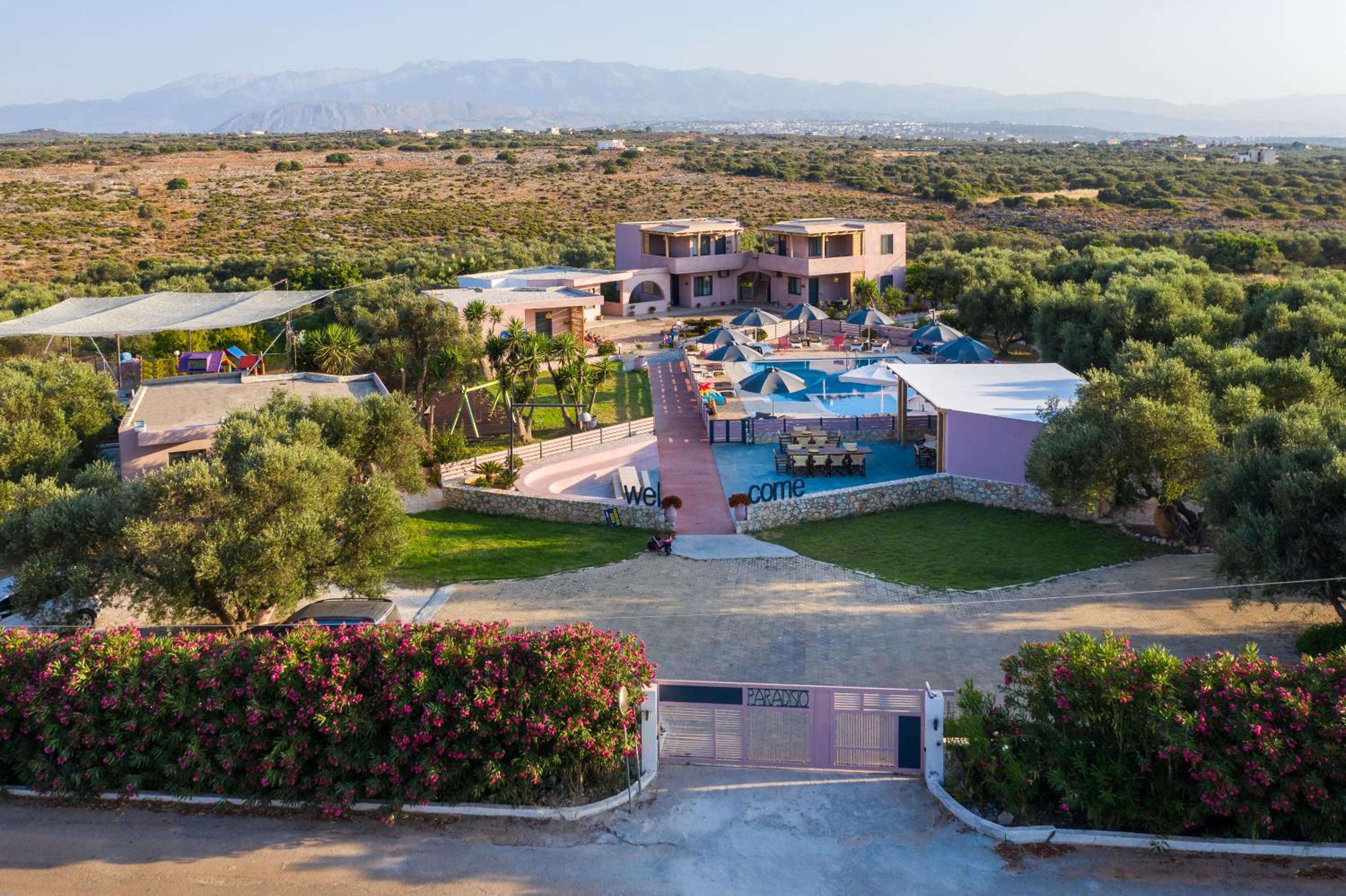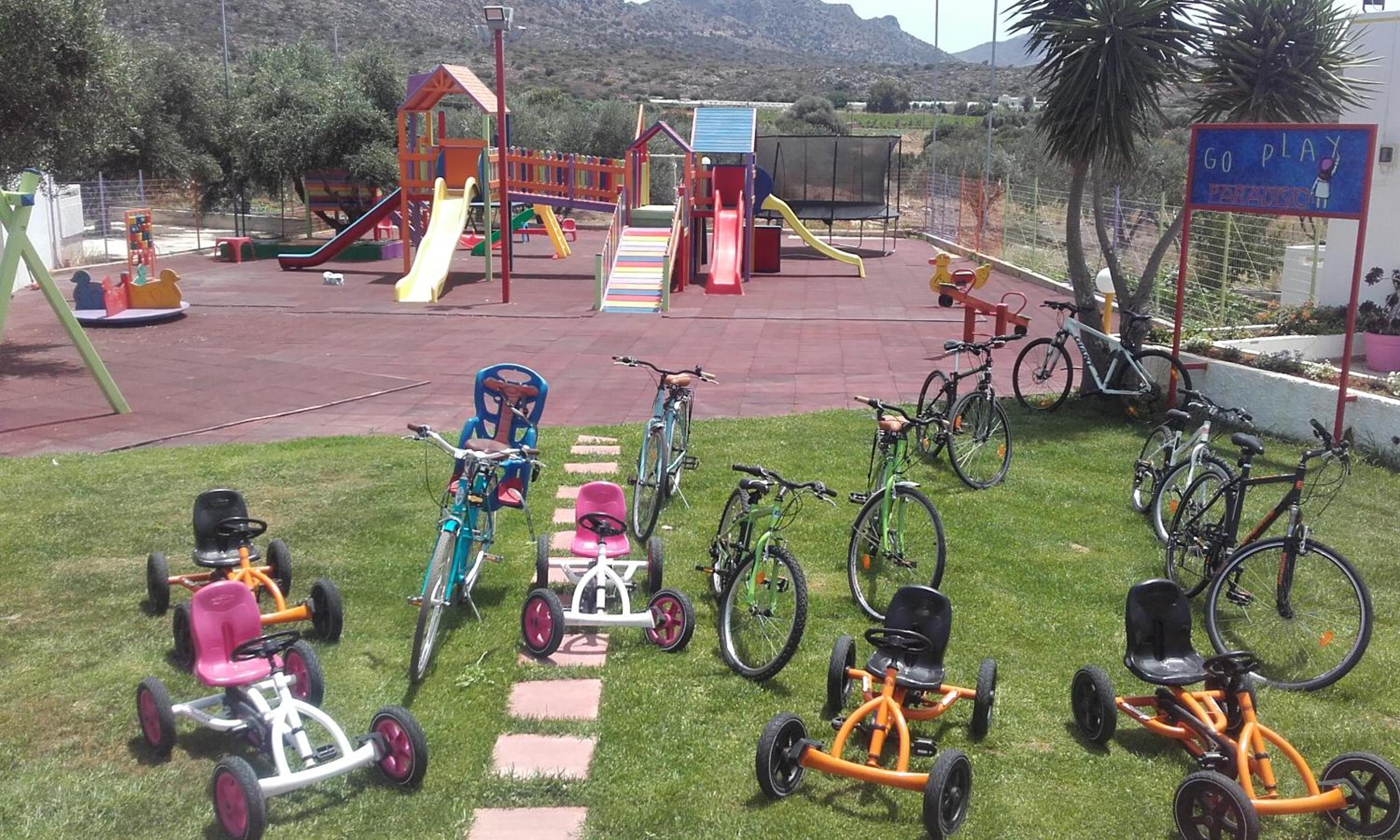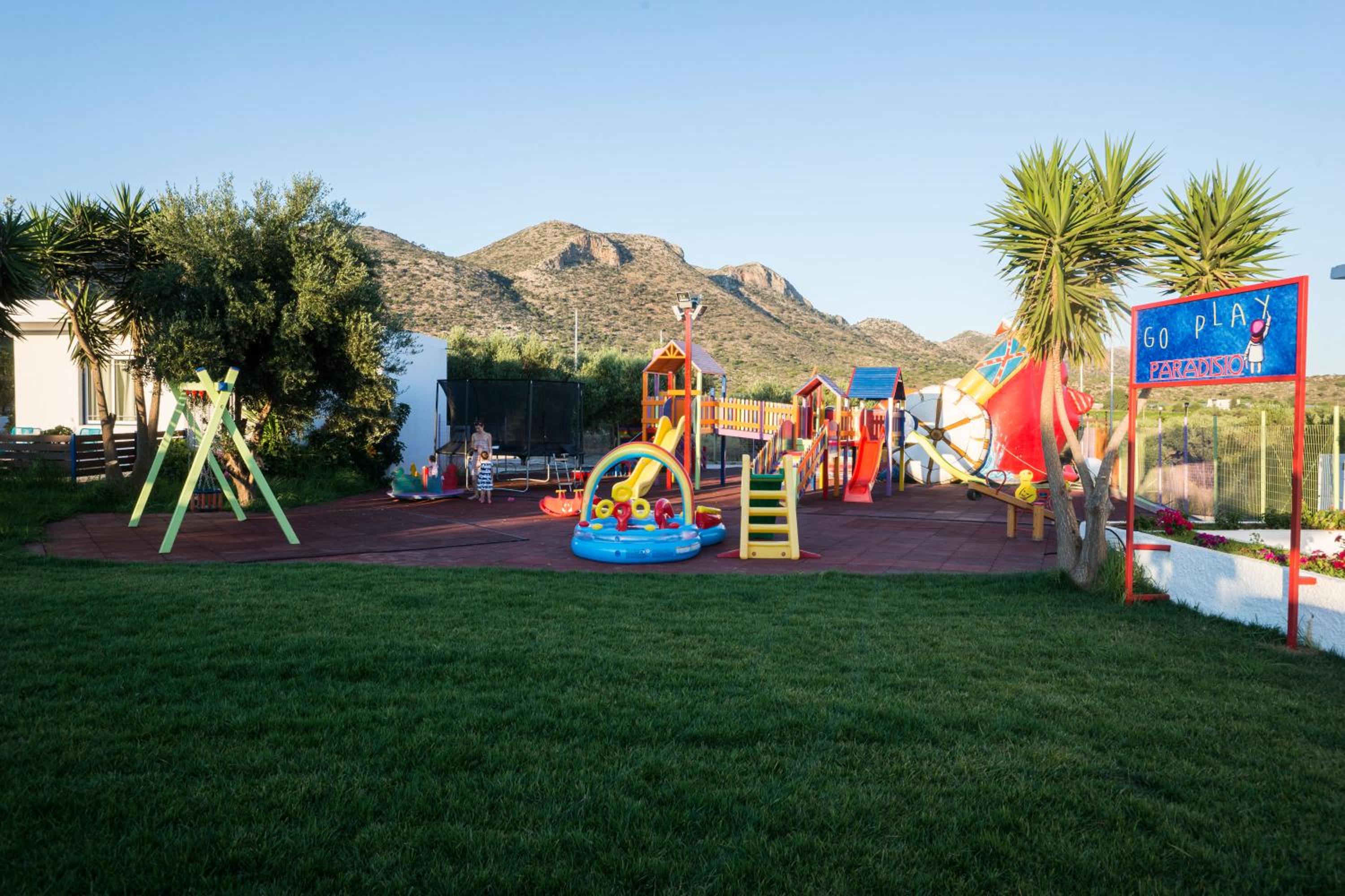 Paradisio Baby & Kinder Hotel in Stavros is a haven for families, boasting a 400-m² play area, go kart track, tree-house, ping-pong table, and an animal farm.