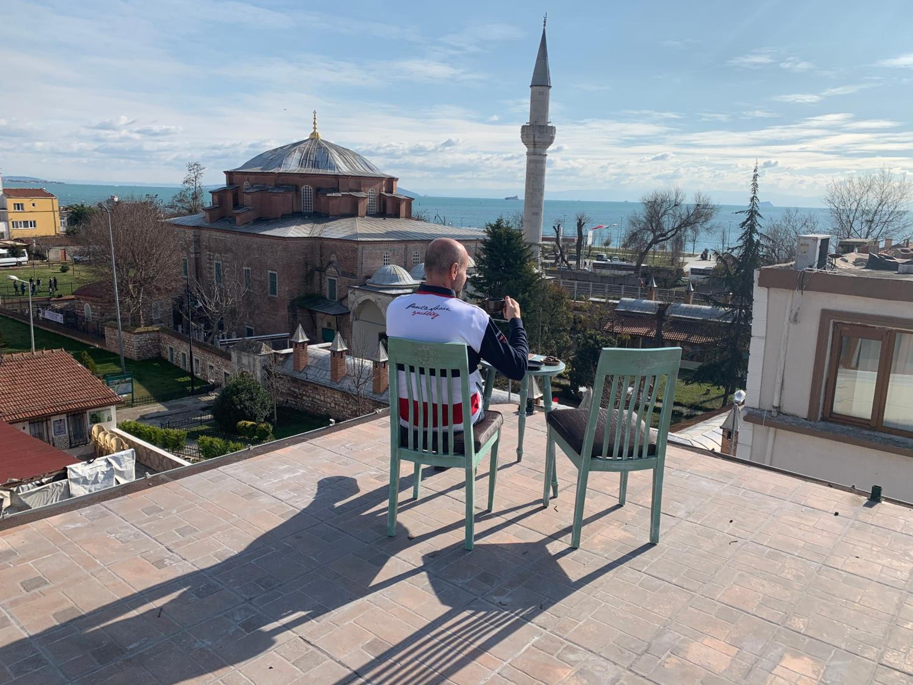 Terraço um pouco sujo, mas estava muito frio, de fato não muito agradável de permanecer, apesar da bela vista para o Mar de Mármara. Creio que no verão devam deixar o espaço mais aprazível, porque a equipe é muito diligente e atenciosa.