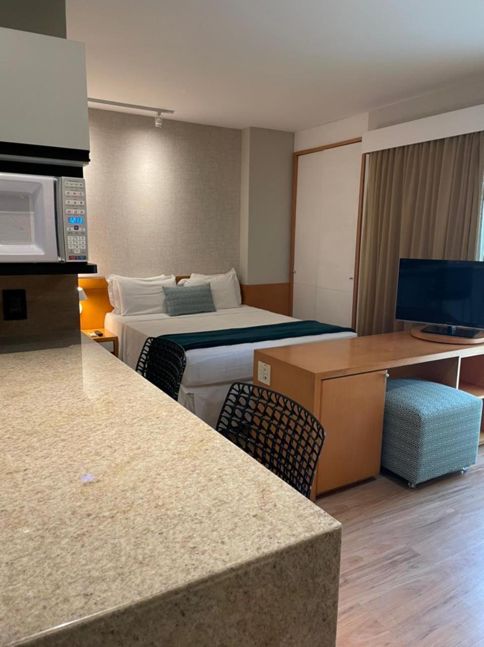 Apesar do apart-hotel oferecer 2 limpezas semanais, e de ter sido avisado que poderíamos agendar outros dias, isso nao foi disponibilizado para nós. Não conseguimos, por exemplo, agendar outro dia de limpeza. O apartamento não tem nenhum material de limpeza (desinfetante, vassoura, pano para chão) que permitisse manter a limpeza nos dias em que o serviço não estava disponível. O barulho nos dis de semana é muito alto. Solicitamos toalhas extras para uma troca no final de semana, mas isso nos foi negado.