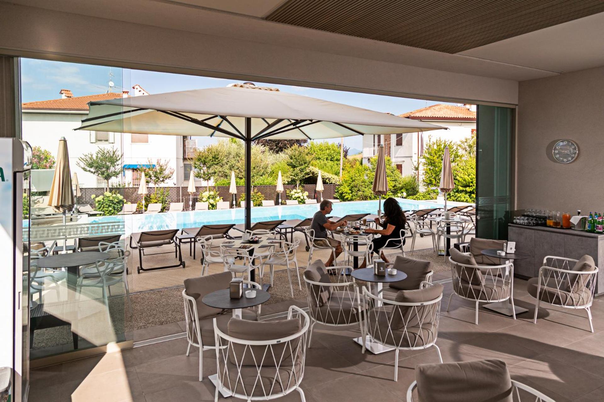 The room was modern and spacious, the air con super quiet. We opted for breakfast additional 10 euros pppd it was very reasonable for a good range of breakfast options. The gardens and pools were beautiful in a very peaceful location, just a 15 minute lakeside walk into Bardilino. Don’t hesitate to holiday here.