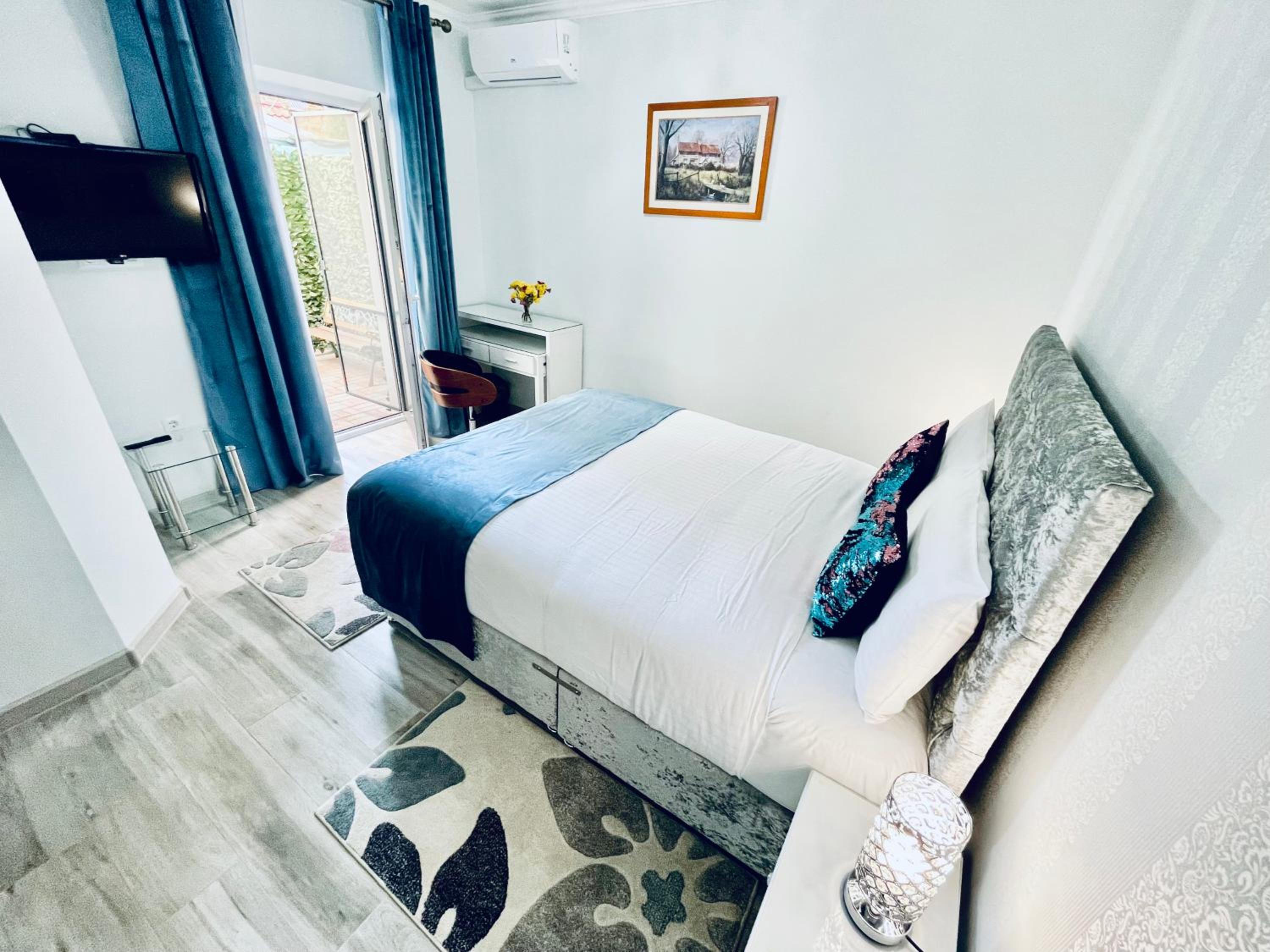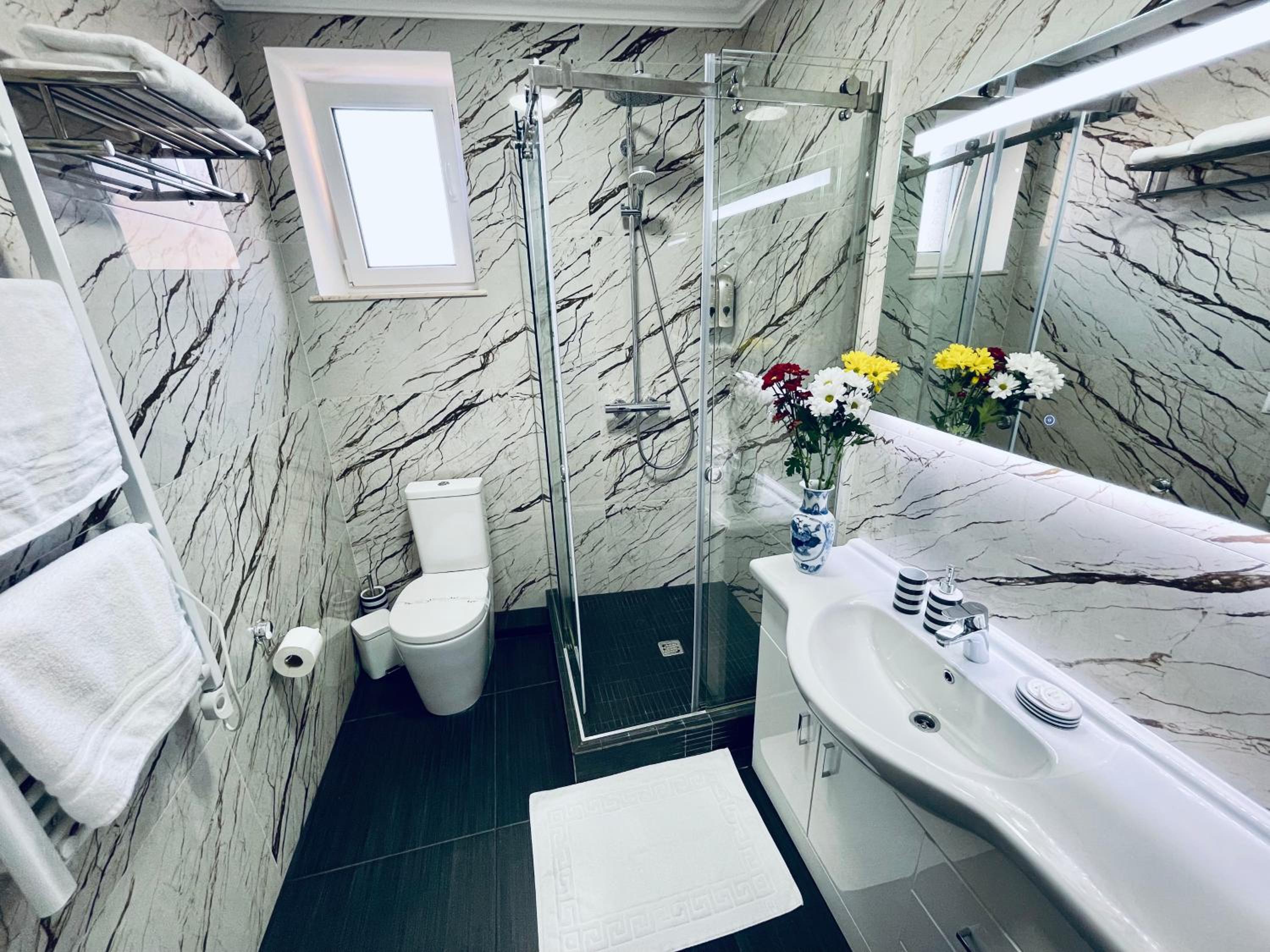 Experience modern amenities in our family rooms, including a fully equipped kitchen, flat-screen TV, and free WiFi. Relax in the walk-in shower with plush bathrobes provided.