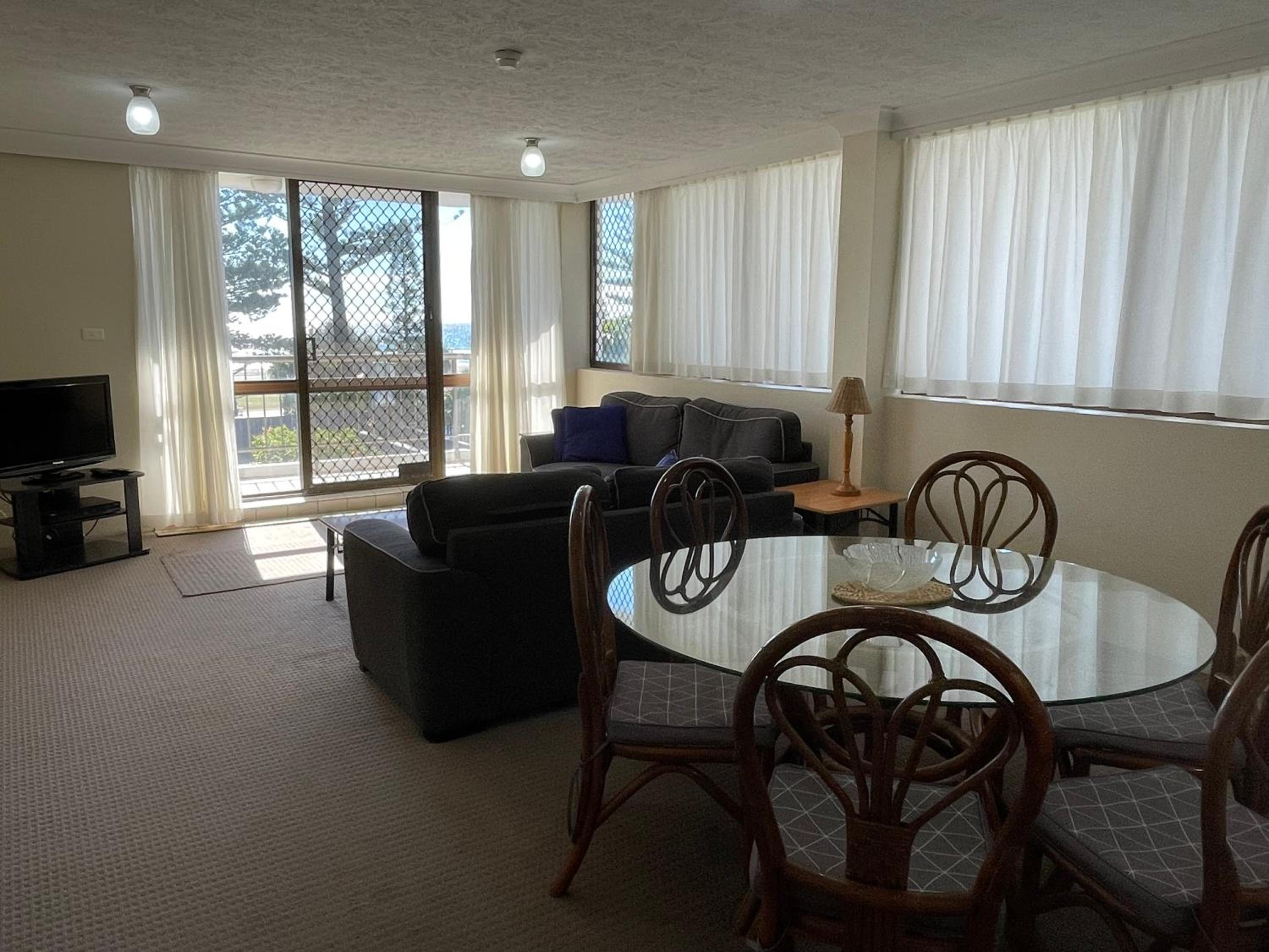 Excellent location. Good size kitchen. Roomy with 2 spare beds and separate bathroom which included a bath. Beach toys which came in handy when grandchildren visited. Easy access from car underneath. Next door to shopping centre and central to all great restaurants. Perfect!!