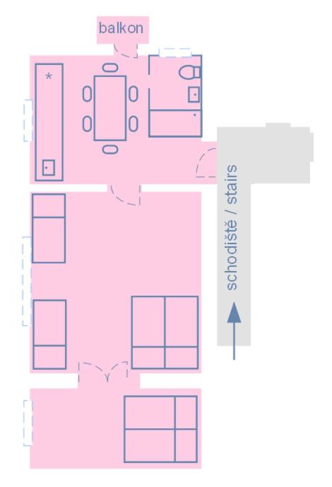 Nepořádek okolo apartmánu. Apartmán spíše jako ubytovna, mnoho postelí a žádná skříň.