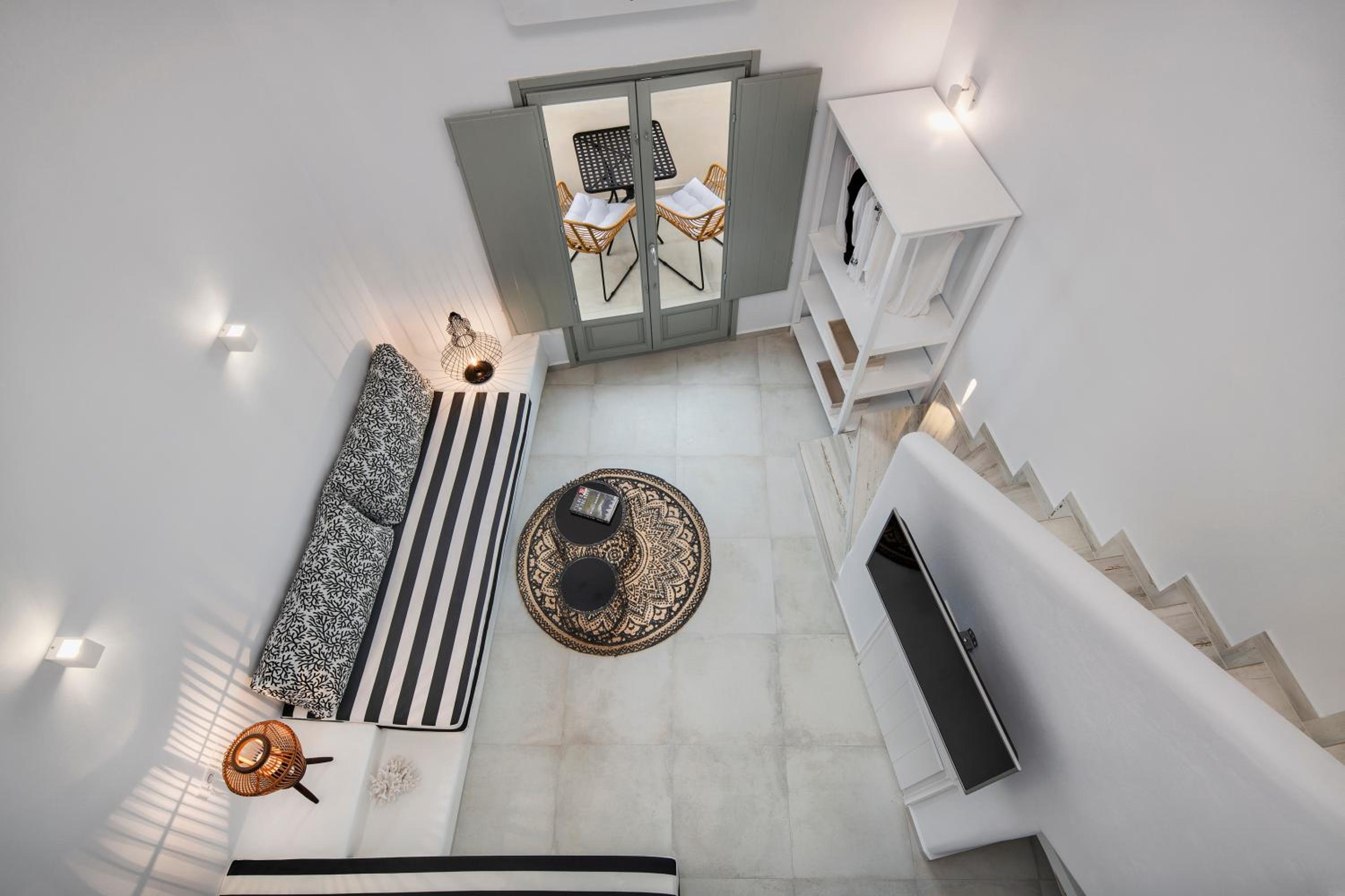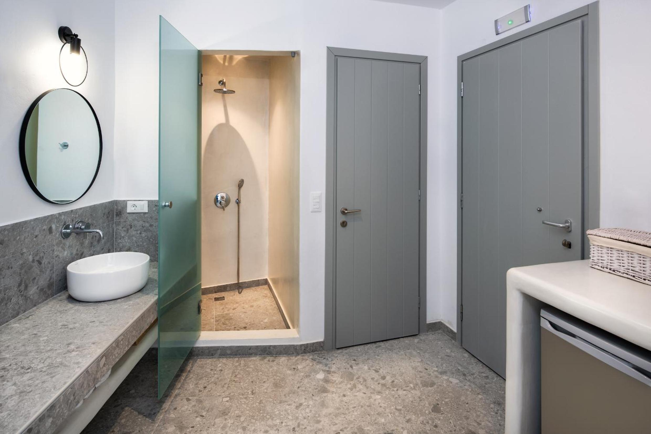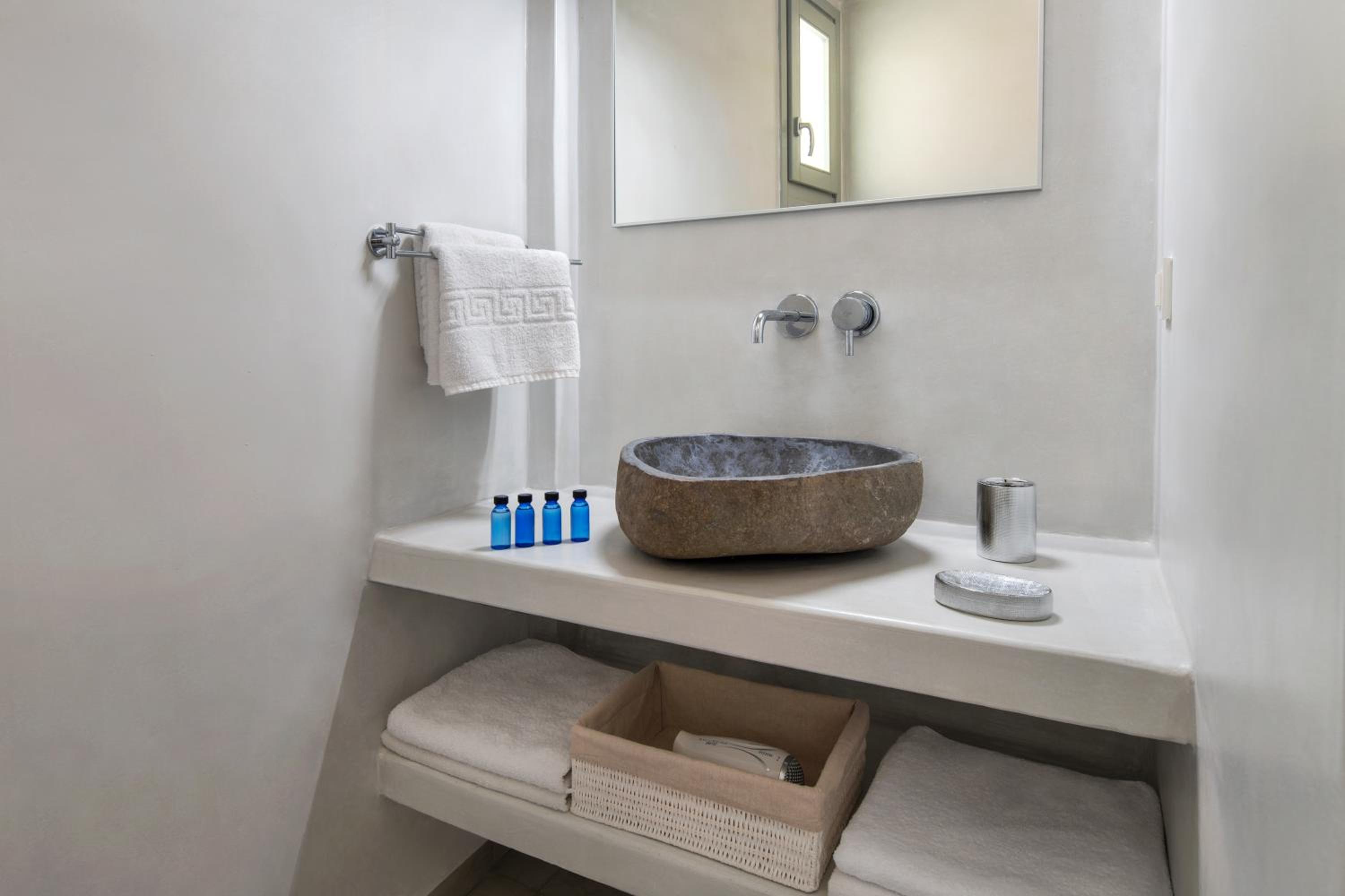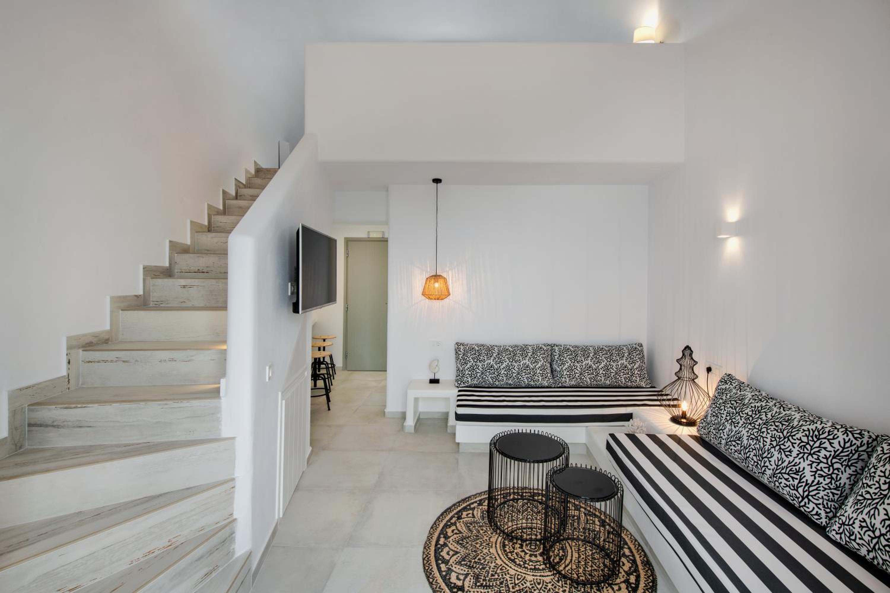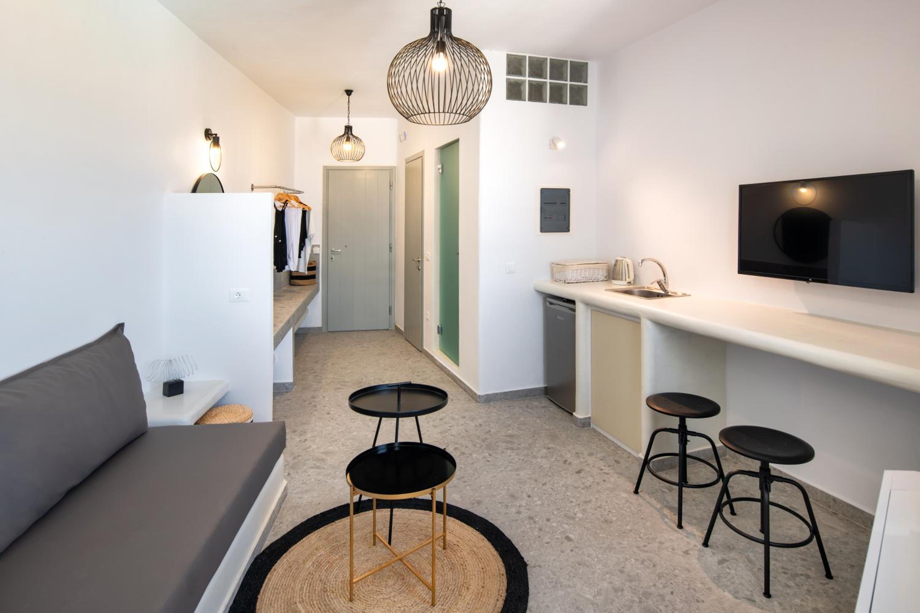 Άνετο μεγάλο και καθαρό δωμάτιο με την κυκλαδίτικη αρχιτεκτονική. Ήσυχο και η τοποθεσία αρκετά καλή και εύκολα προσβάσιμο.Κοντά σε καταστήματα-μαγαζιά. Εξαιρετική εξυπηρέτηση του προσωπικού, ευγένεια και προσφορά early check, γεγονός πολύ σημαντικό σε μια περίοδο αιχμής. Το δωμάτιο είχε όλες τις ανέσεις και ένα κουζινάκι με όλα τα σκεύη αν κάποιος θα ήθελε να μαγειρέψει. Μου άρεσε πάρα πολύ ότι το μπάνιο ήταν μεγάλο με ξεχωριστά το ντους από την τουαλέτα. Παρείχαν πετσέτες για την πισίνα.