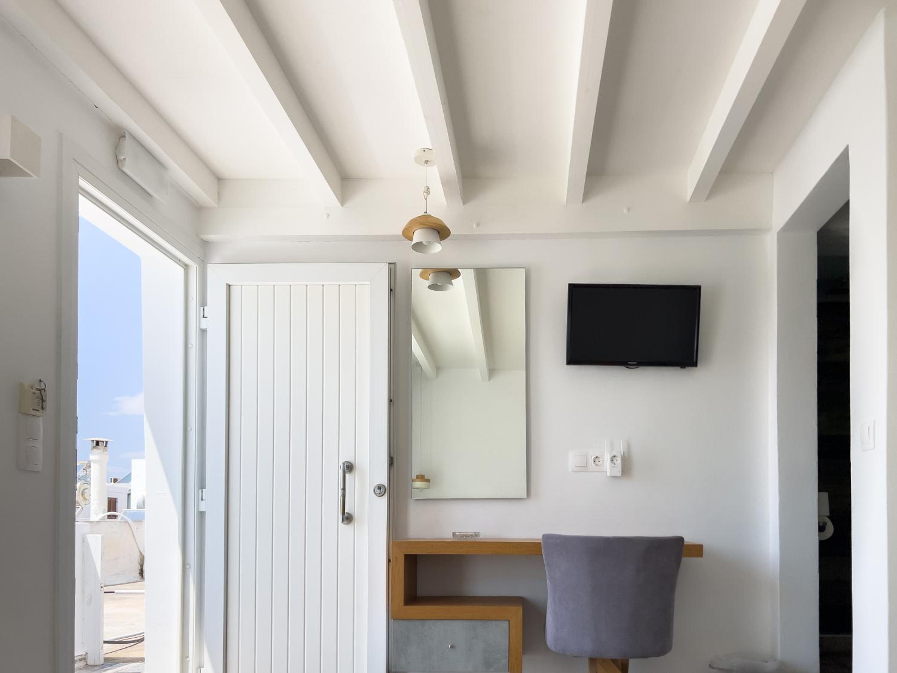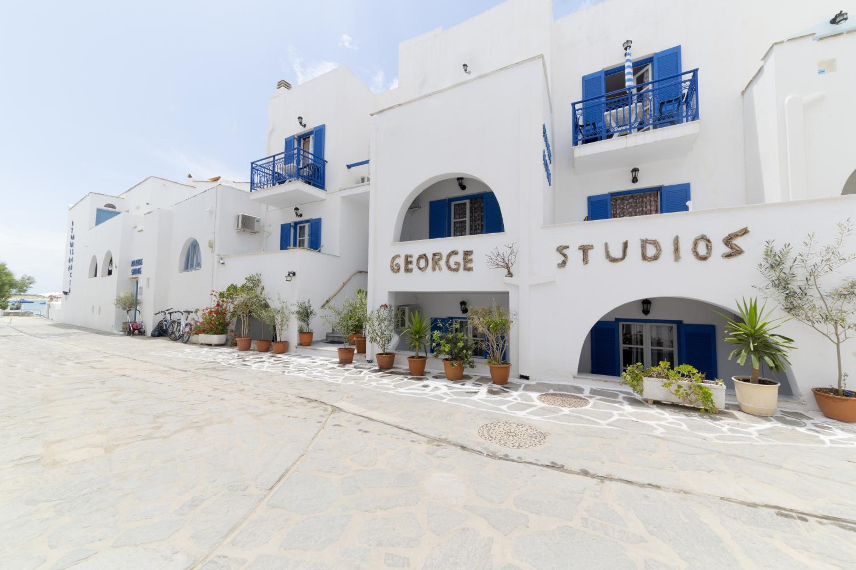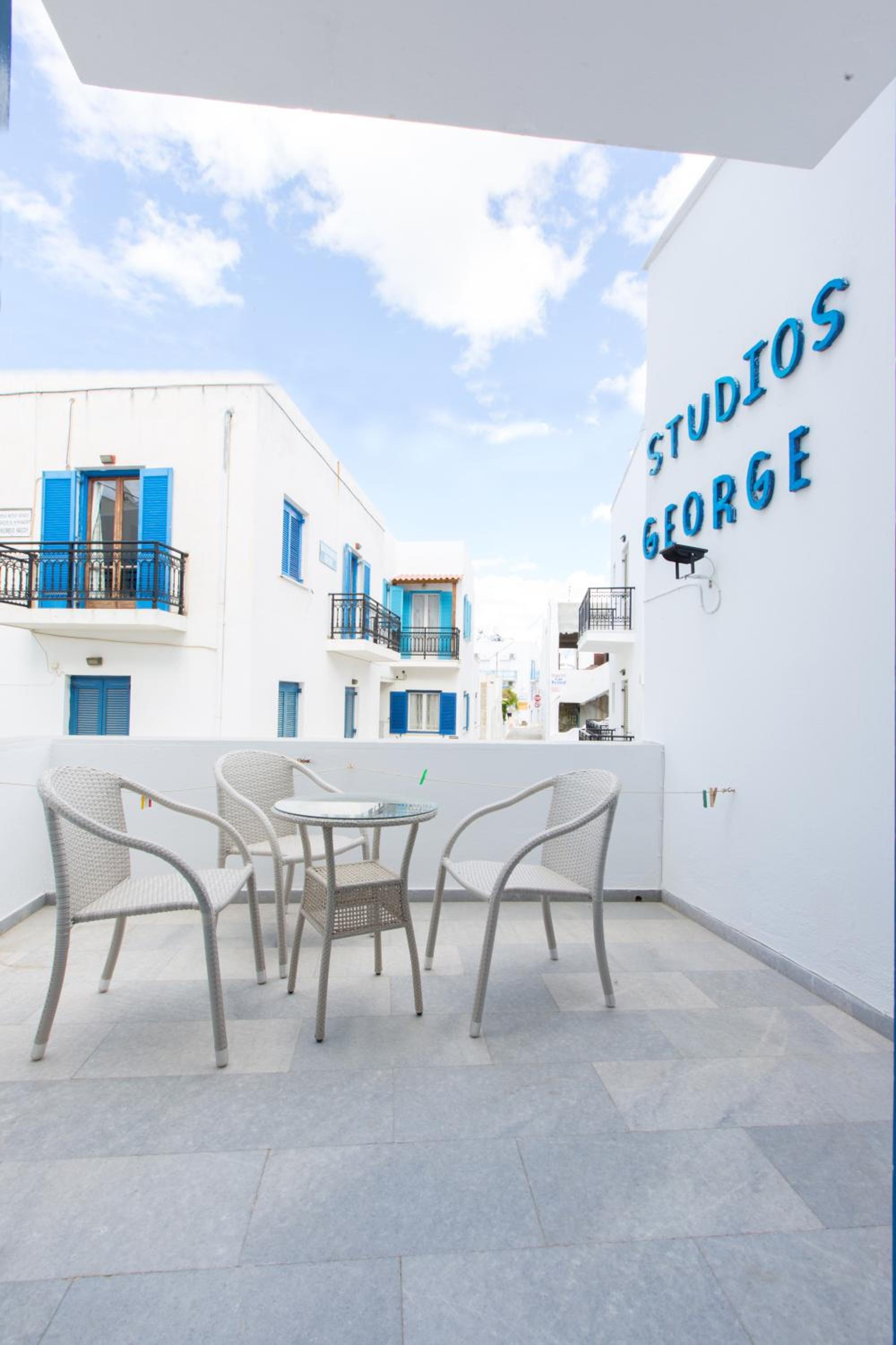Cozy Cycladic Style: Experience the charm of traditional Cycladic architecture at George Studios, offering comfortable self-catered accommodation with free Wi-Fi and furnished balconies.