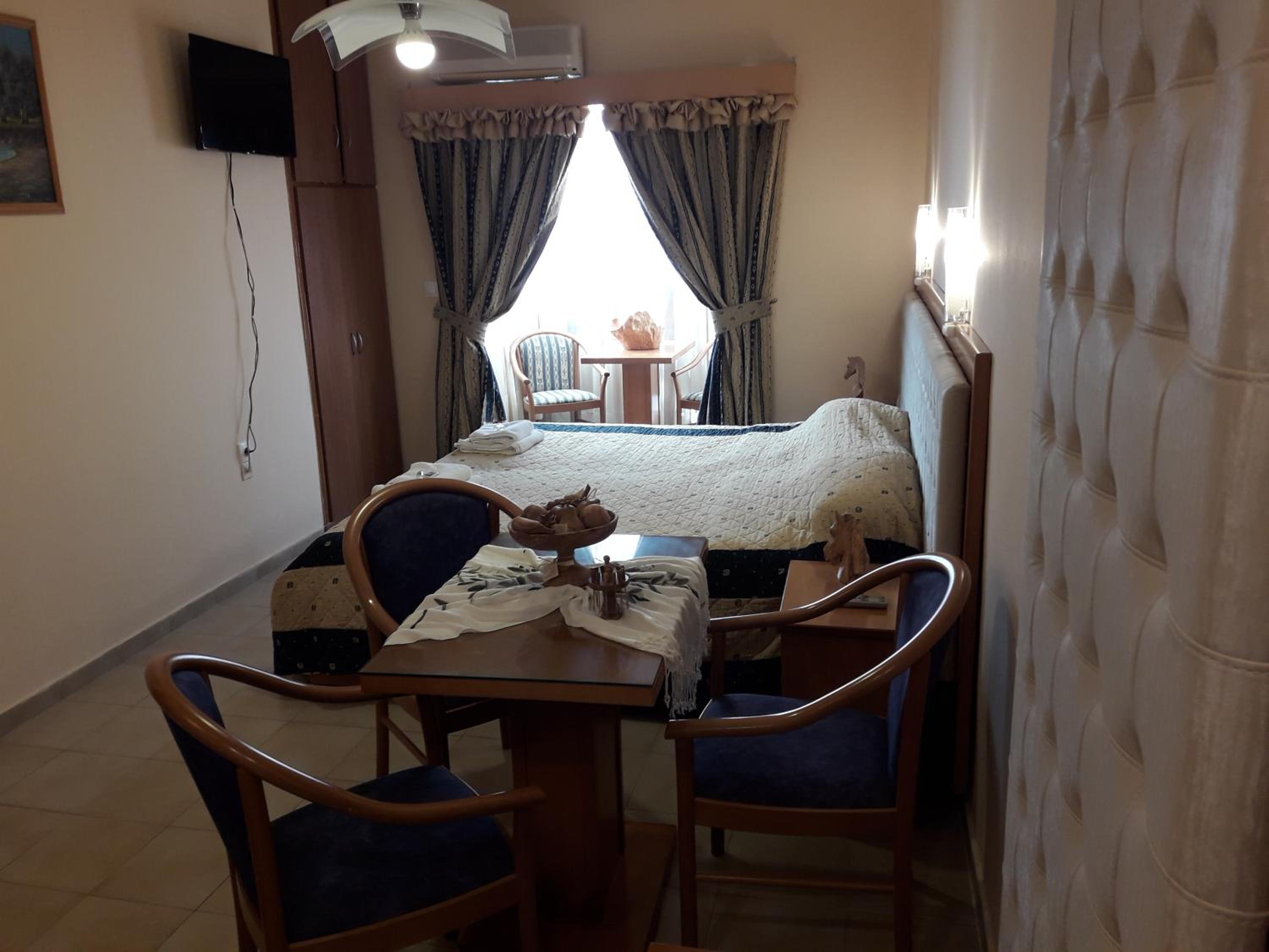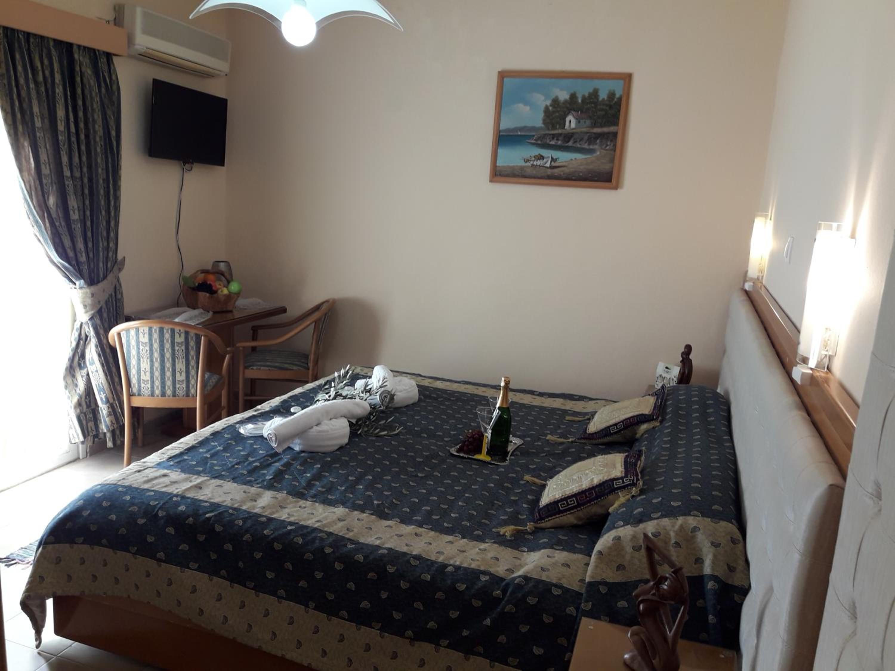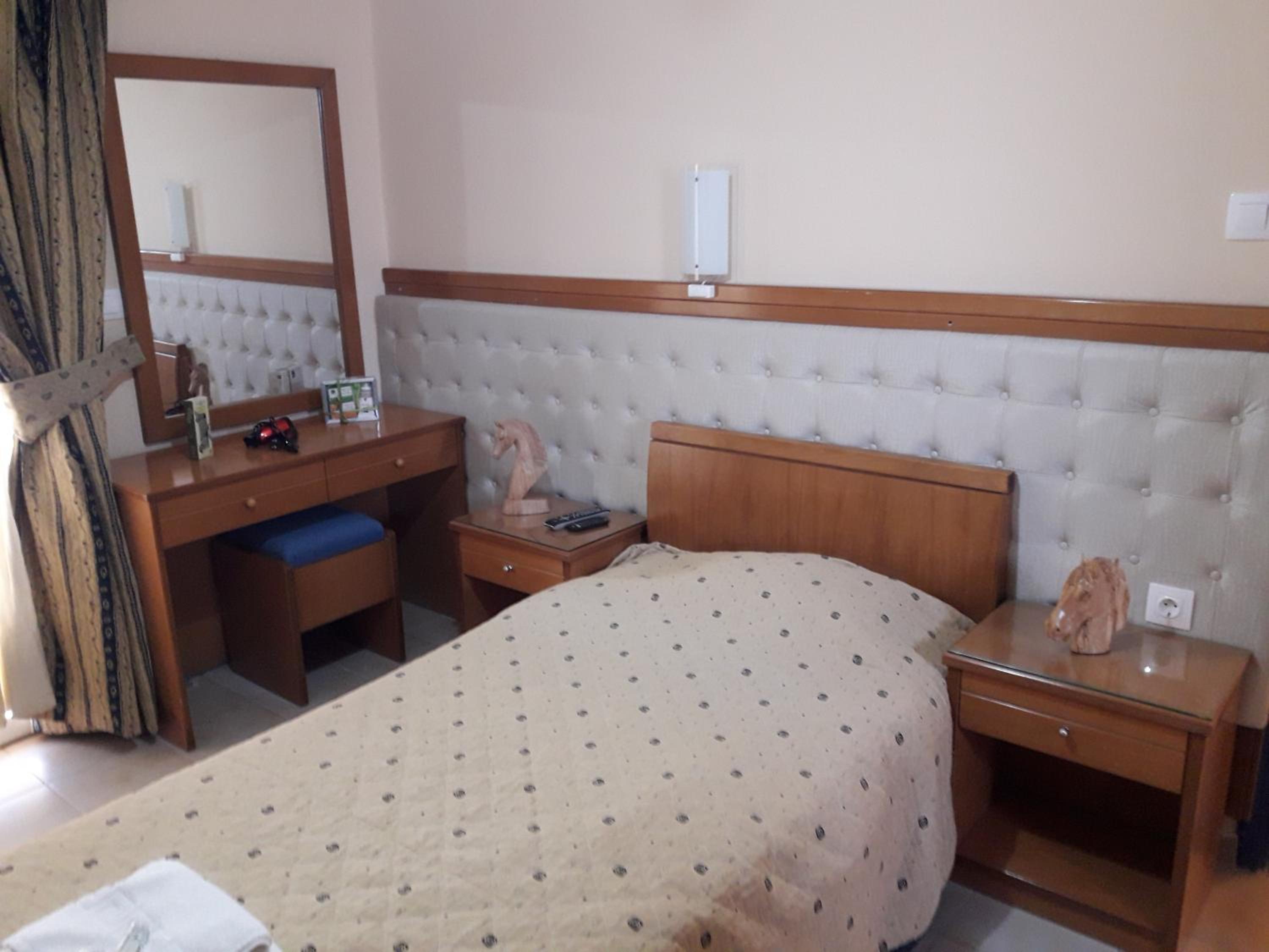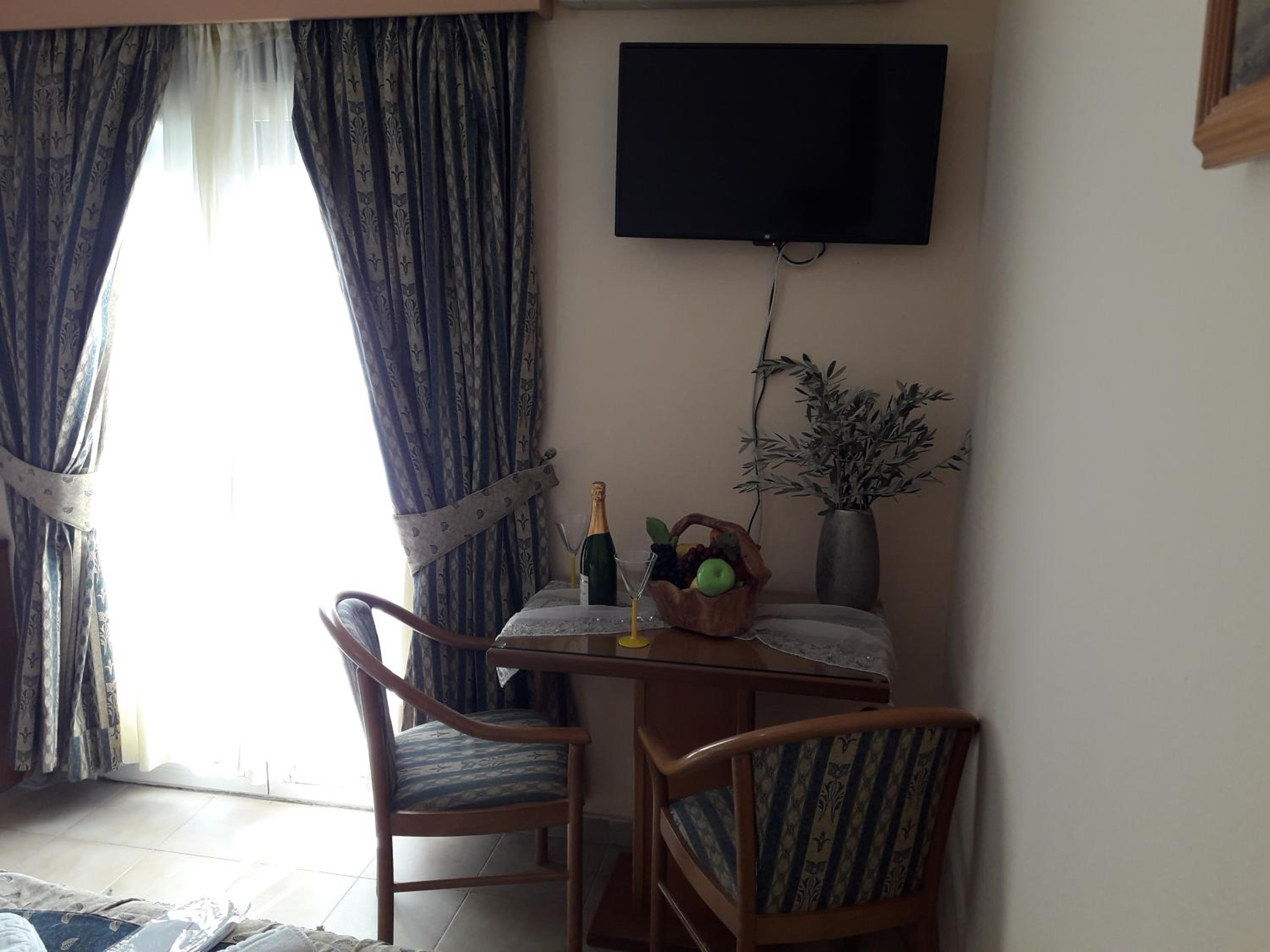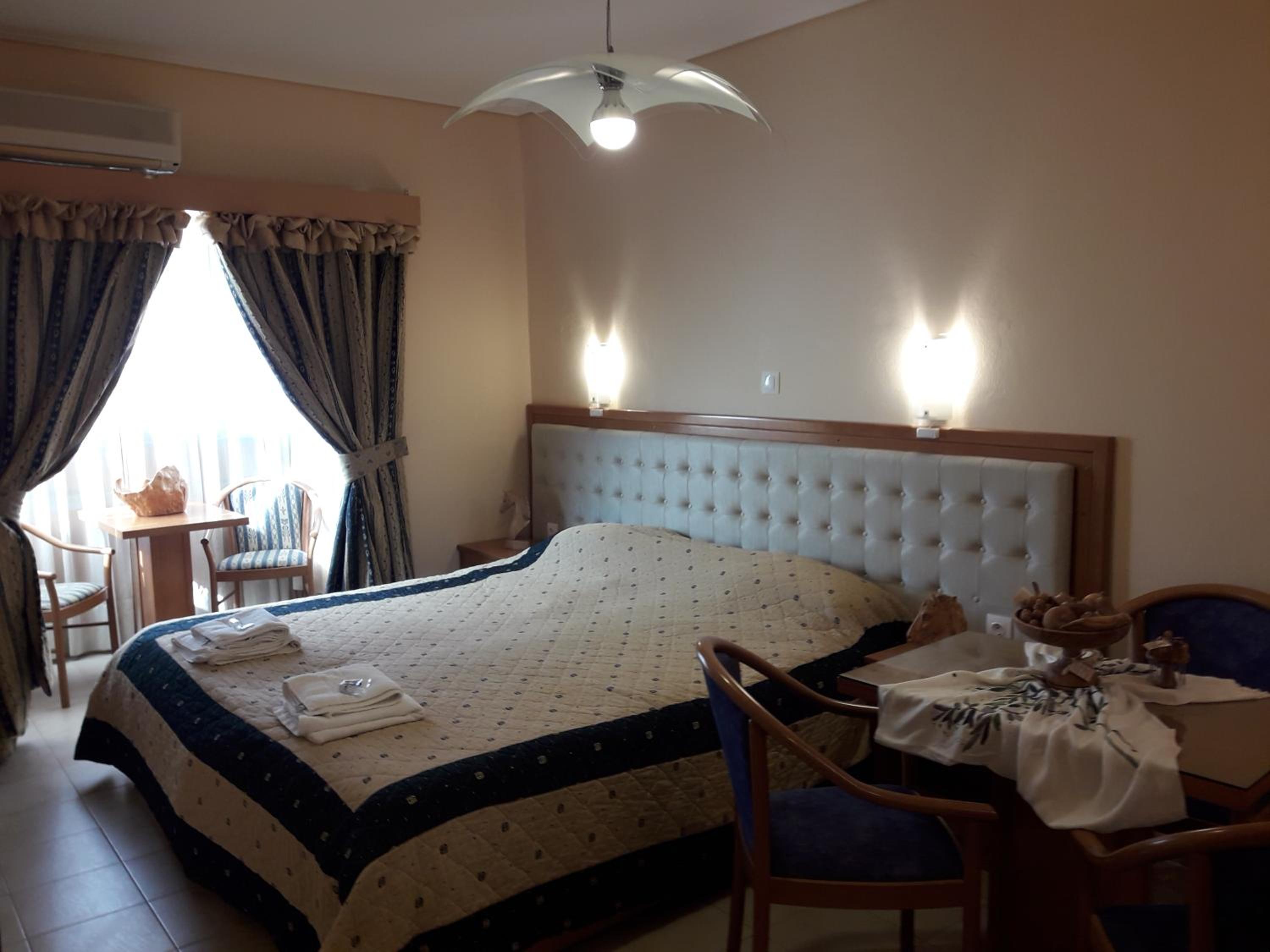 Room was nice. Bathroom was okay. They have curtains for the shower. Shampoo and soap, 1 bath towel, 1 hand towel were provided by the hotel. Bed was comfortable. Air conditioner was working. Room has the balcony with chairs and table. The hotel is near the restaurants where you can spend lovely times. And the hotel also nears some of the nice beaches which you can reach by walk. I mean I walked 40 minutes to go to the nearest beach i.e. Paralia Pamfila. It could be long distance for most of the people. After Paralia Pamfila and then I walked to the Paralia Viglia which is hidden, lovely beach.