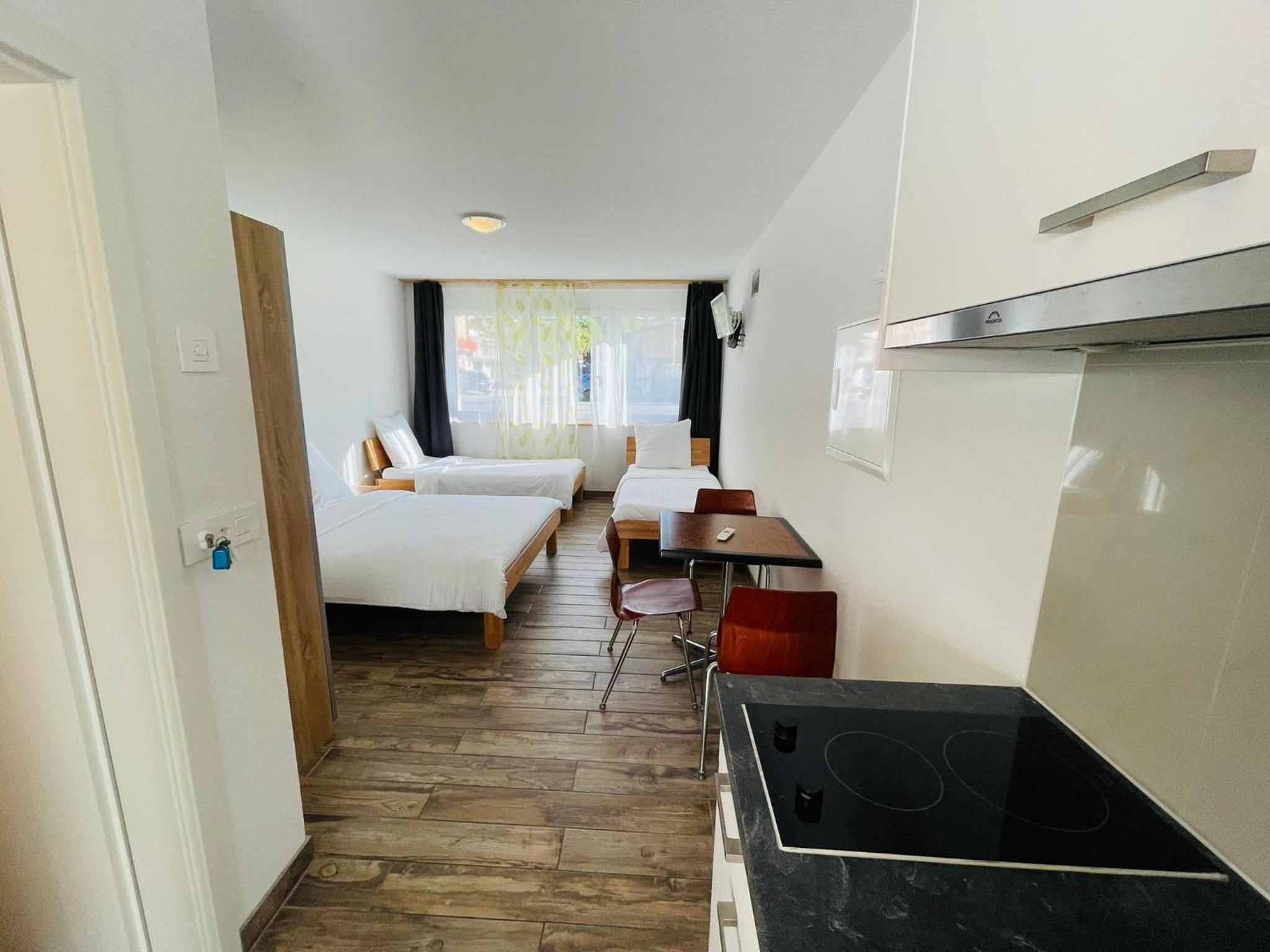 The studio was more spacious than we thought (we were a group of three) and clean. Although the place was located a bit away from the city center, the area was very quiet. The staff was also very kind and attentive.