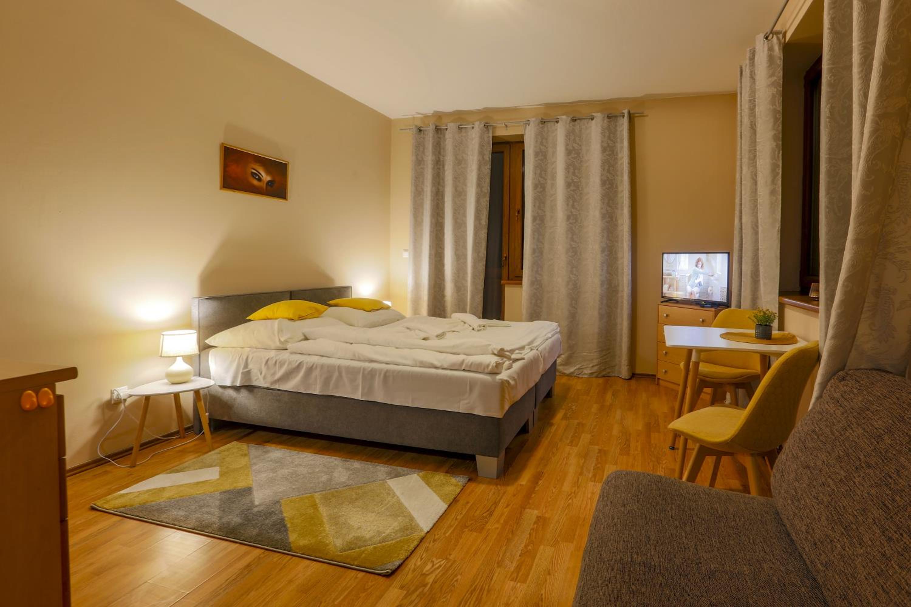 Príjemný personál , chutné raňajky , privátne wellness, možnosť parkovania v garáži, chutné pivko v bare, čistá a priestranná izba.