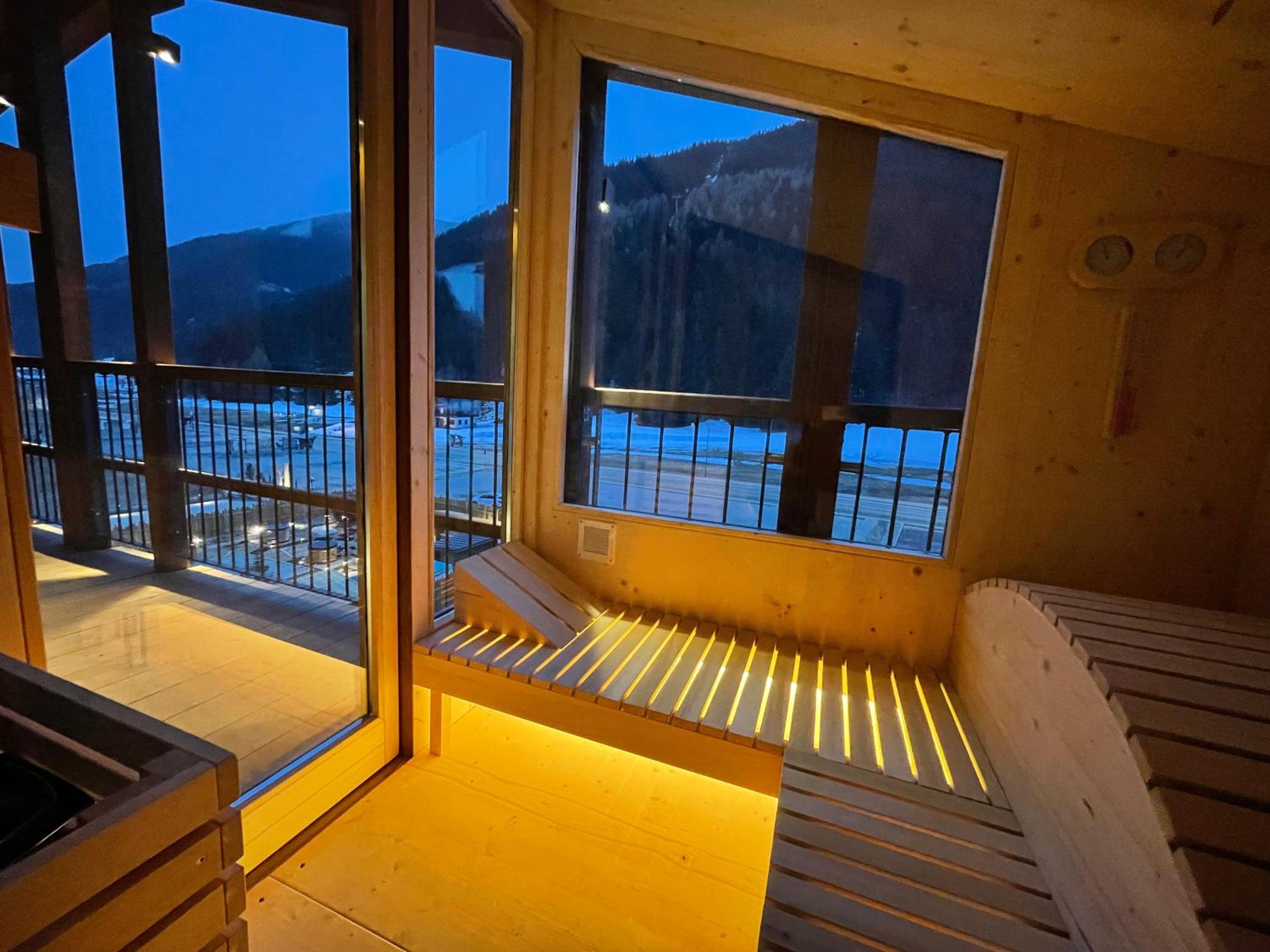 Guests can unwind in the sauna after a day of skiing, or enjoy breathtaking mountain views from the private terrace in each unit.