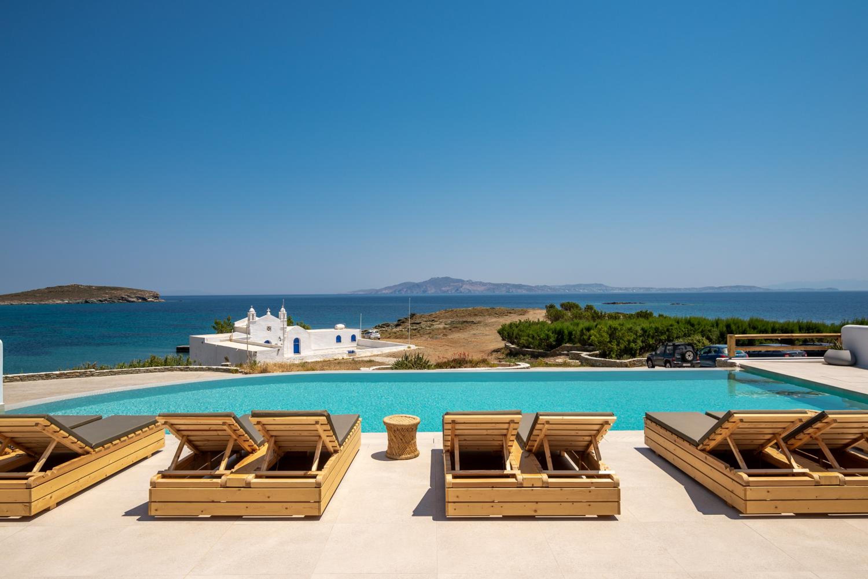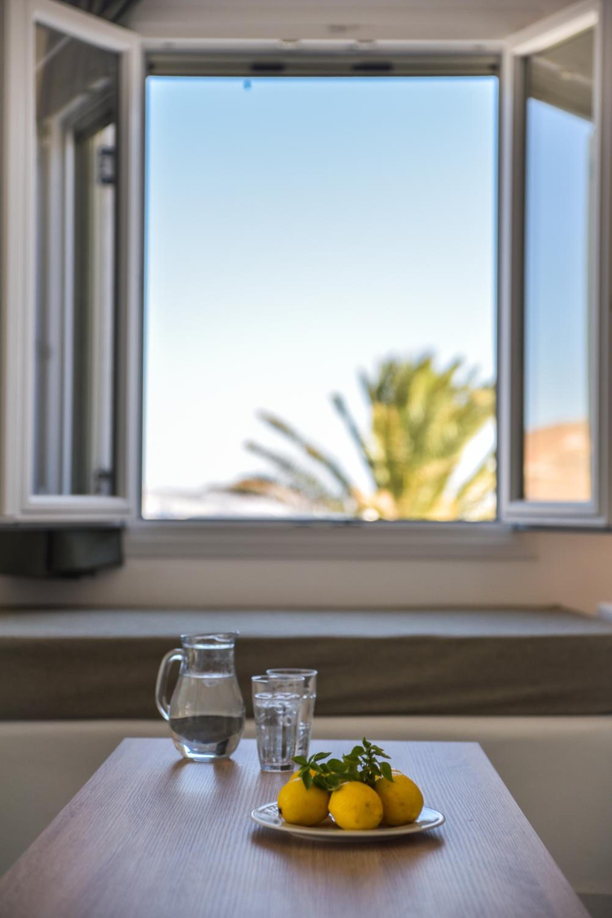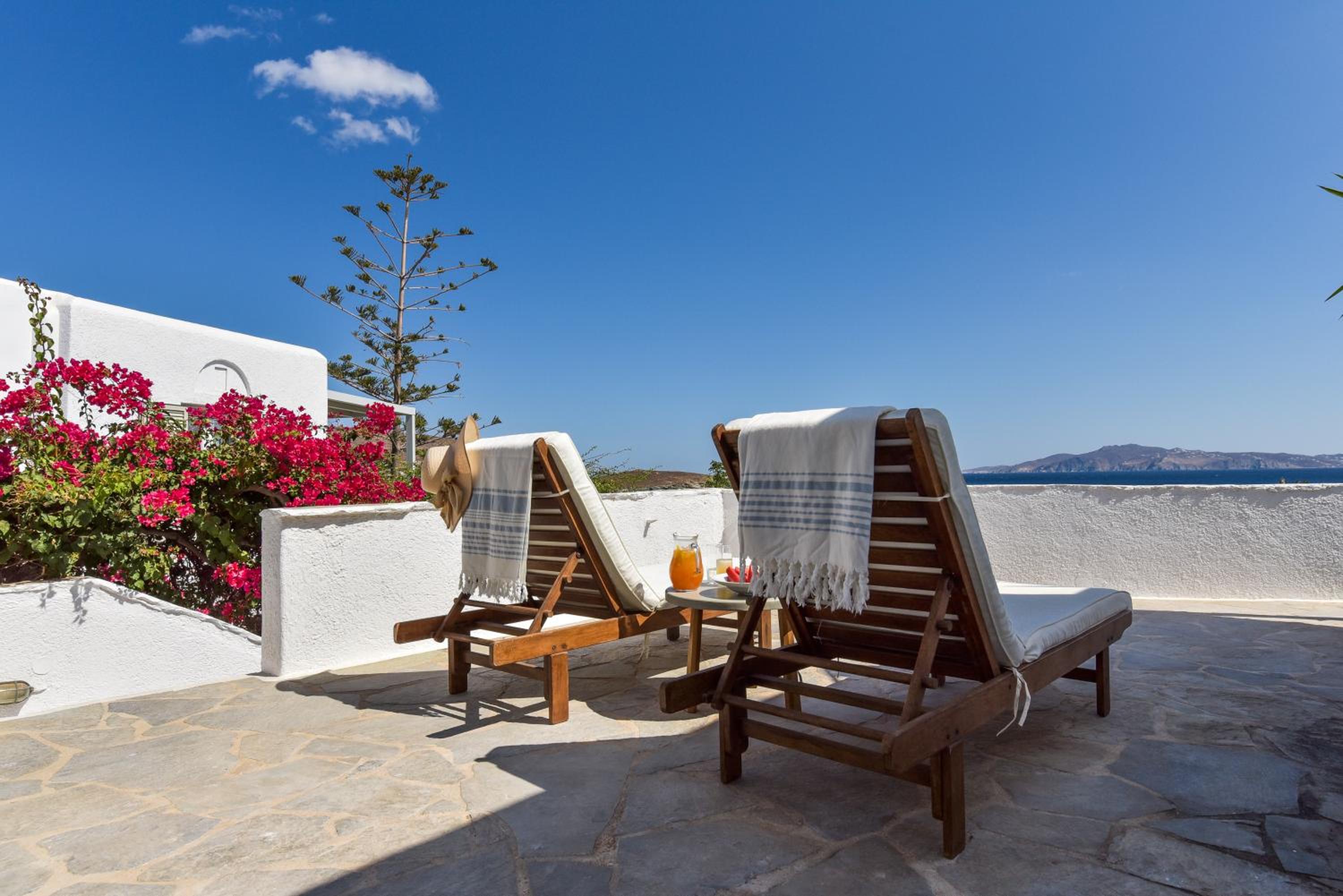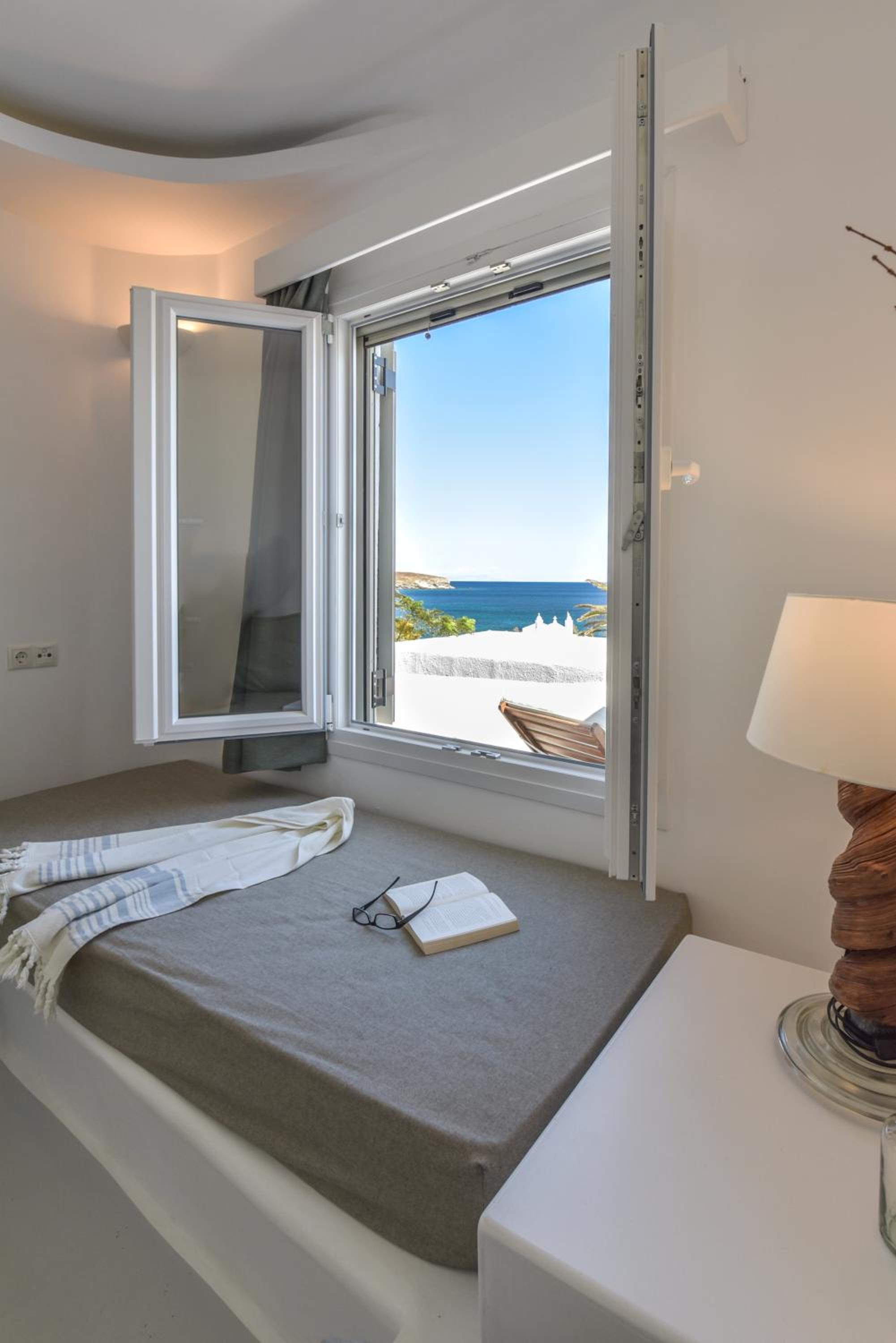 Very comfy beds. Delicious breakfast. Very clean rooms. Charming staff. In the best place in Tinos. Beautiful views. Very clean beach.