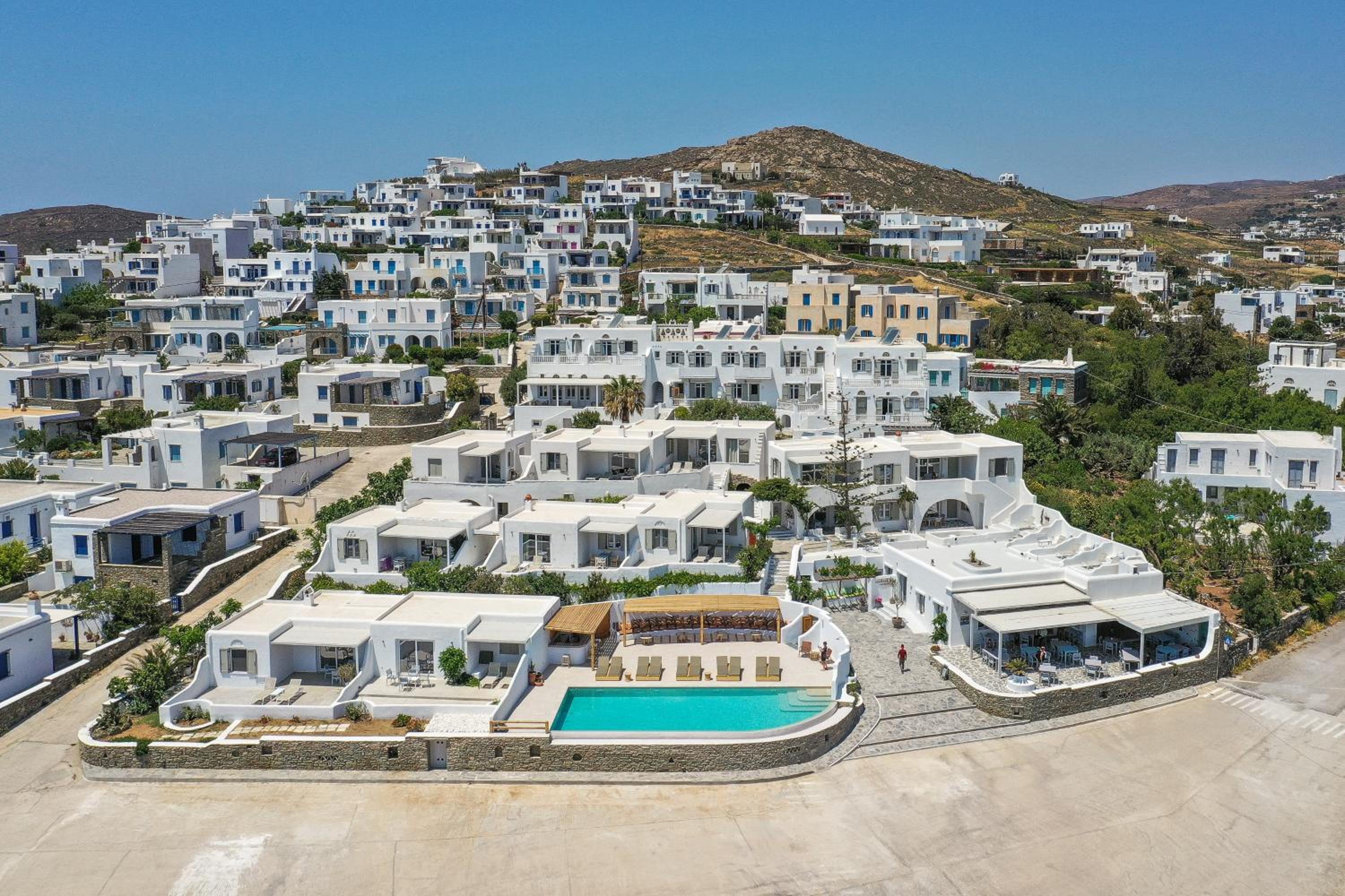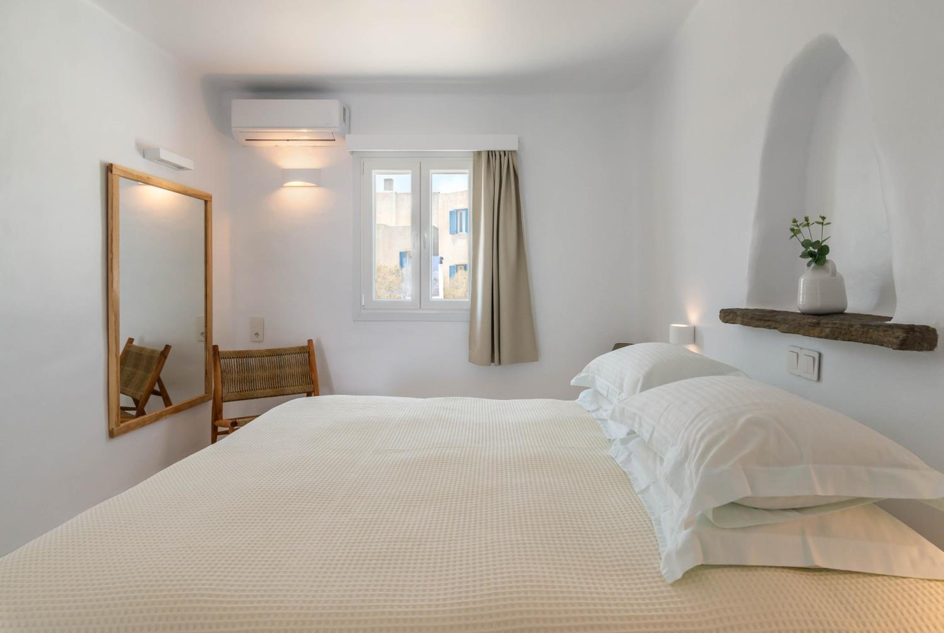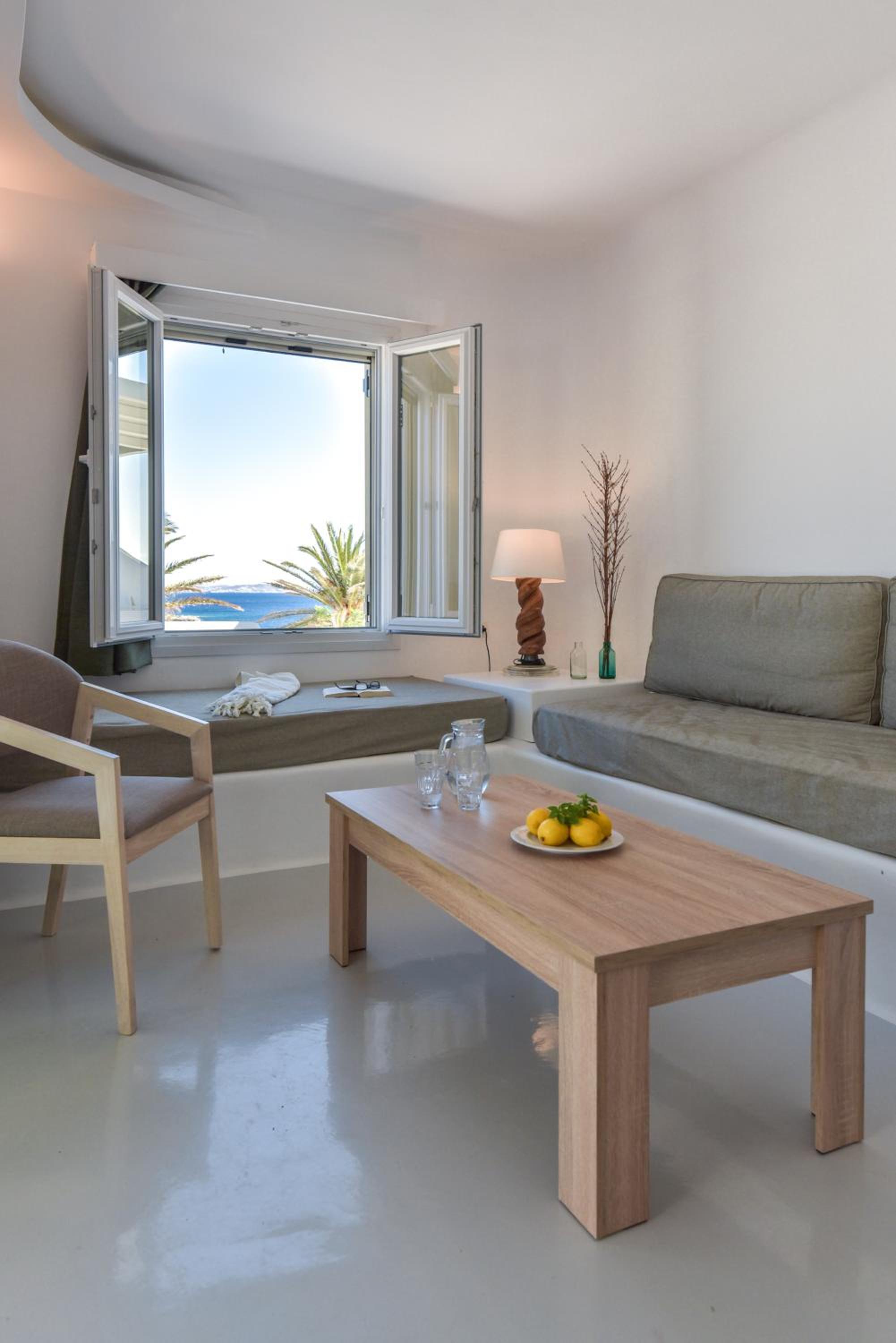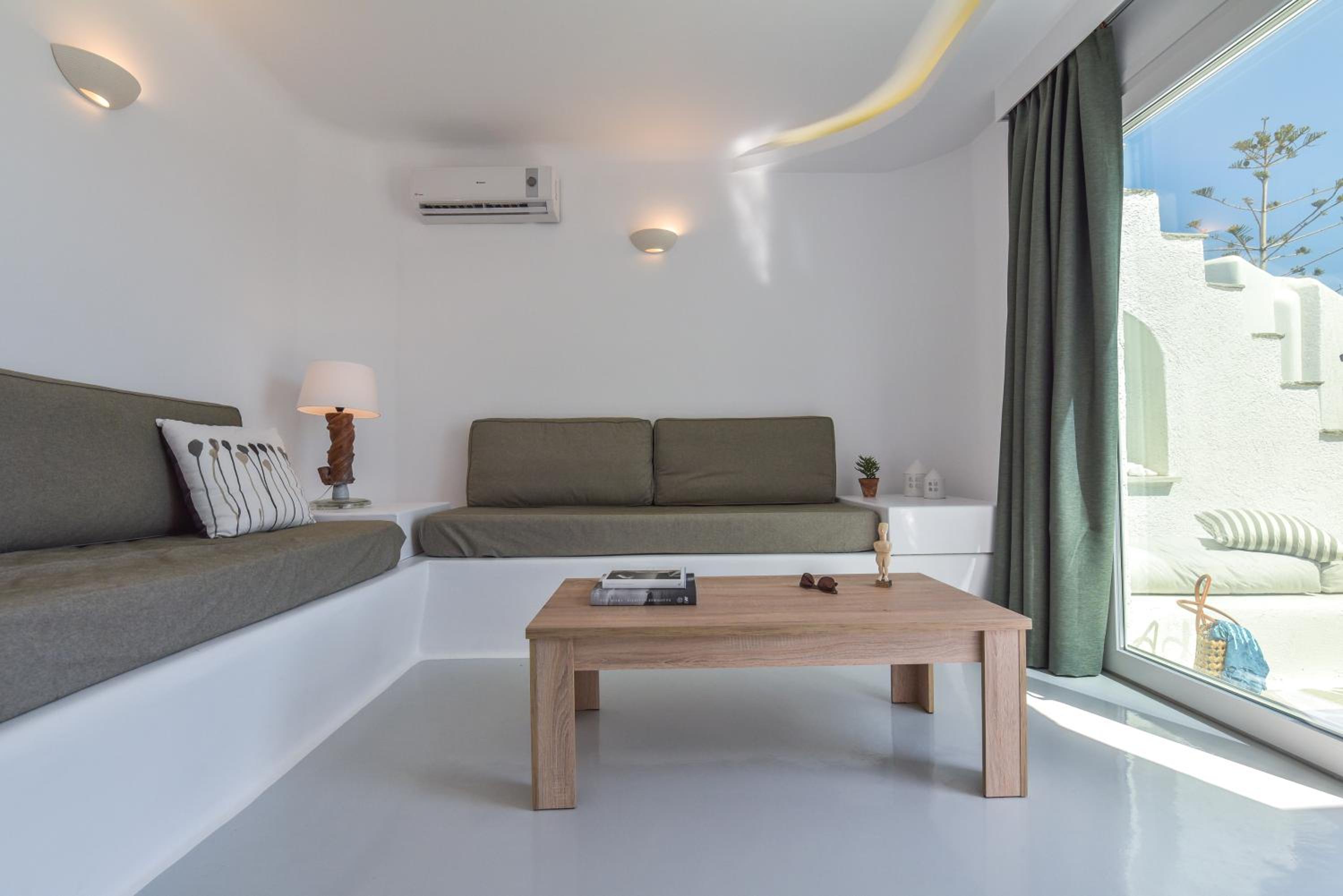 Very comfy beds. Delicious breakfast. Very clean rooms. Charming staff. In the best place in Tinos. Beautiful views. Very clean beach.