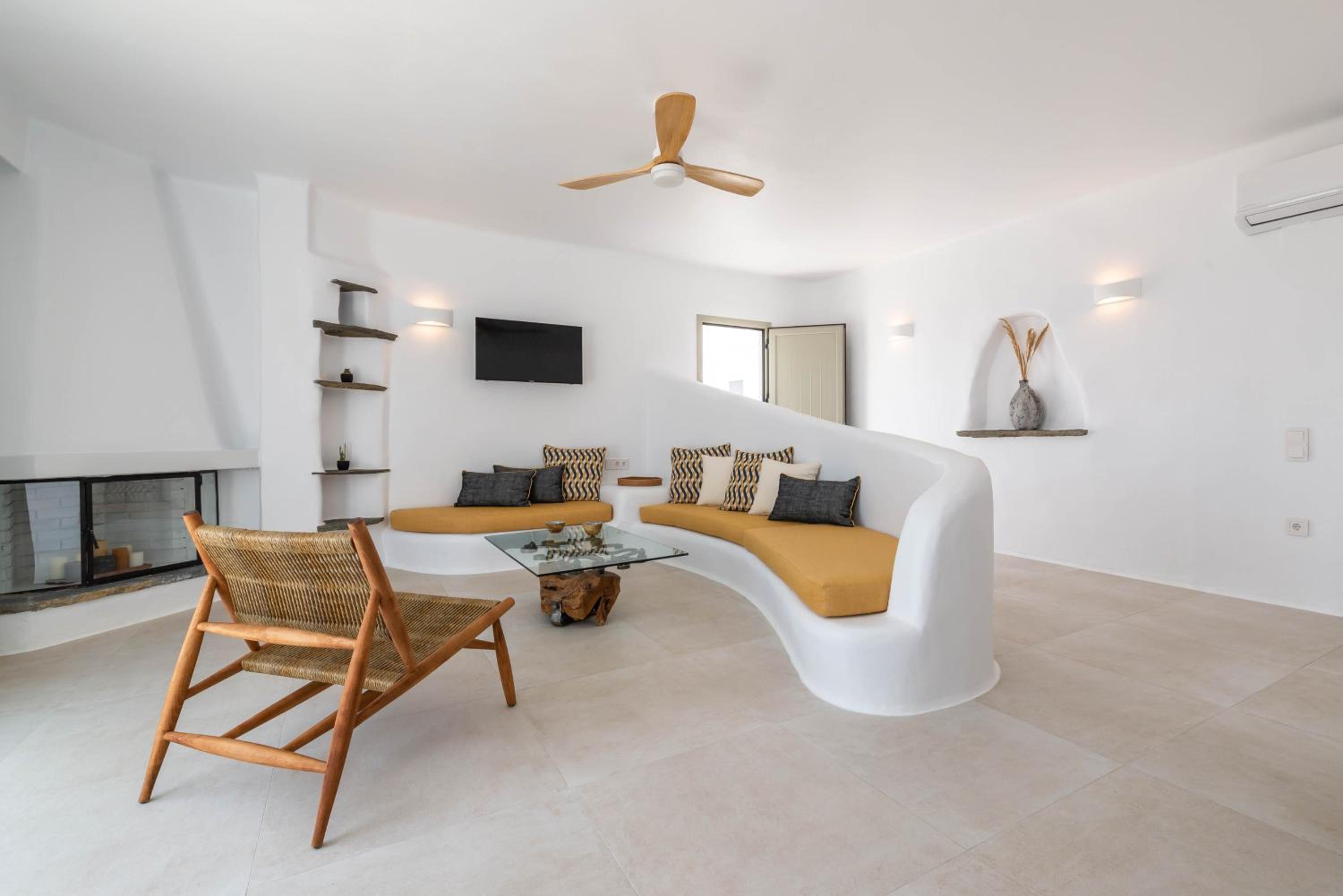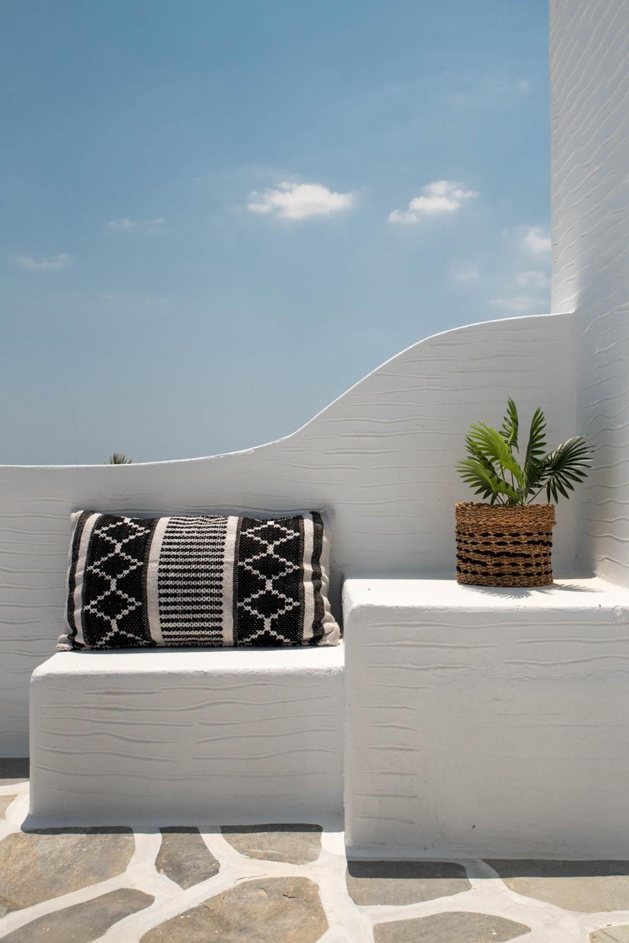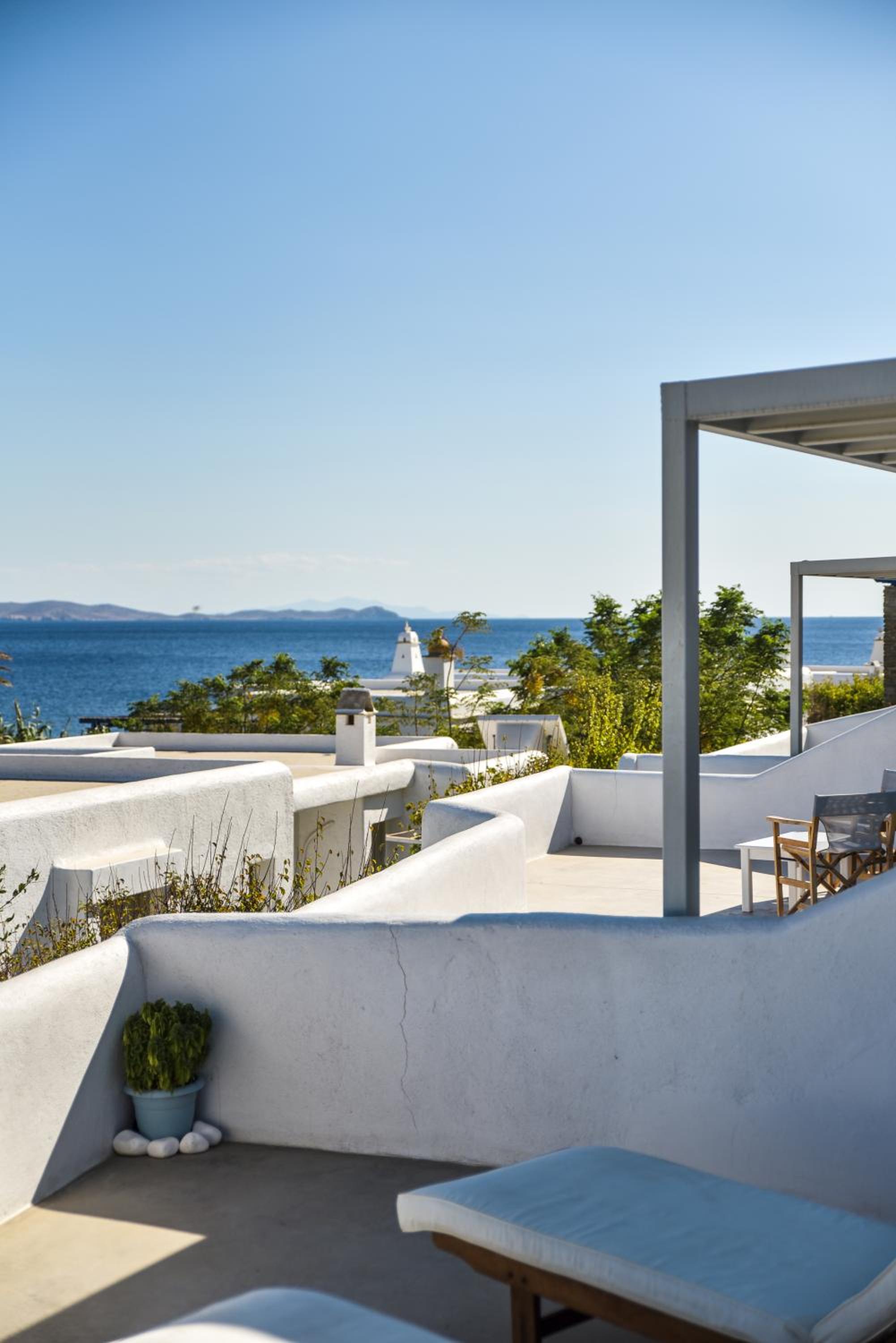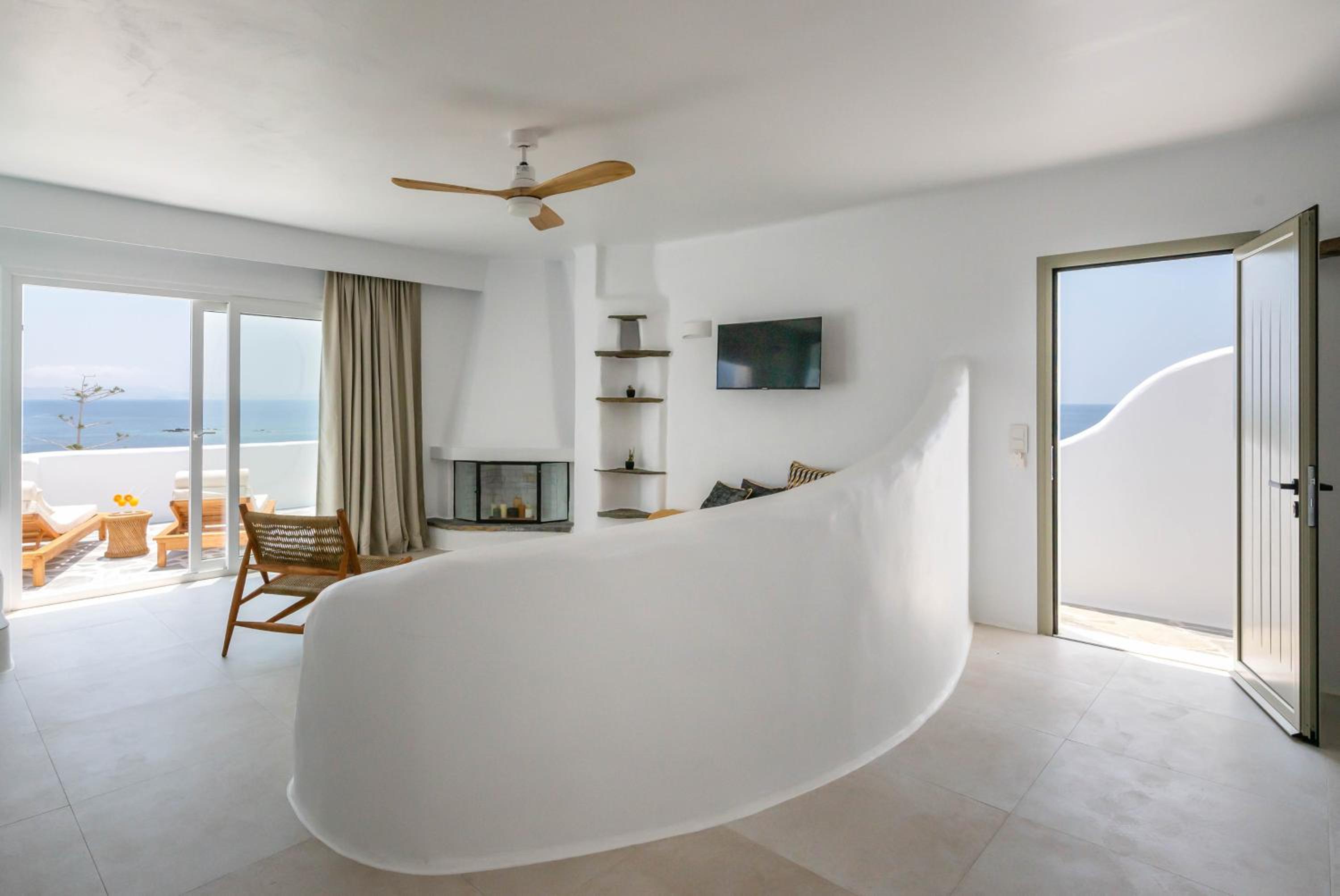 Very comfy beds. Delicious breakfast. Very clean rooms. Charming staff. In the best place in Tinos. Beautiful views. Very clean beach.