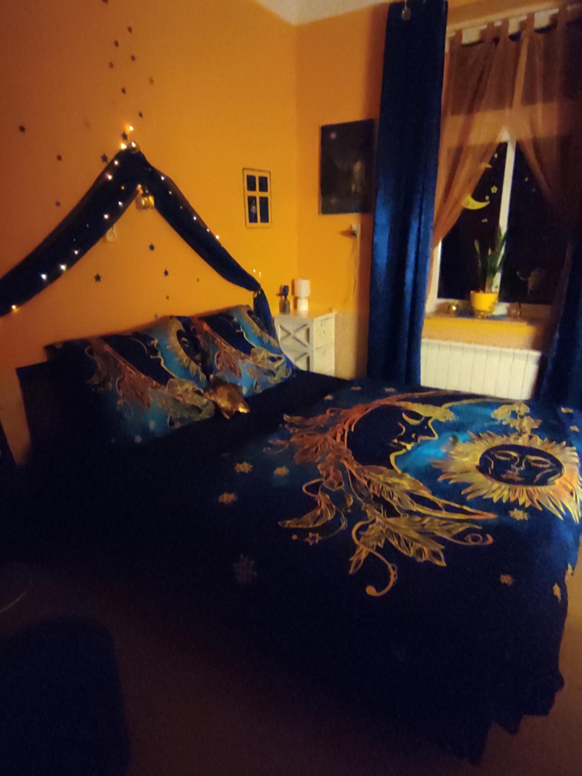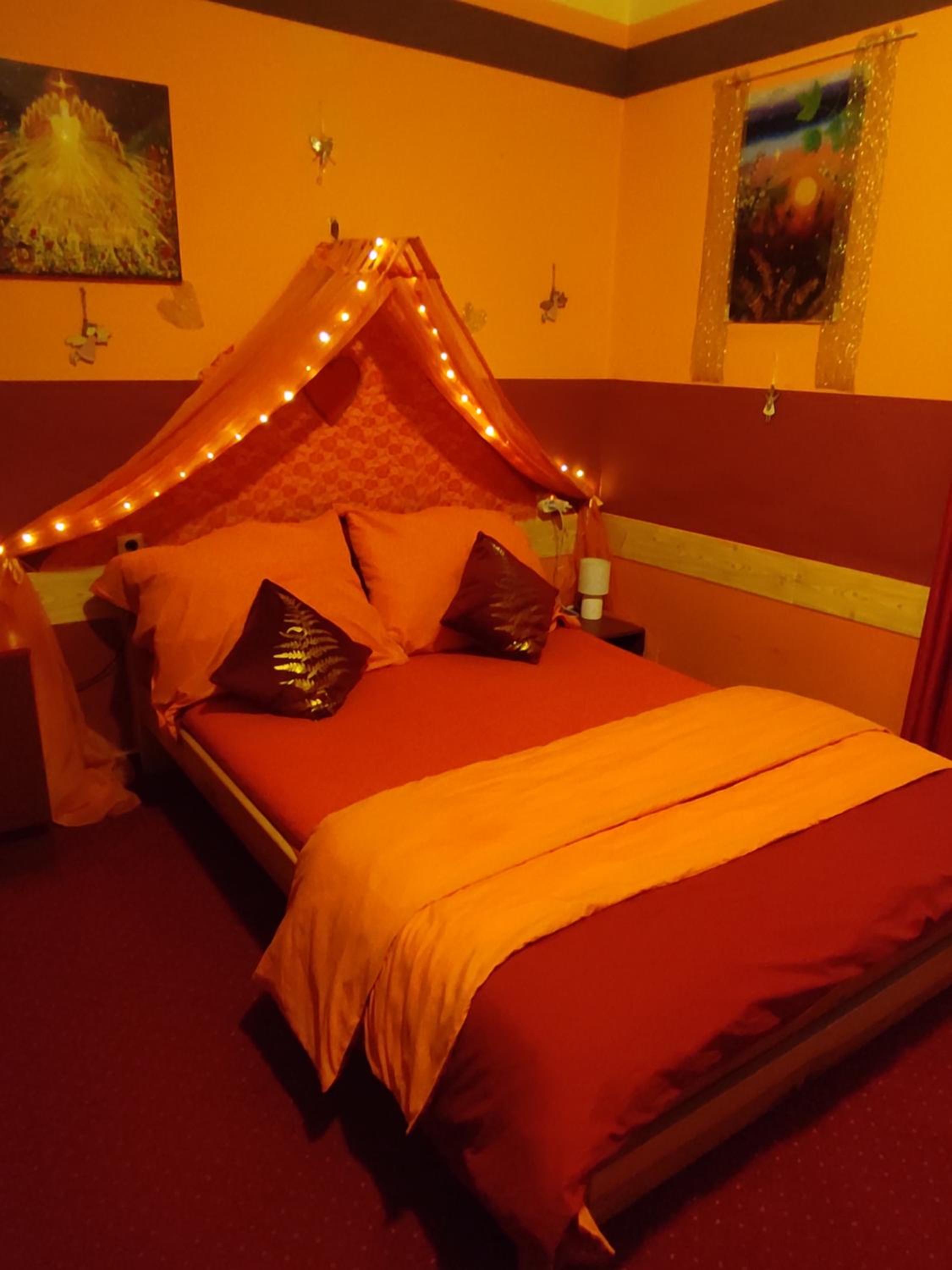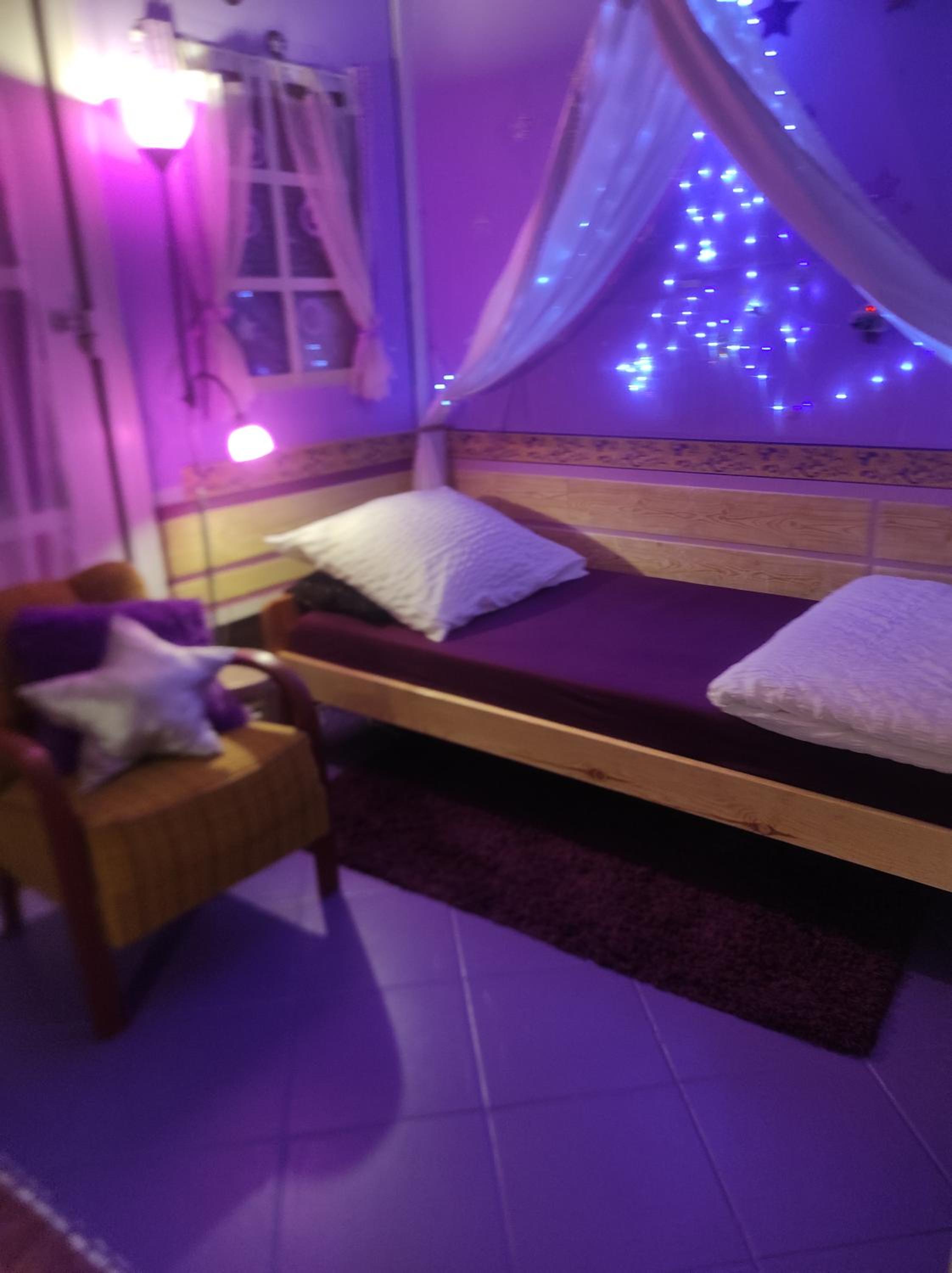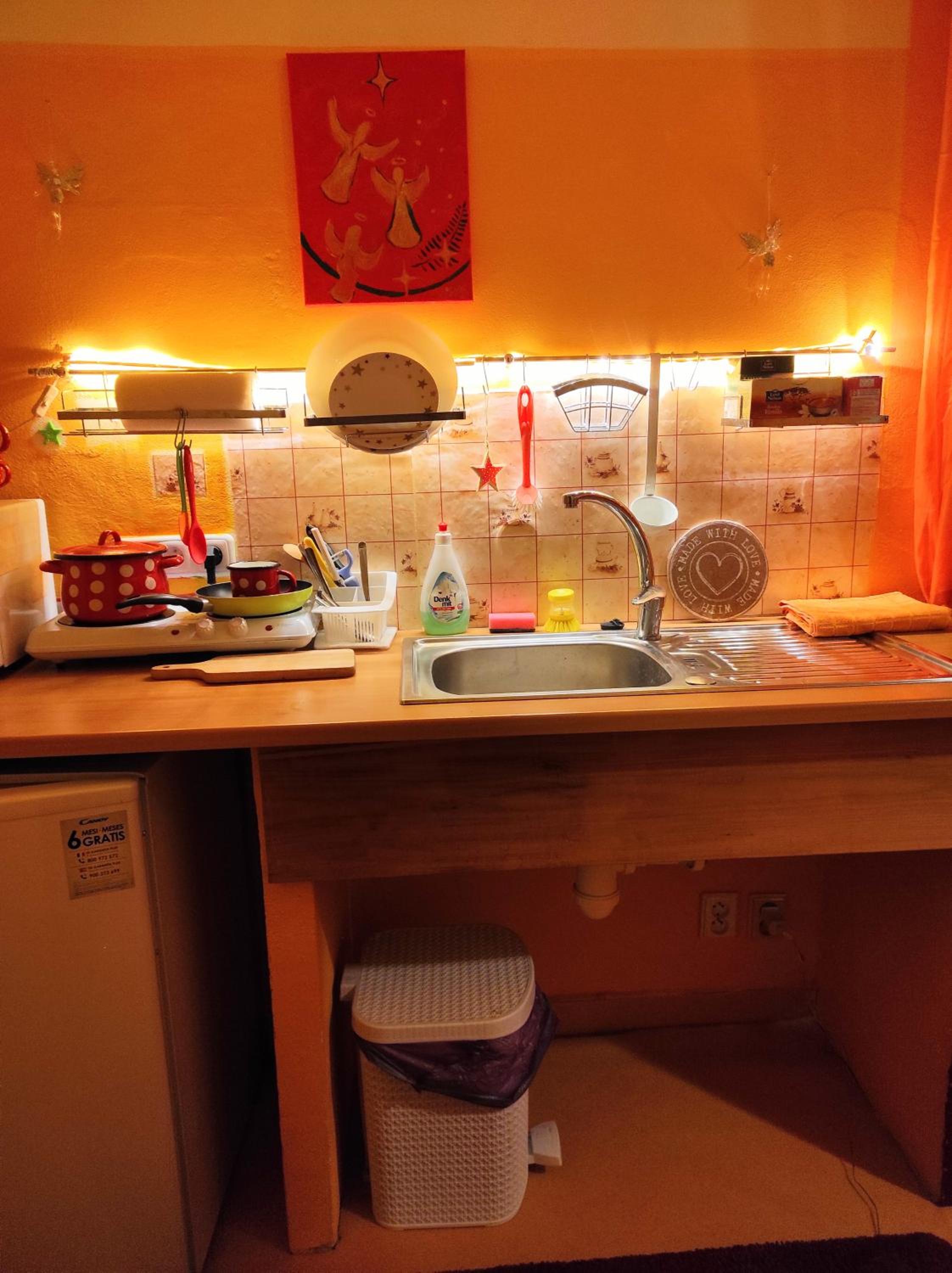 Ich habe gedacht mit meinem Frau wir sind im Liebestempel Buddhismus Viele Lämpchen , Lichterkette überall im Zimmer Sehr Farbe fro ausgestattet die Zimmer kein Kleiderschrank die Küche ist sehr dünne ausgestattet ohne Sieb und keine weitere Kochtöpfen nur die Pfanne und ein Kochtöpfen und ganz wenig Geschirr dazu noch ein ganz kleines Badezimmer mit ein kleines Waschbecken dazu noch der Türrahmen defekt und nicht sicher gefühlt mit in der Nacht um 0:30 Uhr war es eine Rumschauerei die Besitzerin mit einer unbekannte Person keine Rücksichtnahme wenn wir schlafen und das schlimmste ist jetzt über die riecht es nach Duftspray