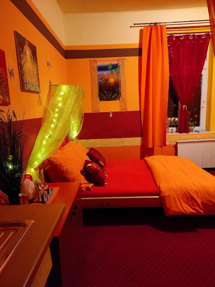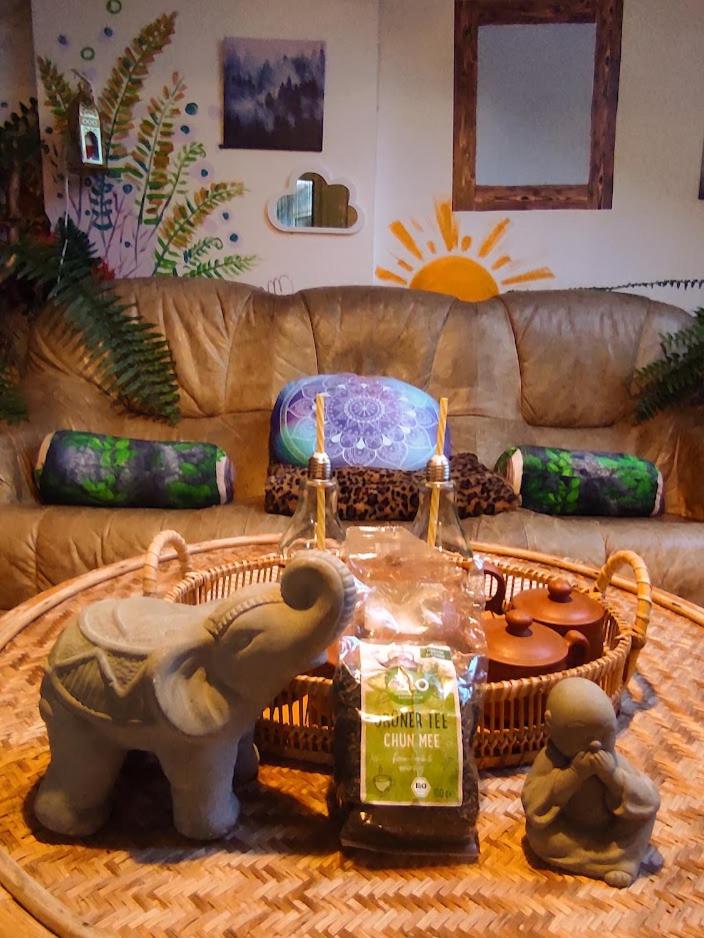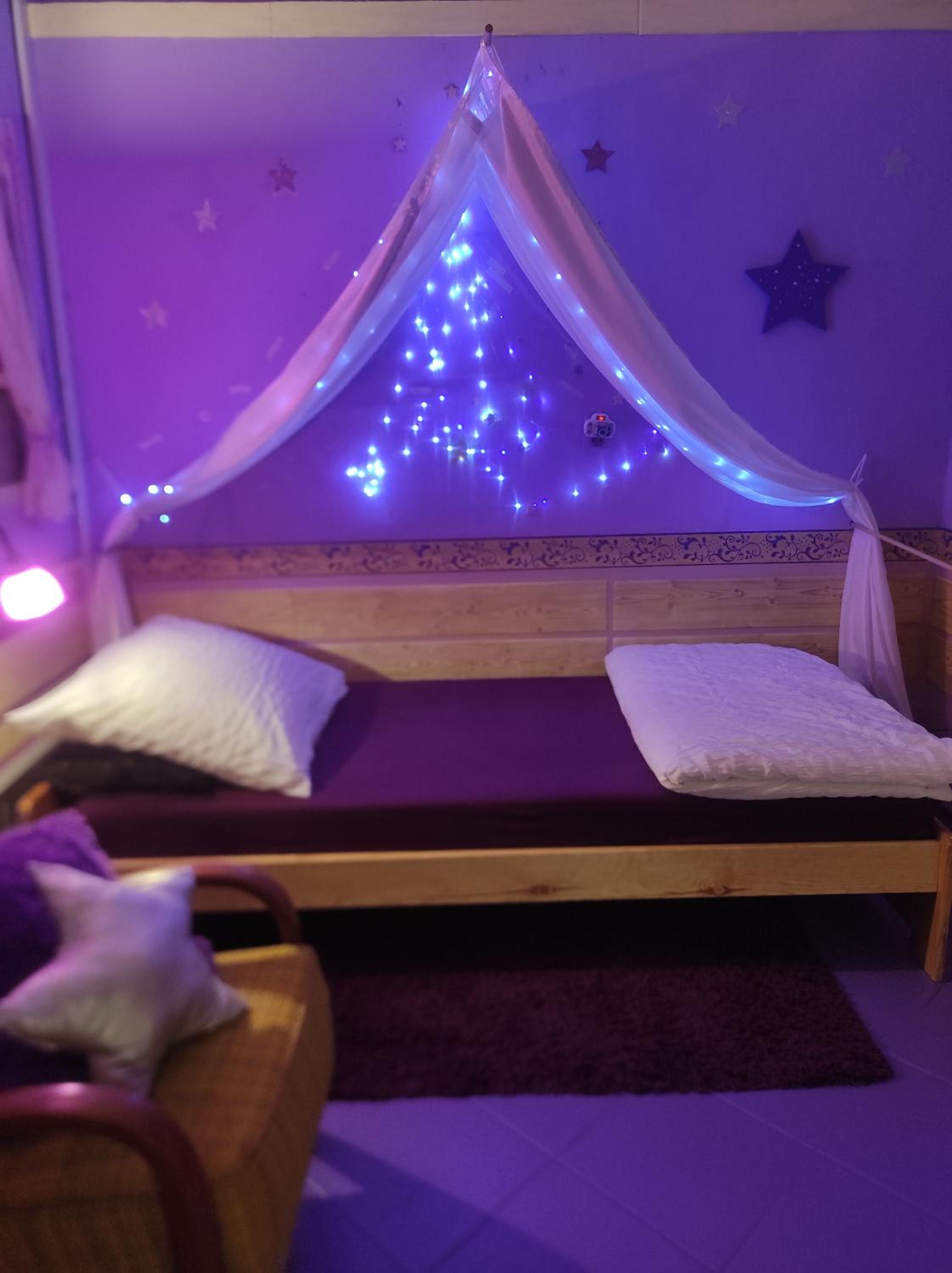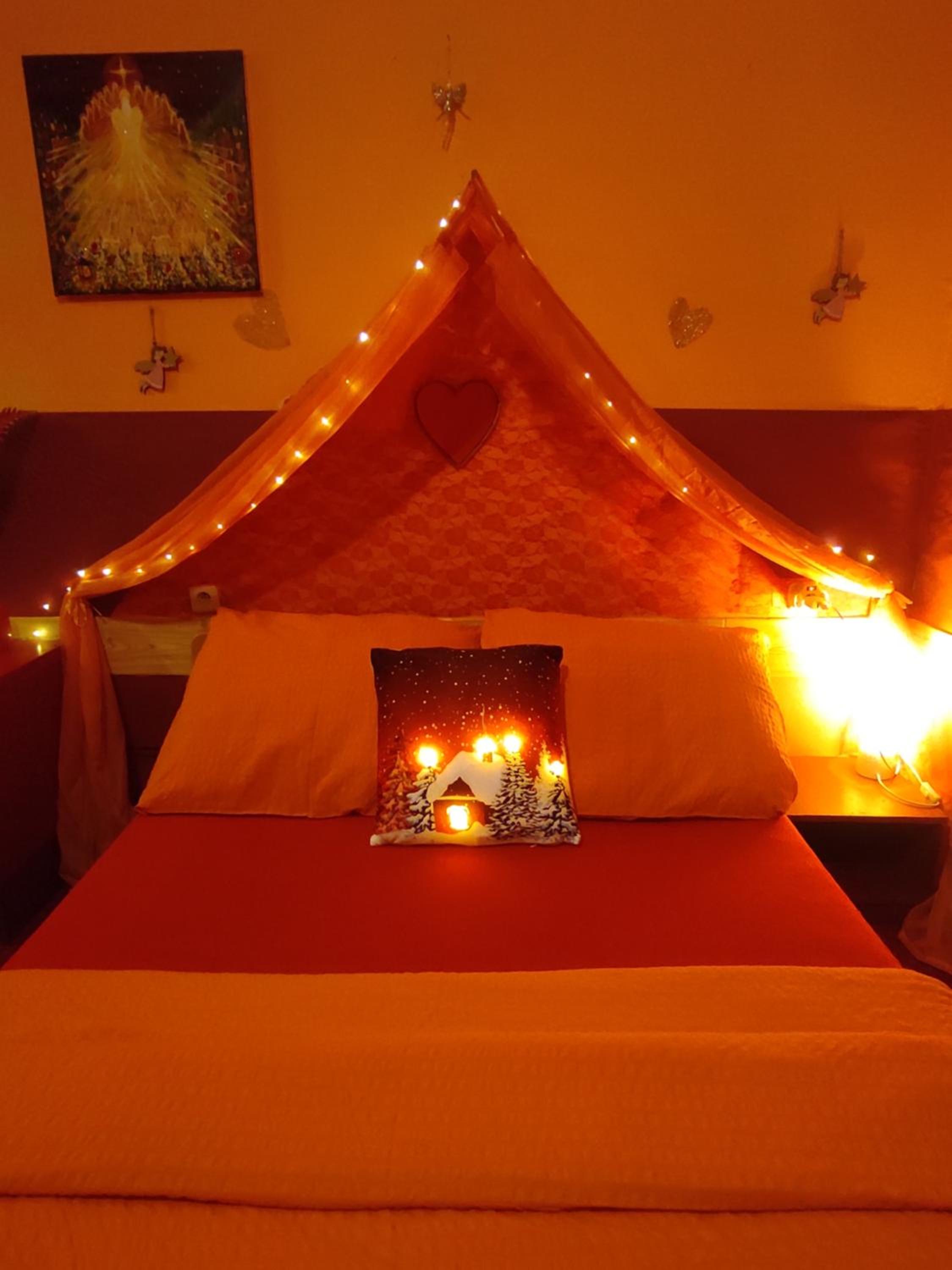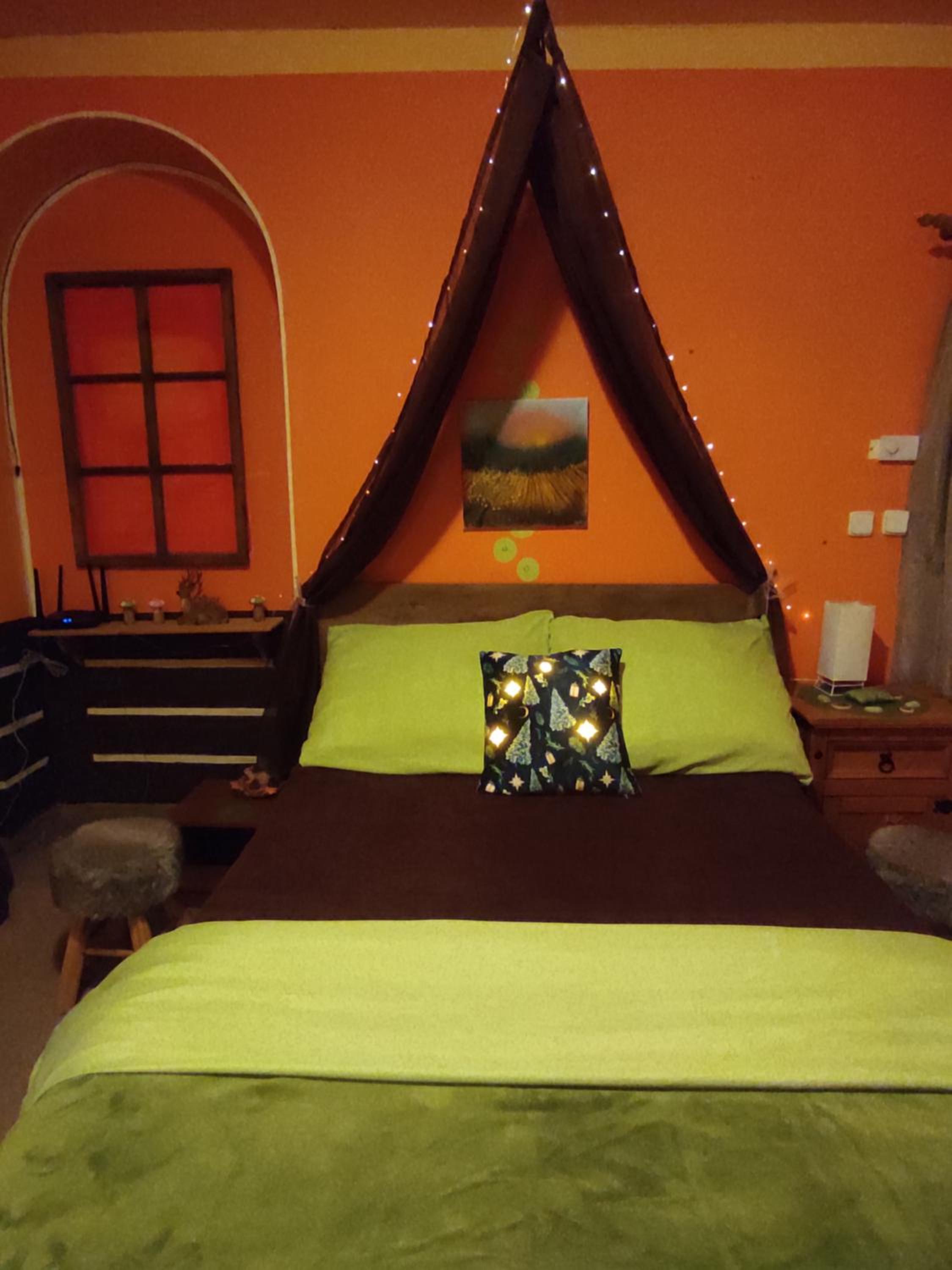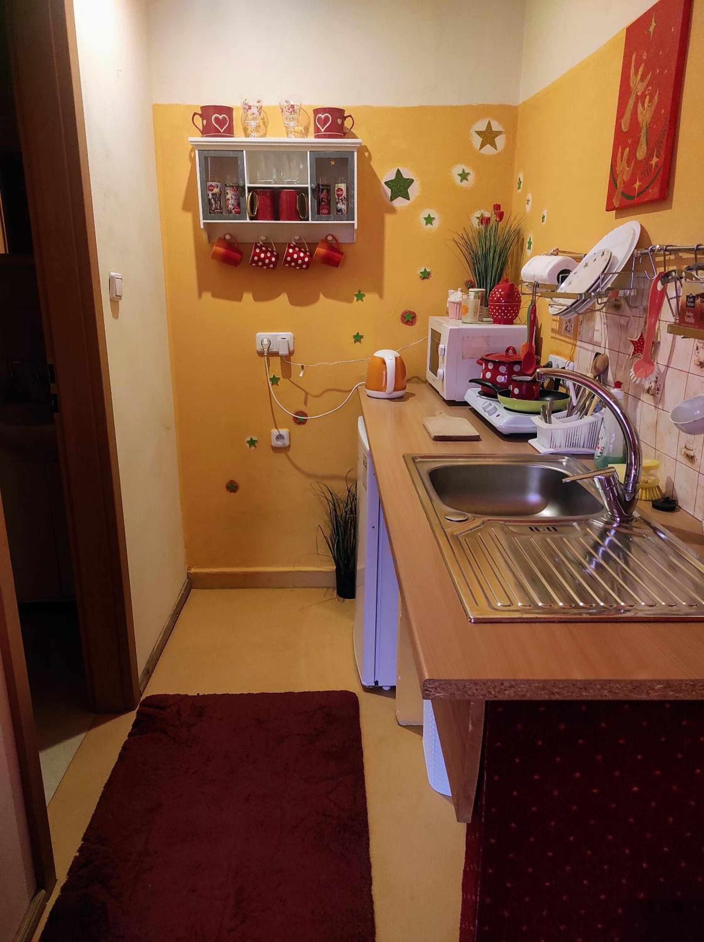 Ich habe gedacht mit meinem Frau wir sind im Liebestempel Buddhismus Viele Lämpchen , Lichterkette überall im Zimmer Sehr Farbe fro ausgestattet die Zimmer kein Kleiderschrank die Küche ist sehr dünne ausgestattet ohne Sieb und keine weitere Kochtöpfen nur die Pfanne und ein Kochtöpfen und ganz wenig Geschirr dazu noch ein ganz kleines Badezimmer mit ein kleines Waschbecken dazu noch der Türrahmen defekt und nicht sicher gefühlt mit in der Nacht um 0:30 Uhr war es eine Rumschauerei die Besitzerin mit einer unbekannte Person keine Rücksichtnahme wenn wir schlafen und das schlimmste ist jetzt über die riecht es nach Duftspray