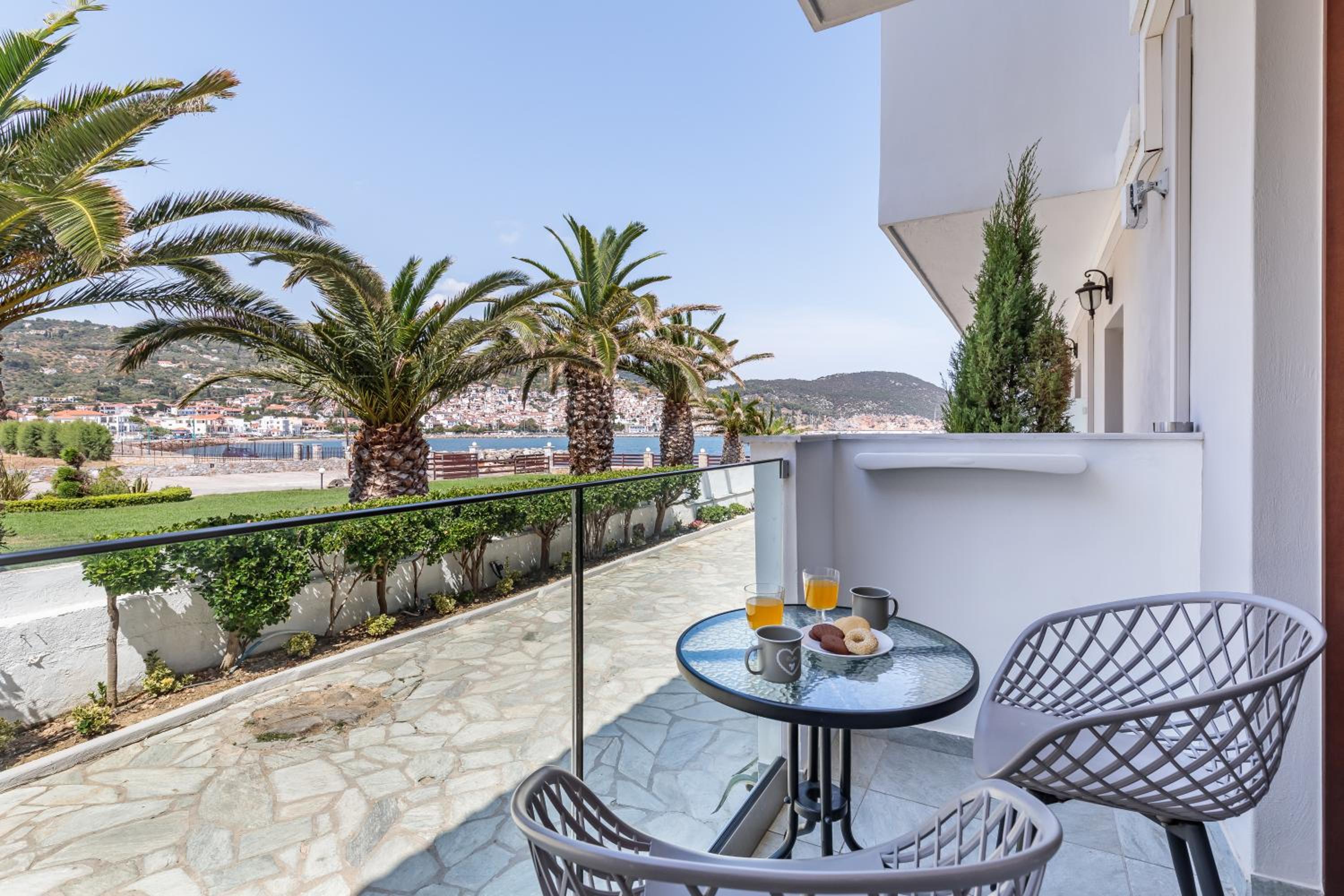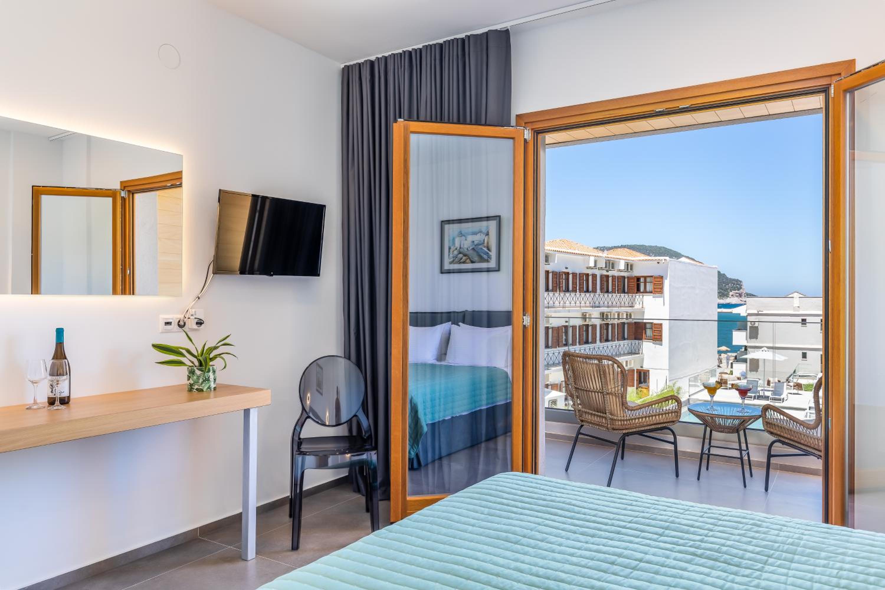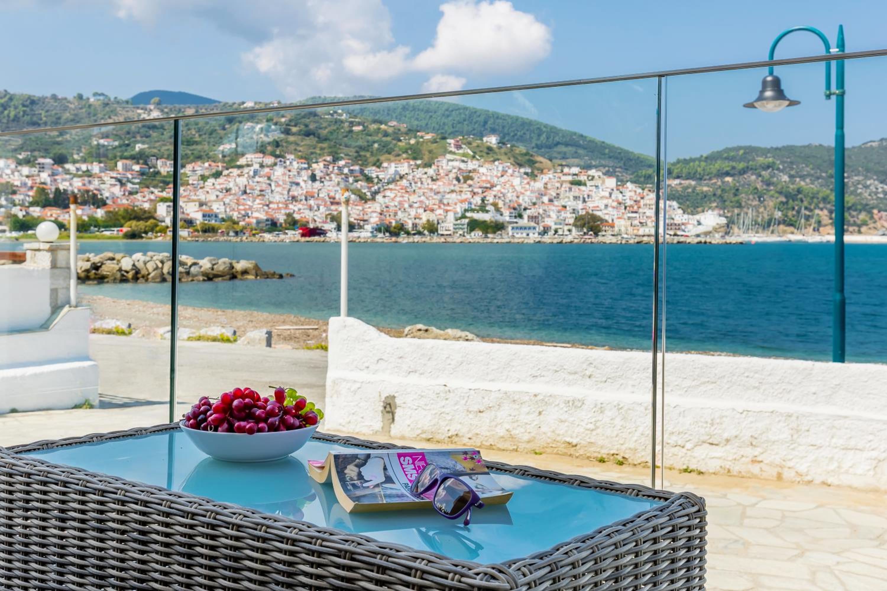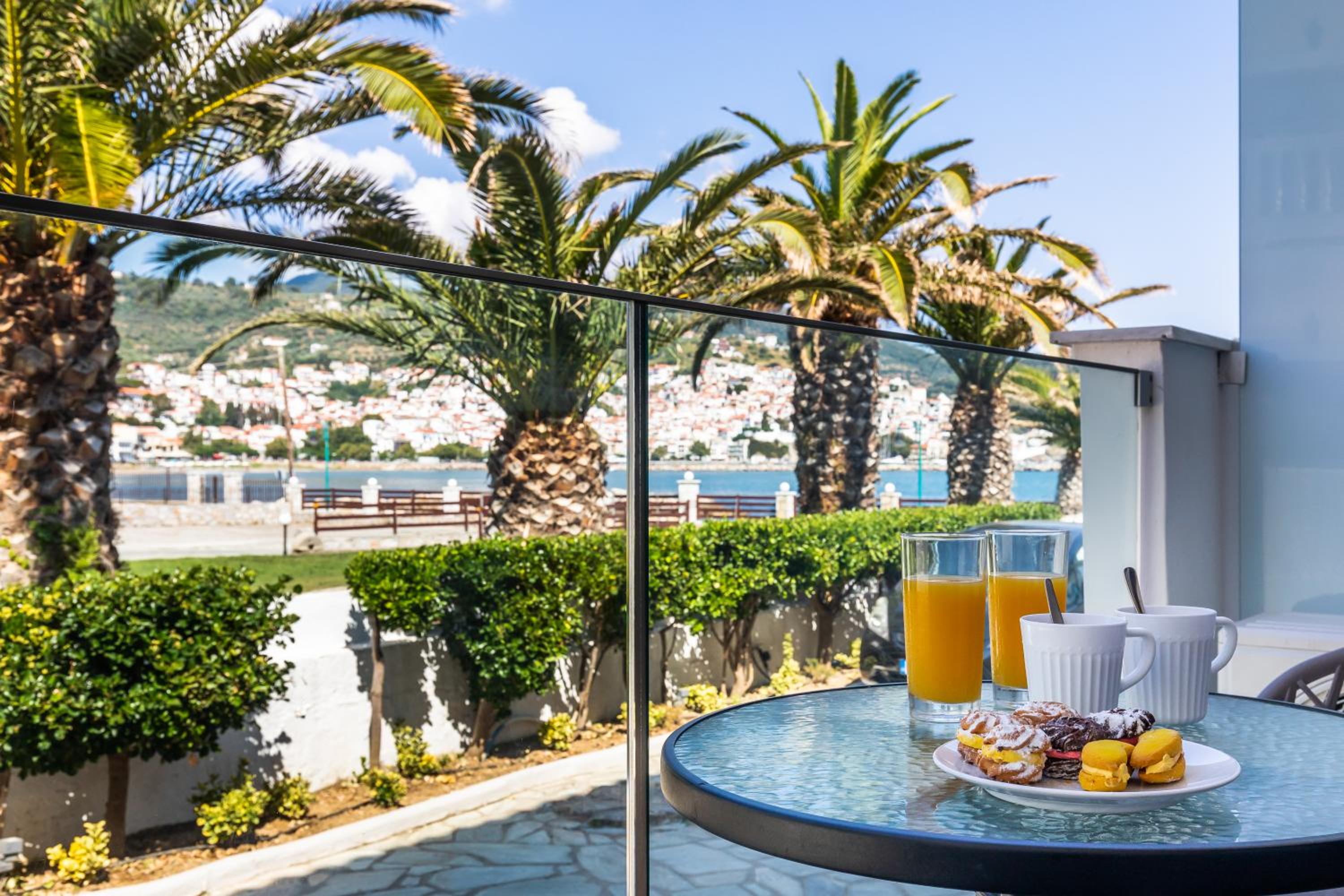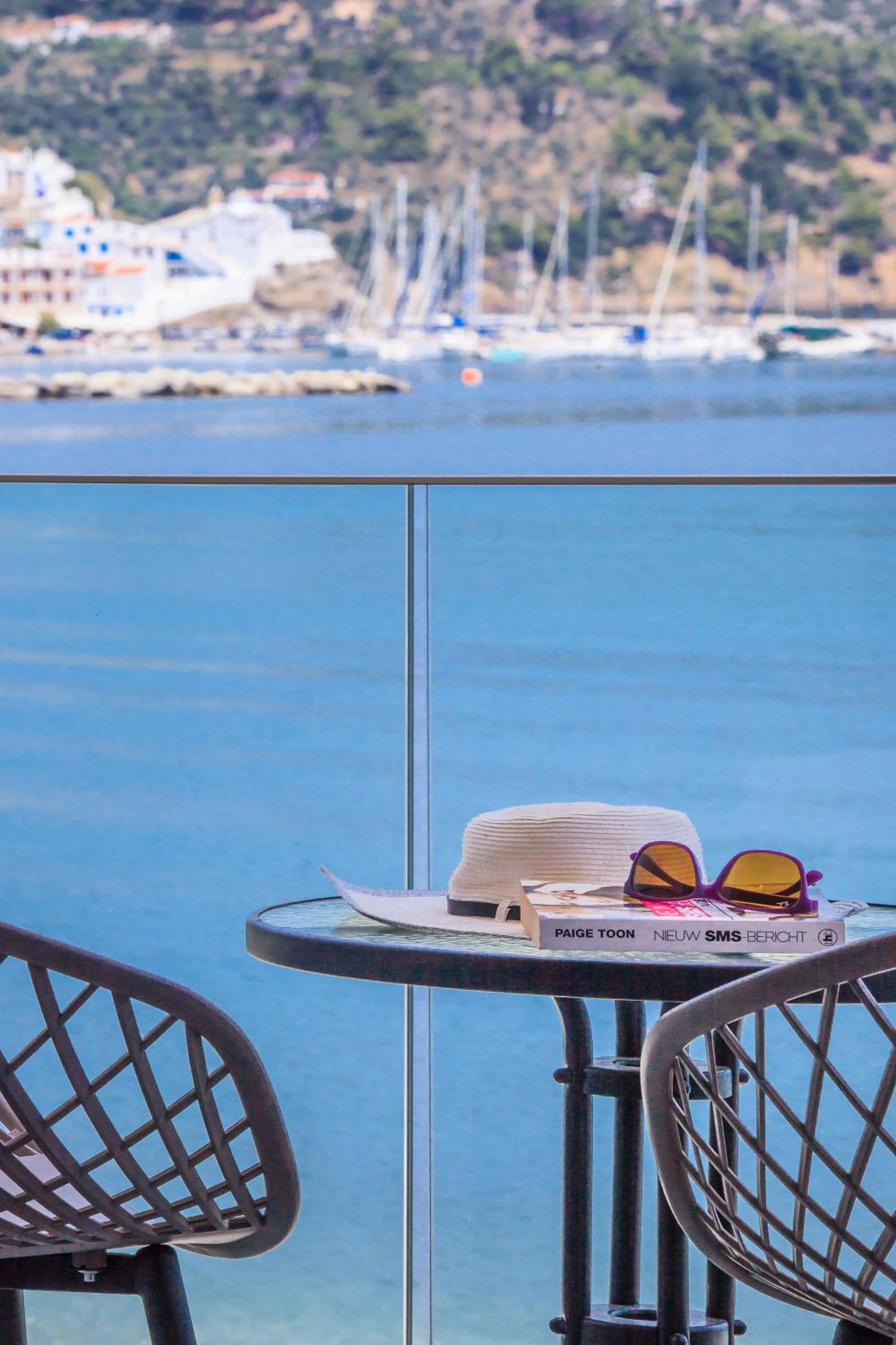 Prachtig zicht op de zee en Skopelos stad vanuit ons terras van kamer 102. Zeer verzorgd ontbijt buiten naast het zwembad in de schaduw. Zeer vriendelijk personeel met een super uitleg over de troeven van het mooie eiland Skopelos.